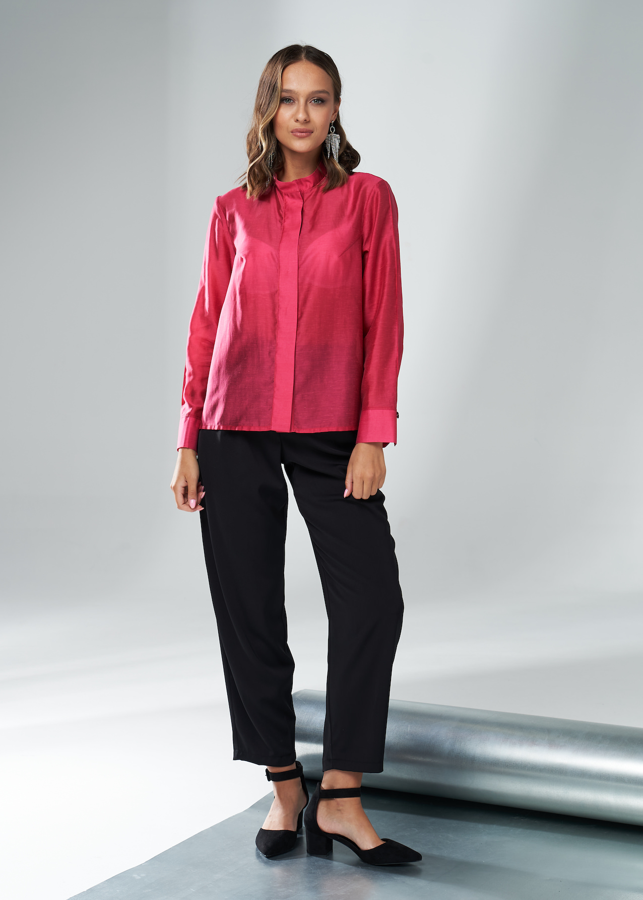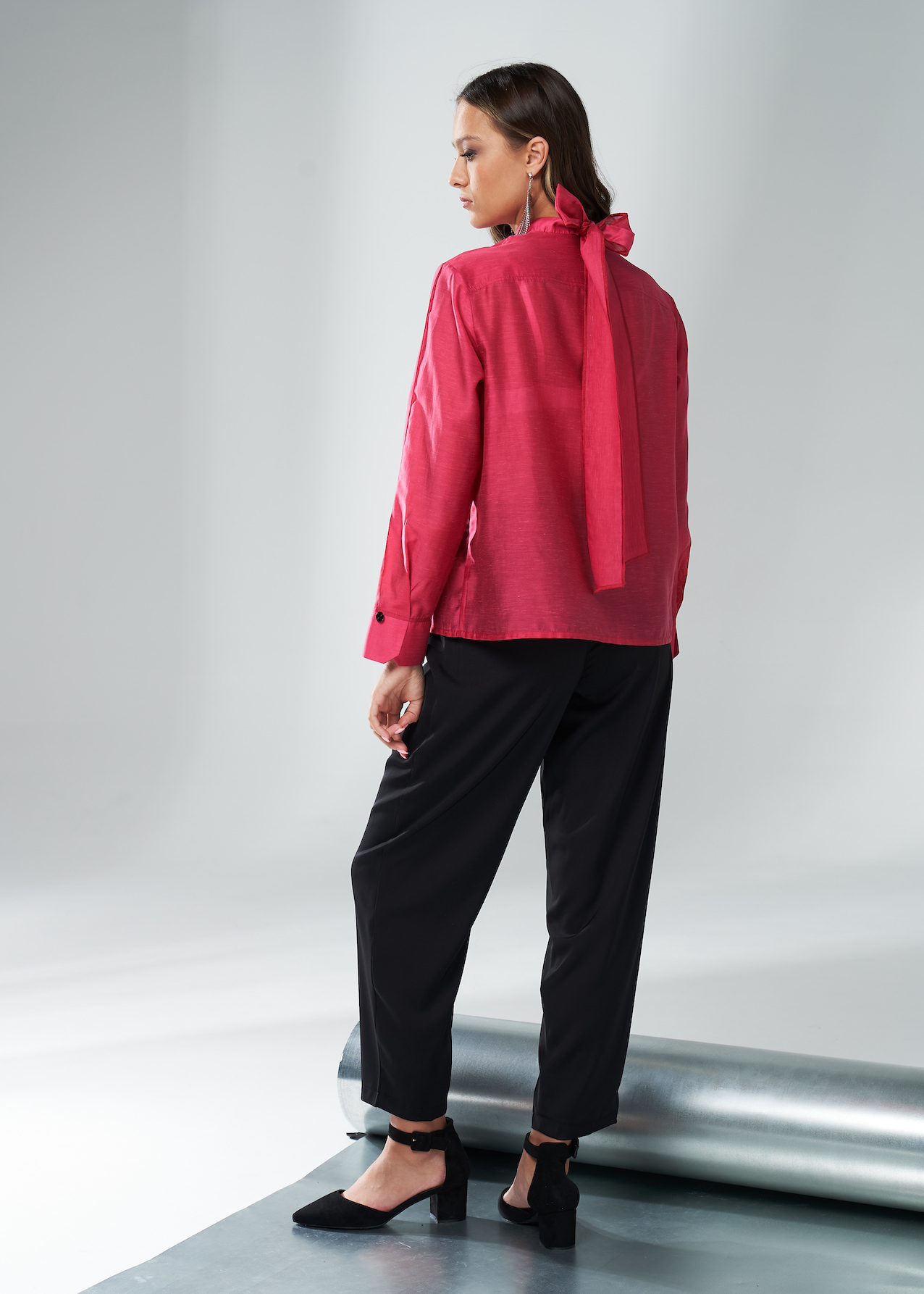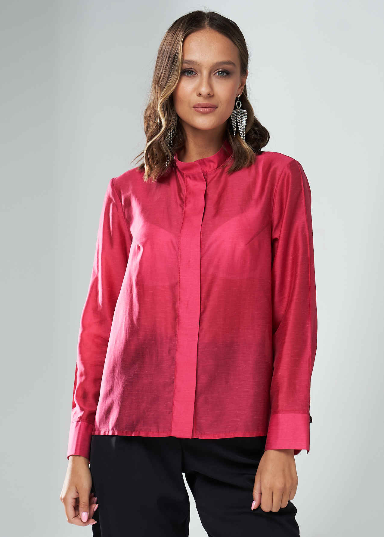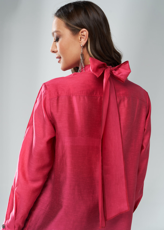 Розовая полупрозрачная женская блузка с бантом из переливчатой смесовой вискозы с шелком. Прямым крой, воротник-стойка и длинные рукава с широкими манжетами на пуговицах. Модель с застежкой на пуговицы, скрытые под планку. Сзади воротник украшен съемной длинной лентой, которую можно завязать как бант спереди или сзади. Также ленту можно носить как шарф или пояс.