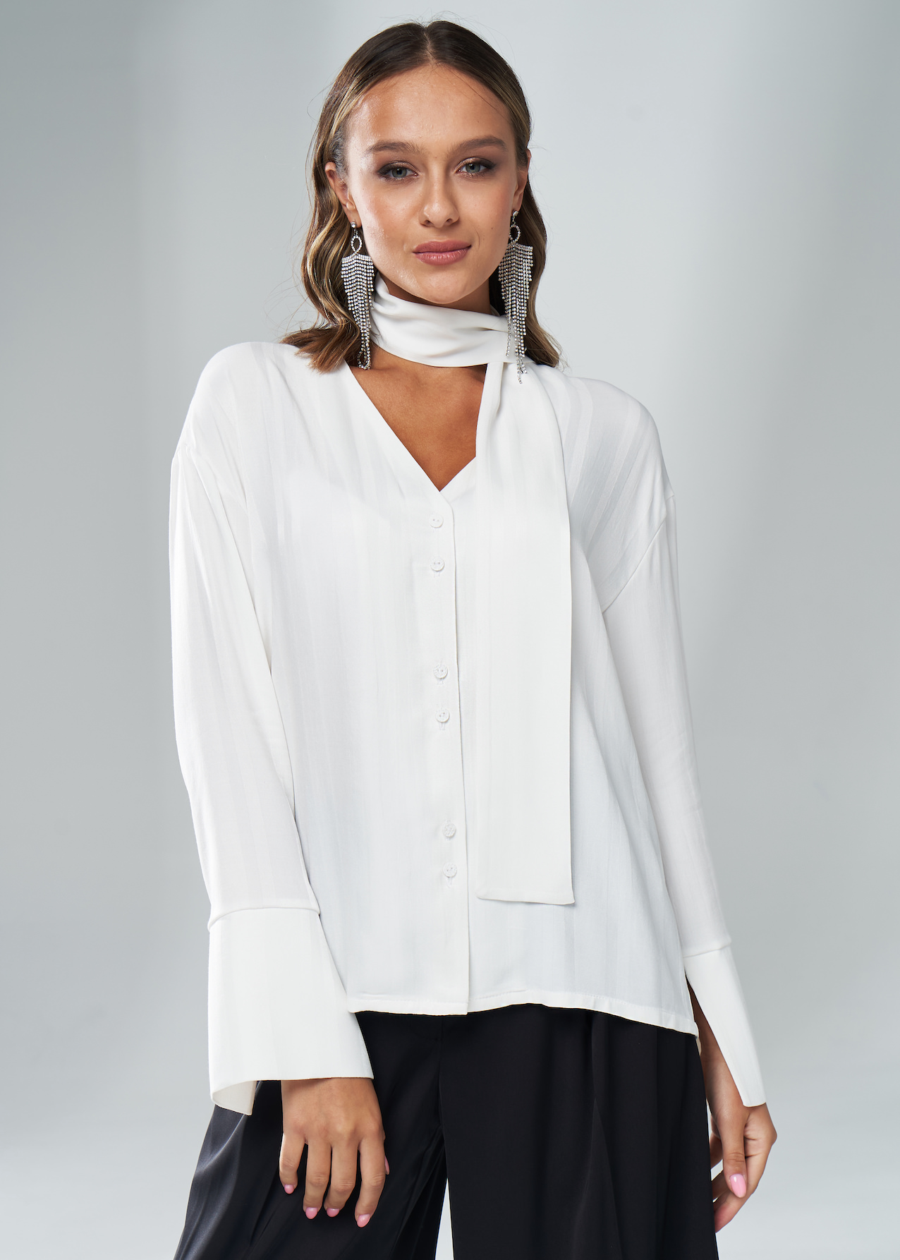 Белая блузка женская из тенсела с выделкой в полоску. Модель на пуговицах, прямого кроя с v-образной горловиной. Длинные спущенные рукава с широкими распахивающимися манжетами. На манжете вшит медальон с фирменным знаком стрекозы. В комплекте идет длинный шарф-лента, который можно повязать на шее или носить как пояс.