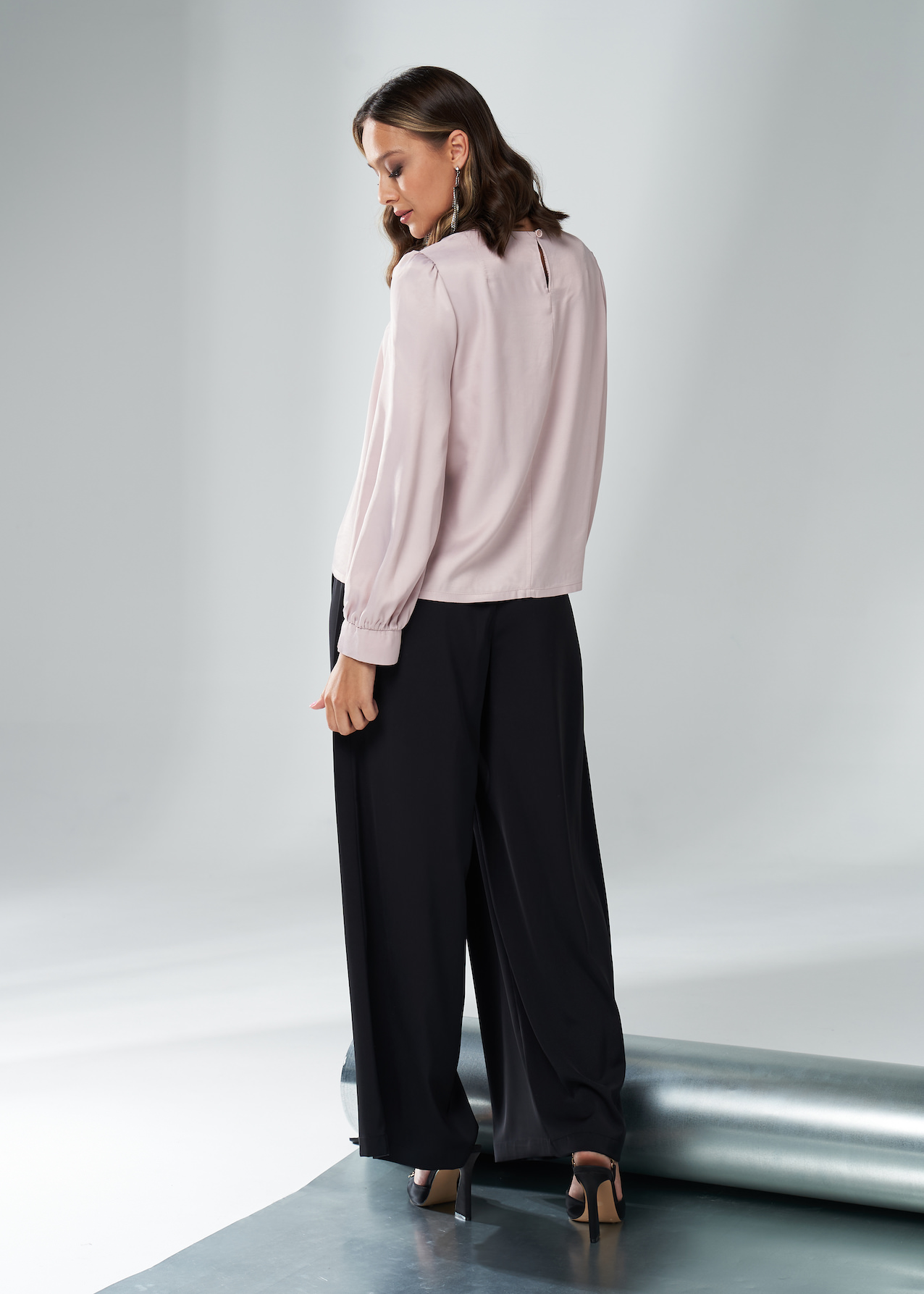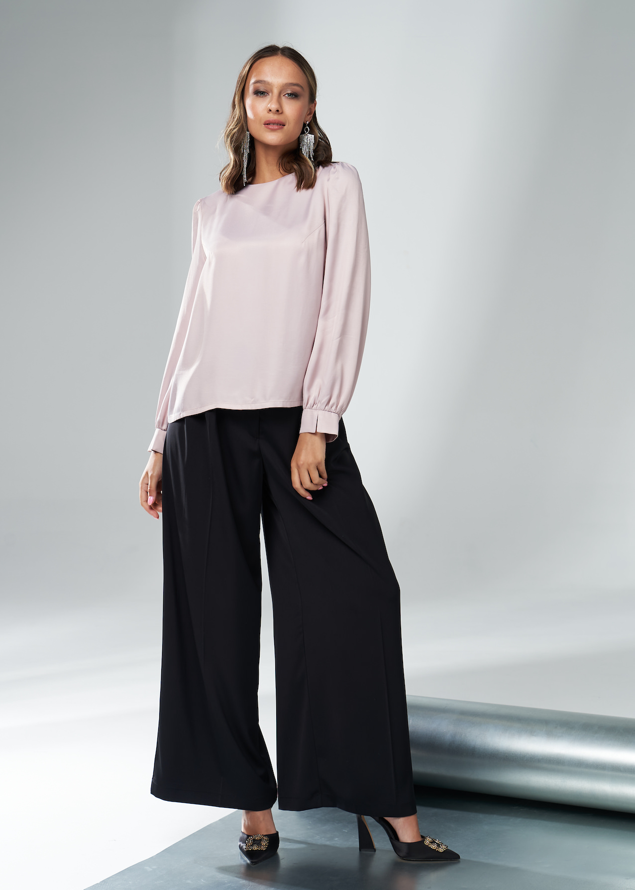Блузка женская однотонная из переливчатого тенсела нежно-розового цвета. Круглая горловина, прямой крой. Длинные рукава присборены на плече, внизу манжеты с разрезами. Сзади застежка на пуговицу.