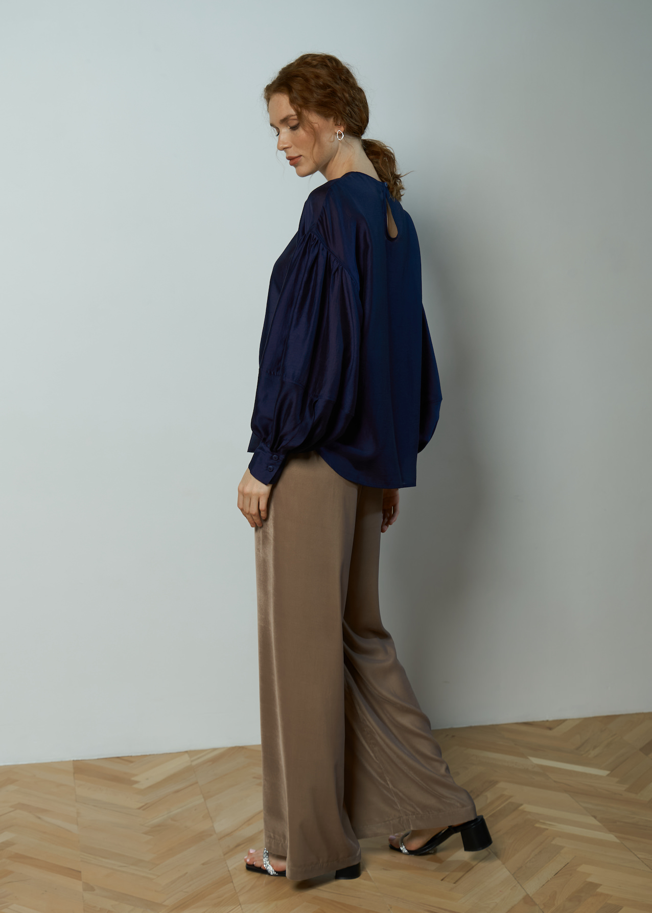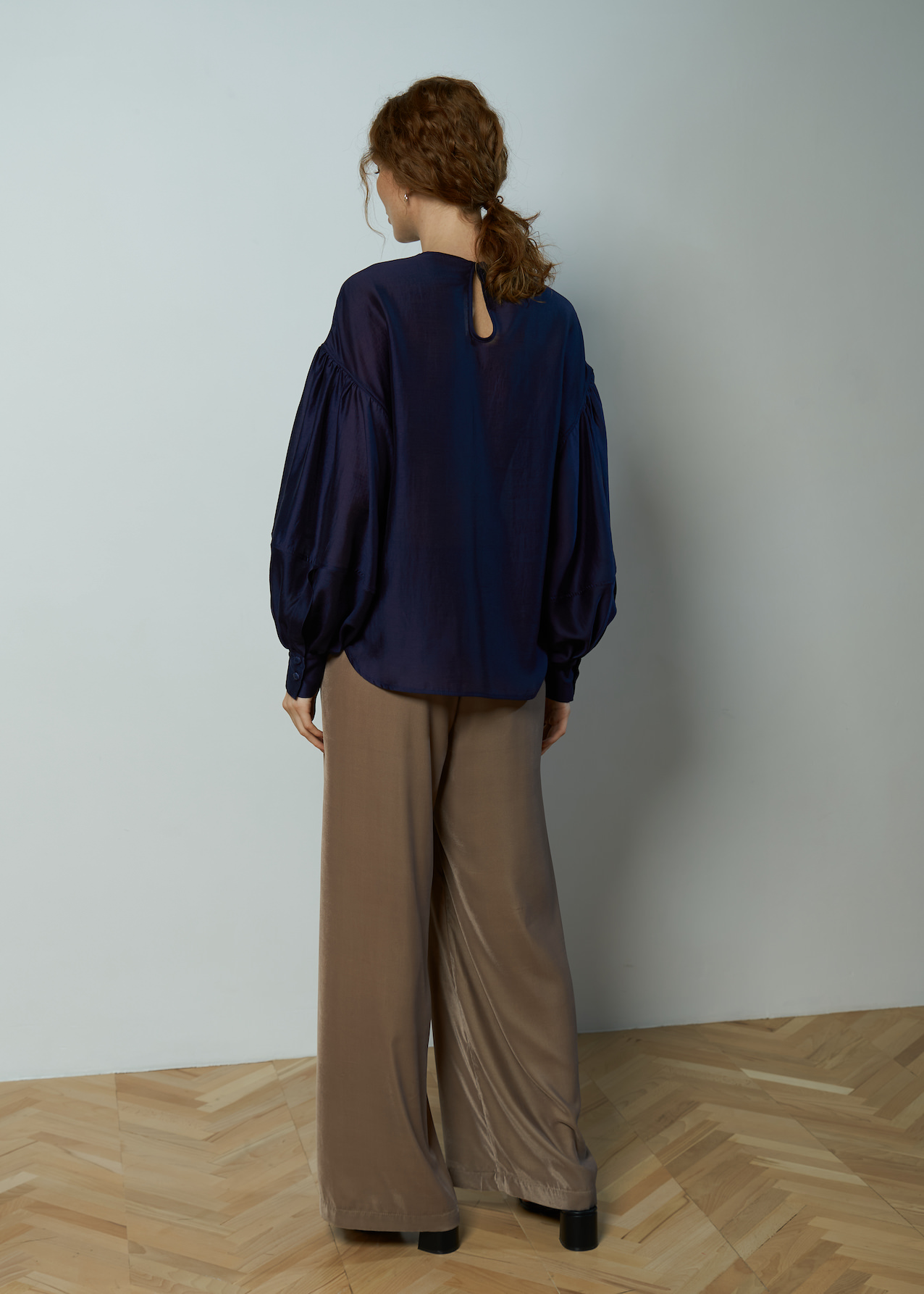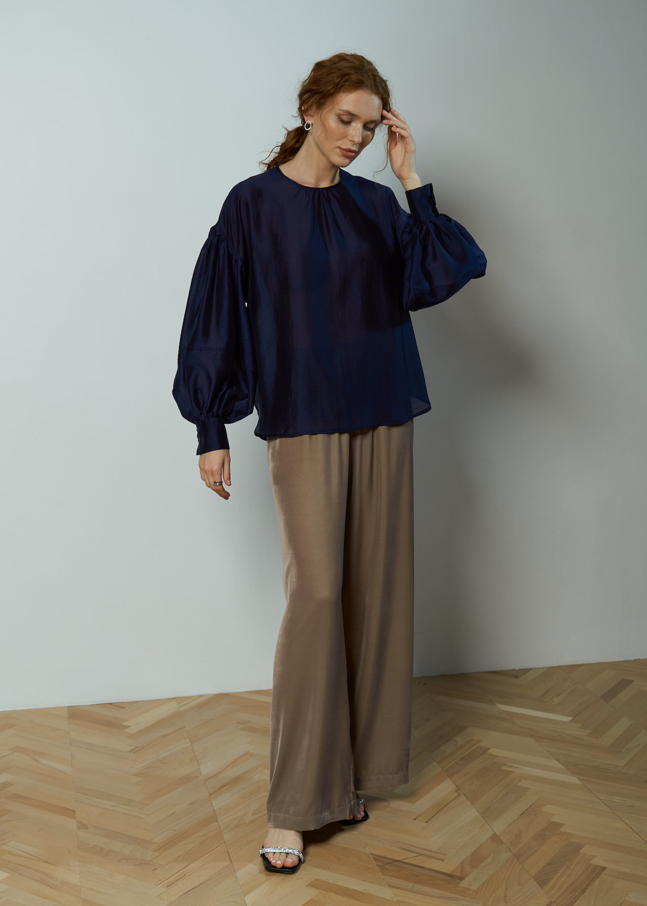 Блузка синяя с акцентными рукавами фонариками, рукав полной длины с манжетами. Воздушная полупрозрачная модель прямого кроя. Круглый вырез с застежкой на спине.