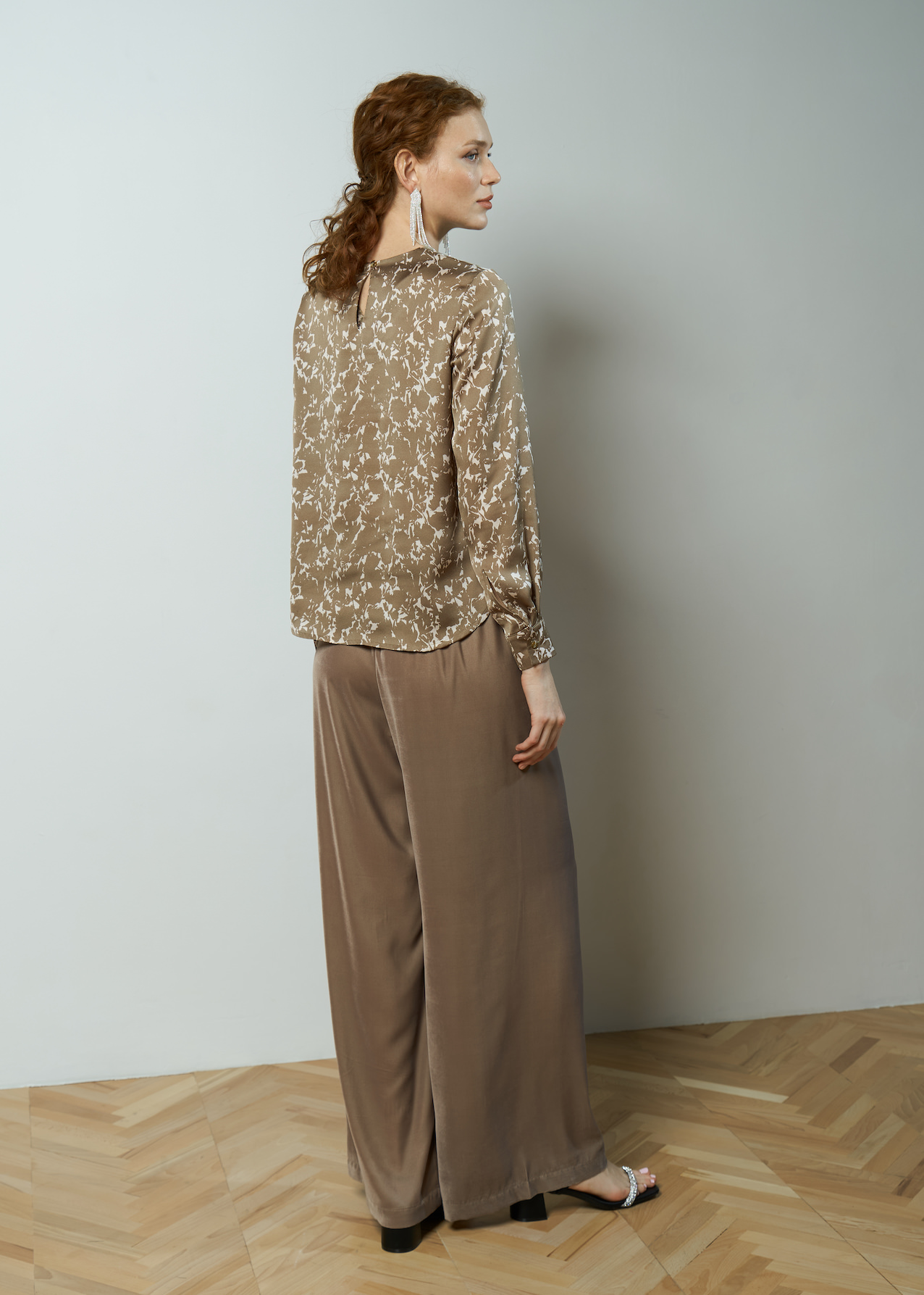 Блузка бежевая с принтом, рукав полной длины на манжете. Модель прямого кроя и круглым вырезом с застежкой на спине.
