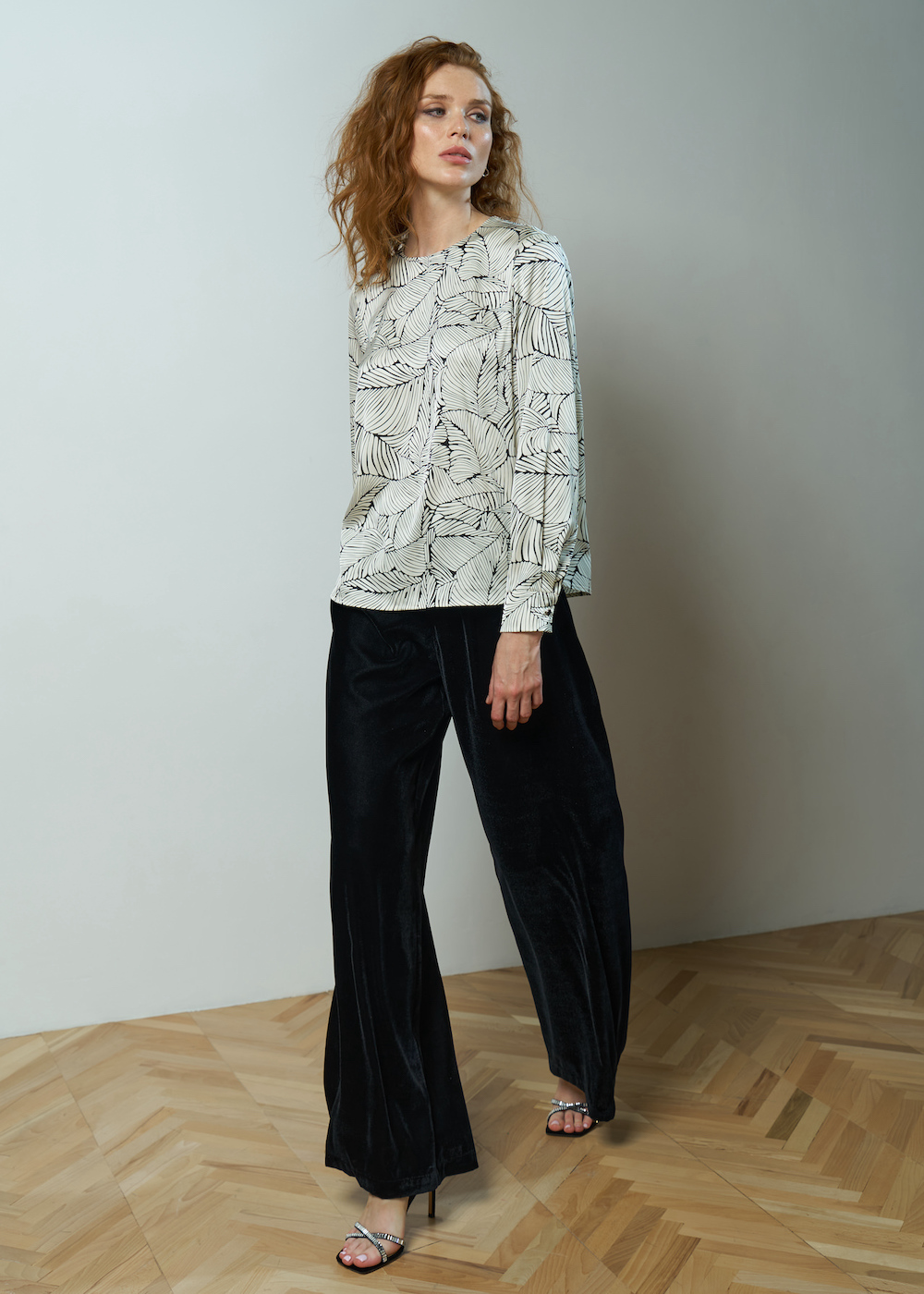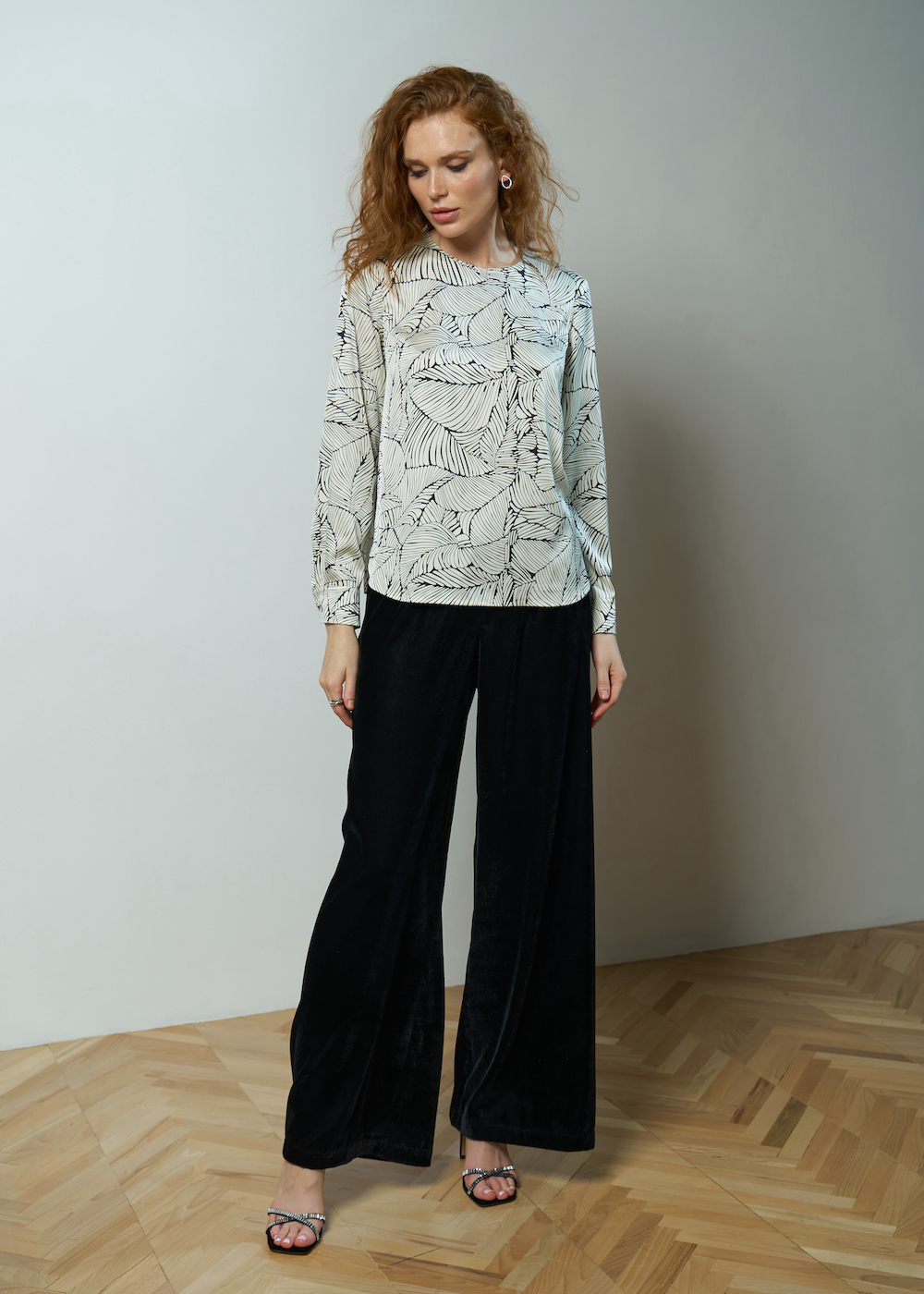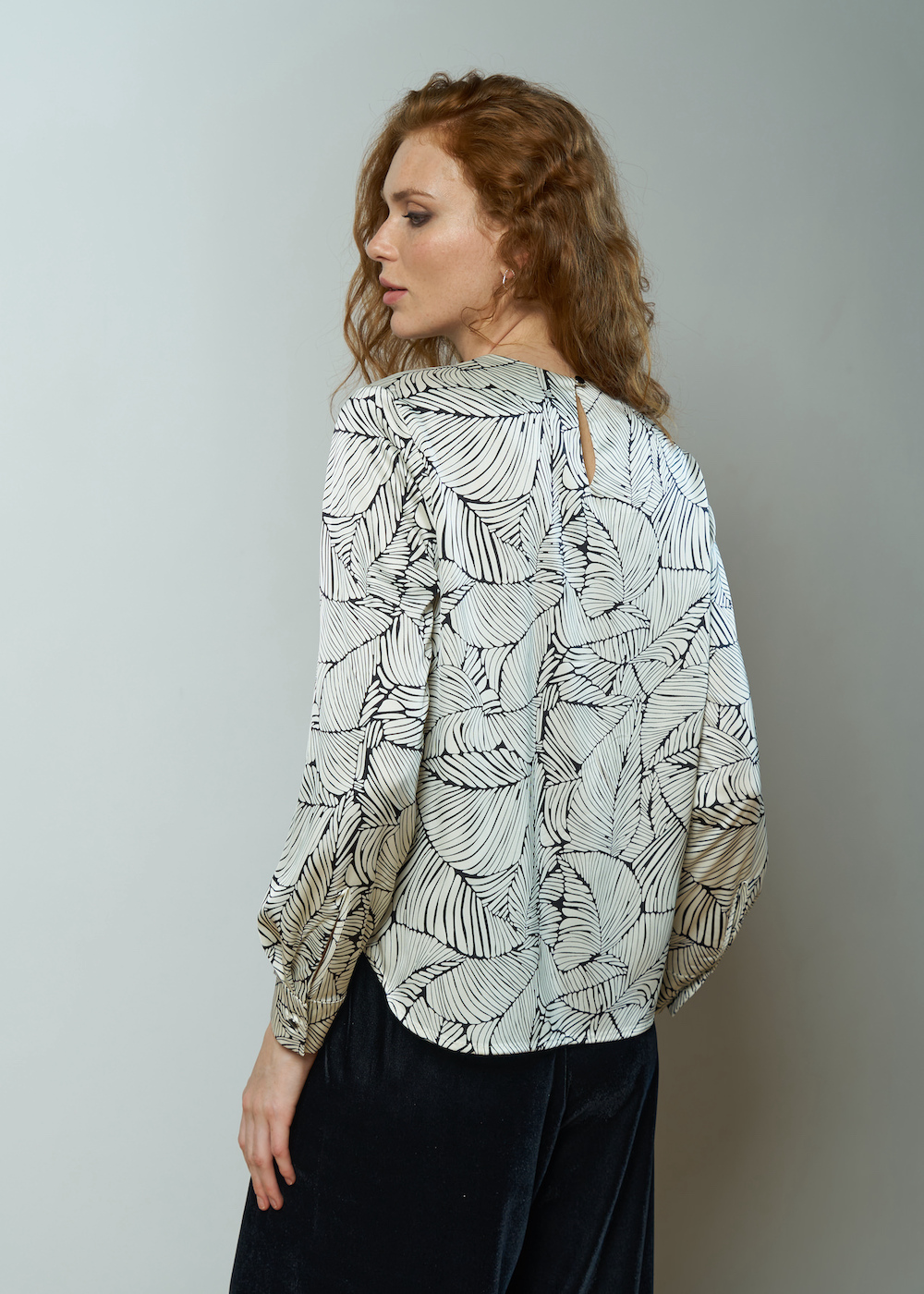 Блузка атласная с принтом, рукав полной длины на манжете. Модель свободного кроя и круглым вырезом с застежкой на спине.
