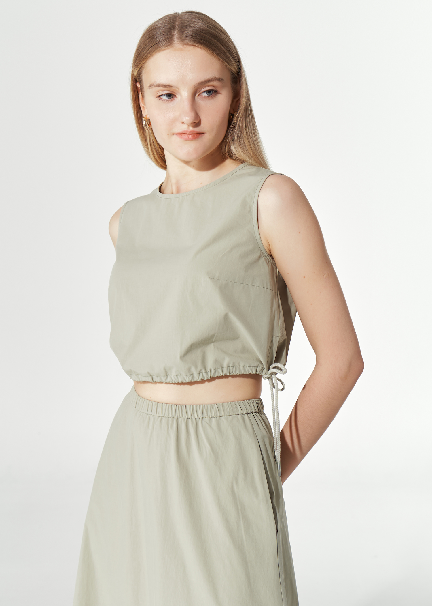 Топ укороченный оливковый на кулиске снизу. Хлопковая модель без рукавов с круглым воротом без застежки.