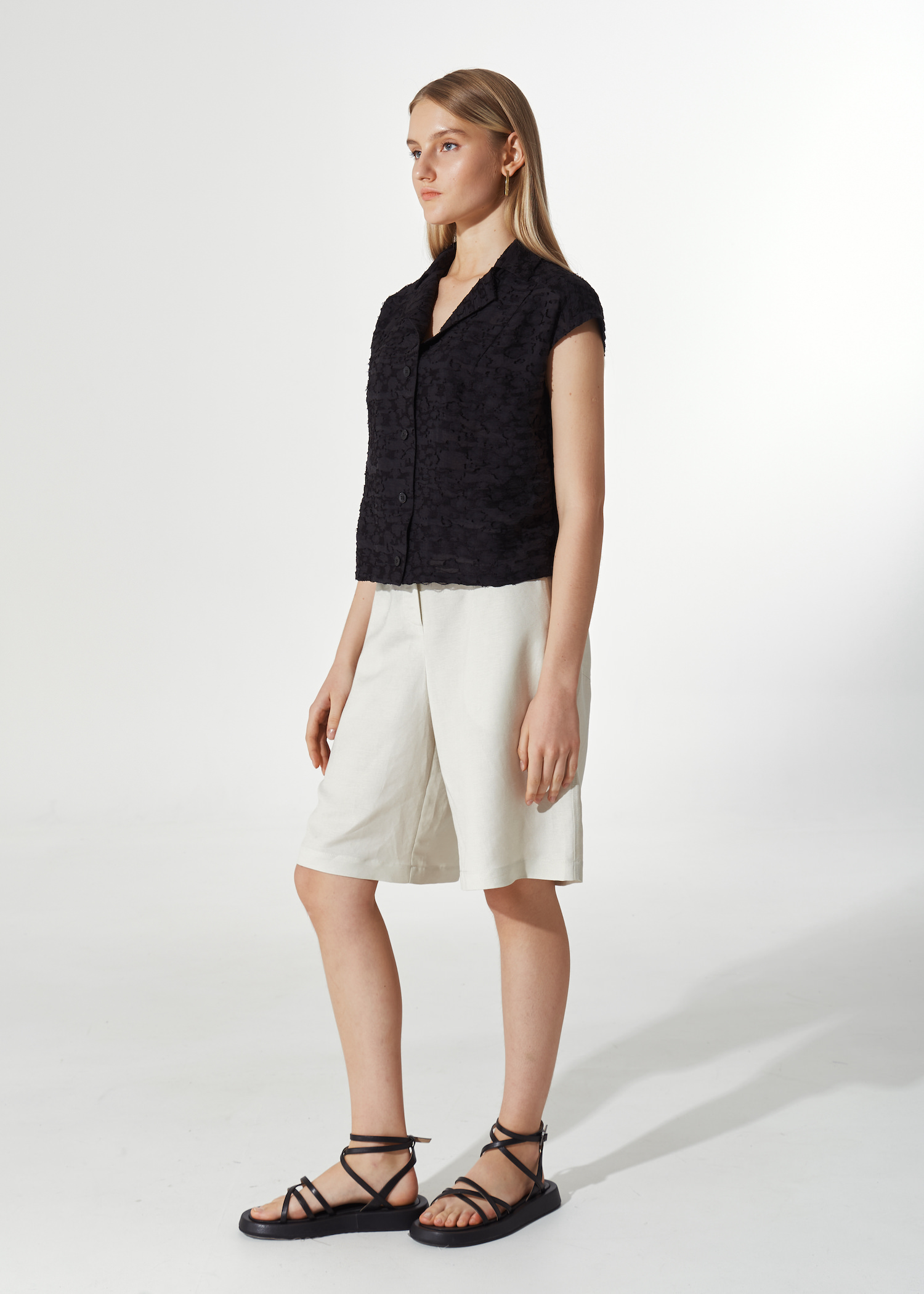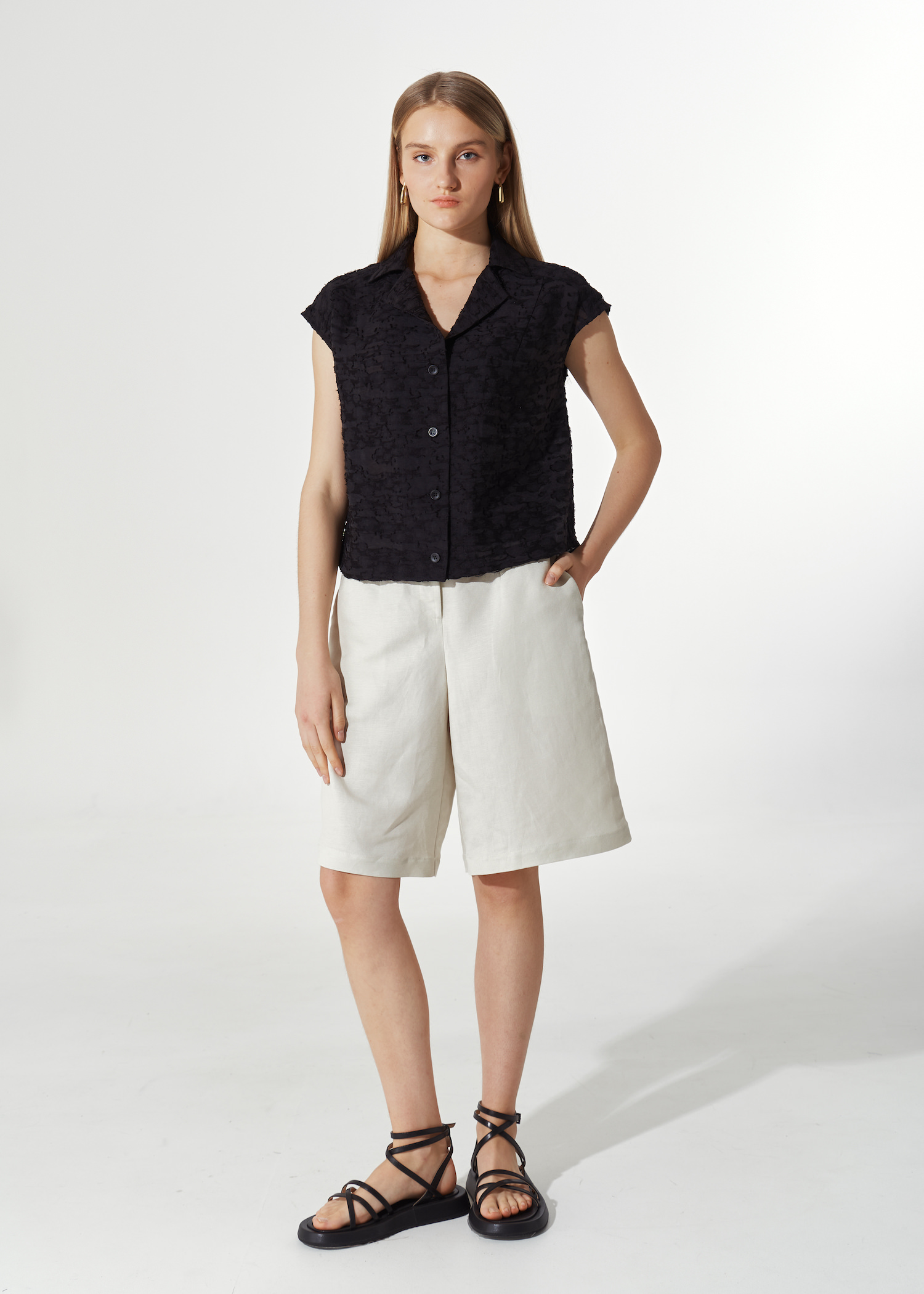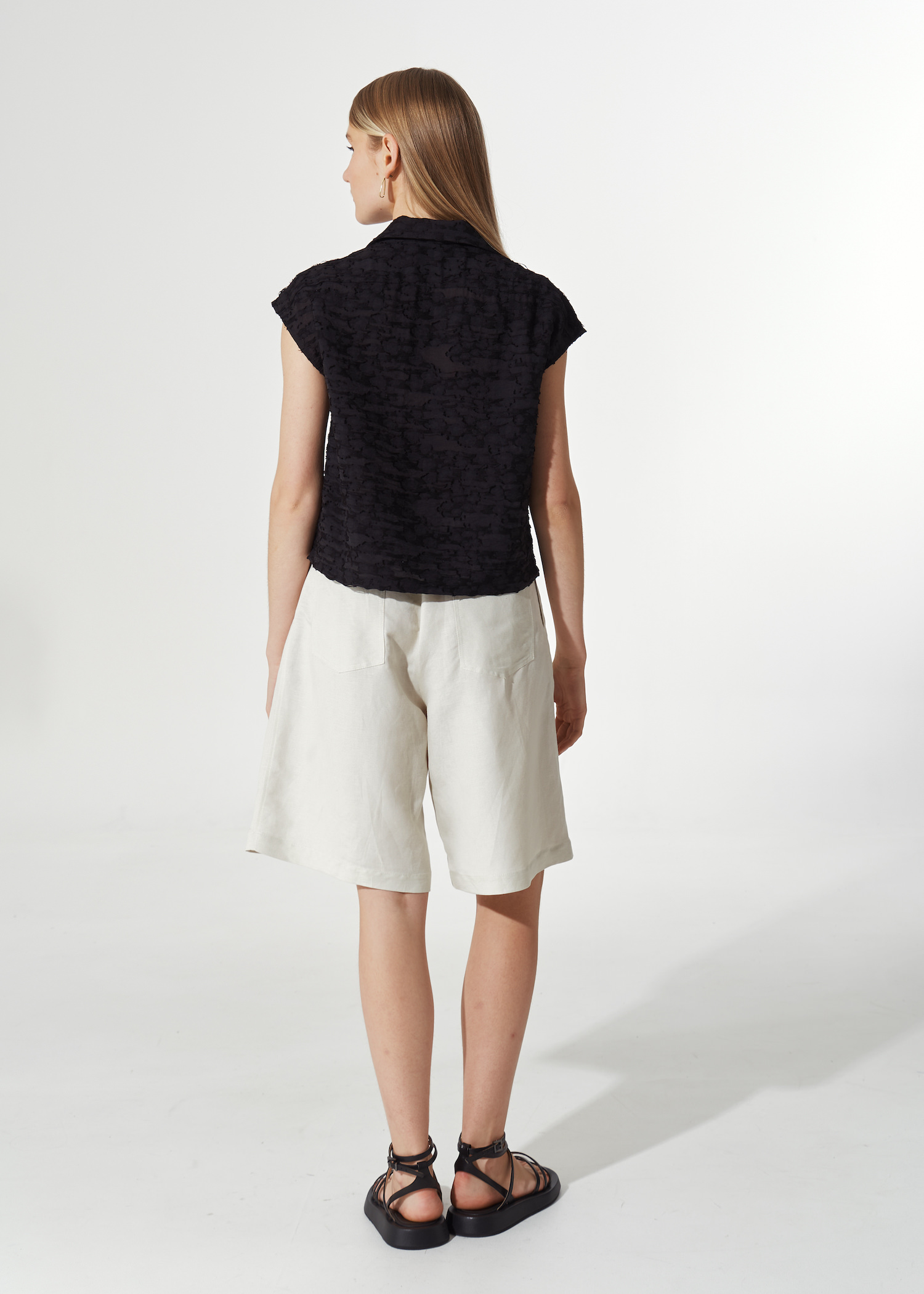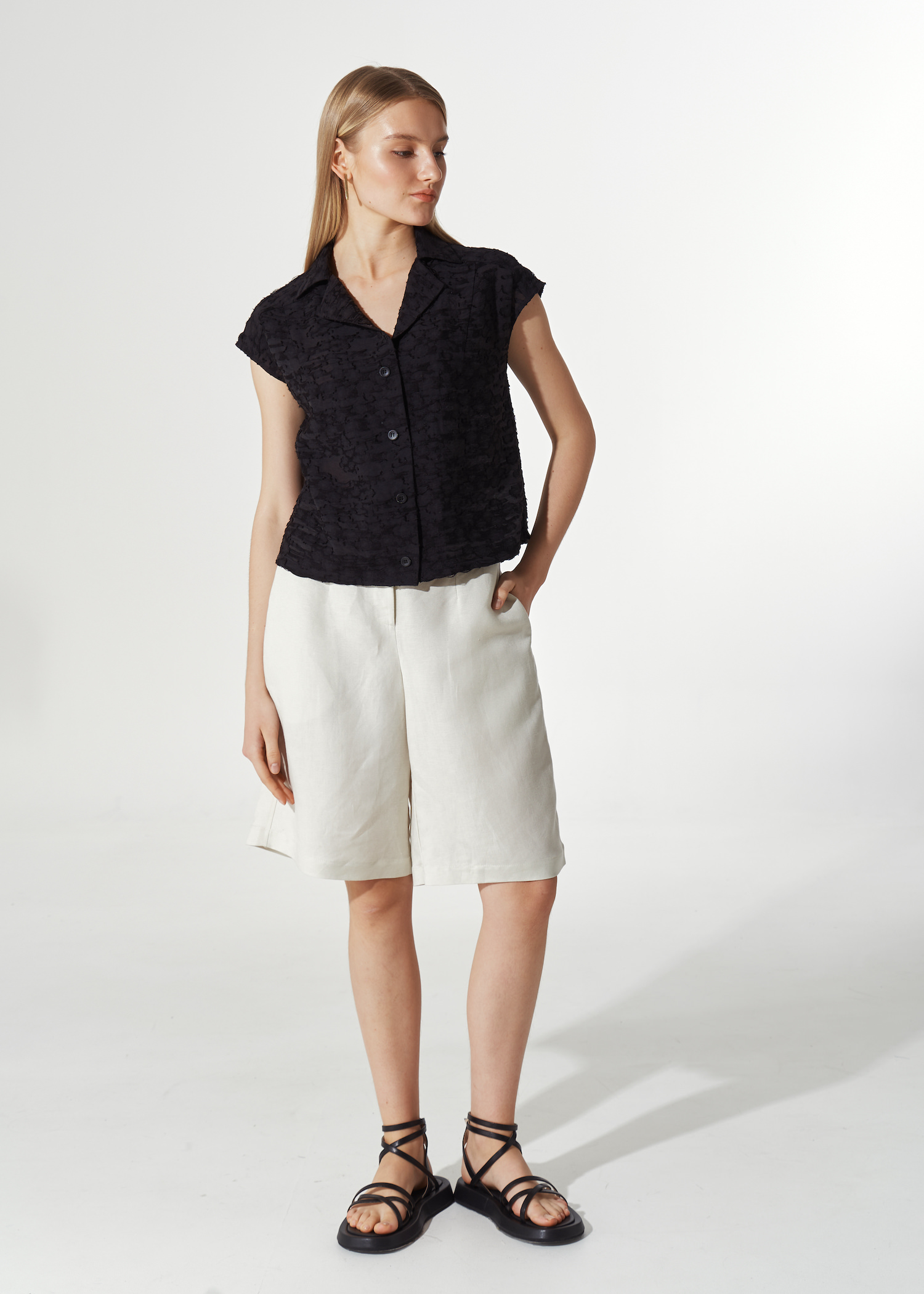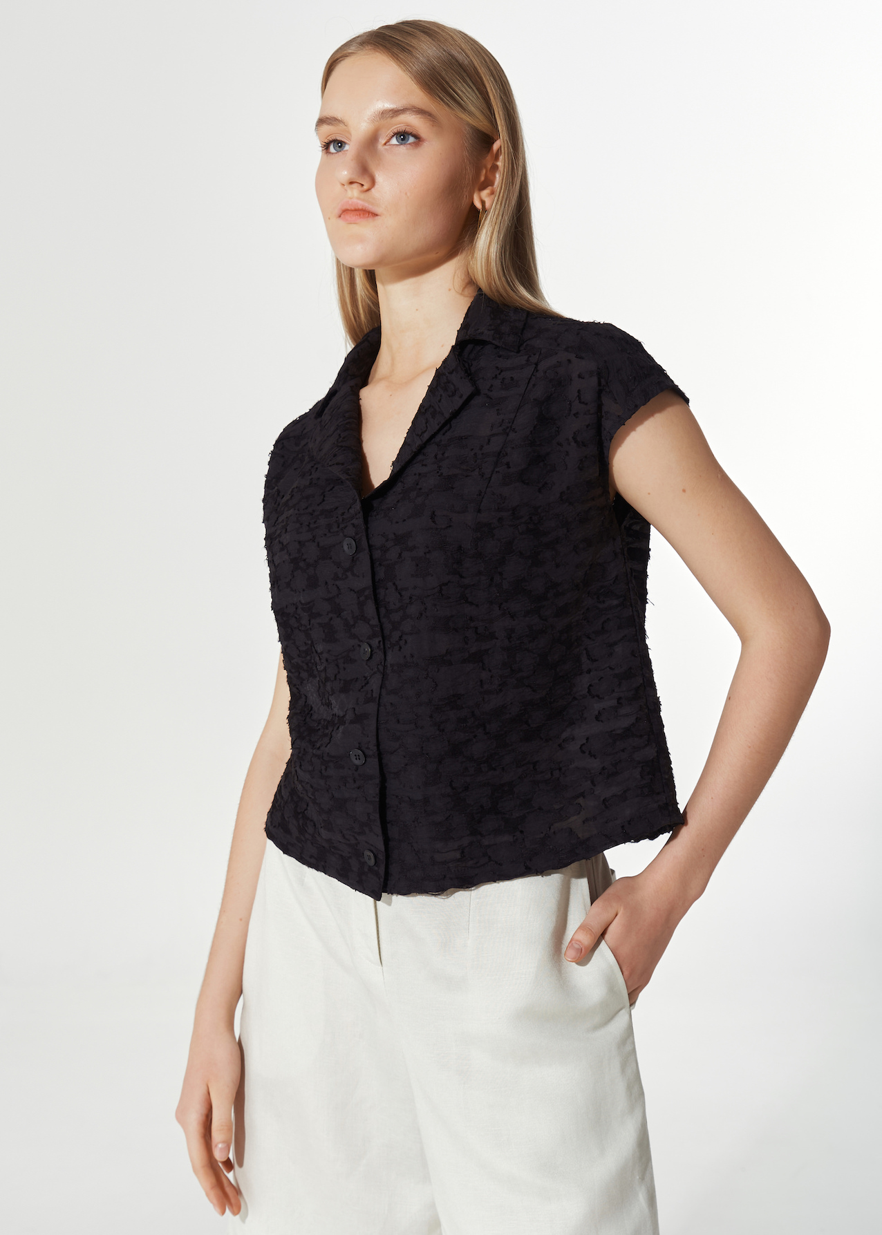 Черная рубашка из фактурной ткани. Укороченная модель прямого кроя на пуговках с отложным воротником и лацканами. Рукава крылышки.