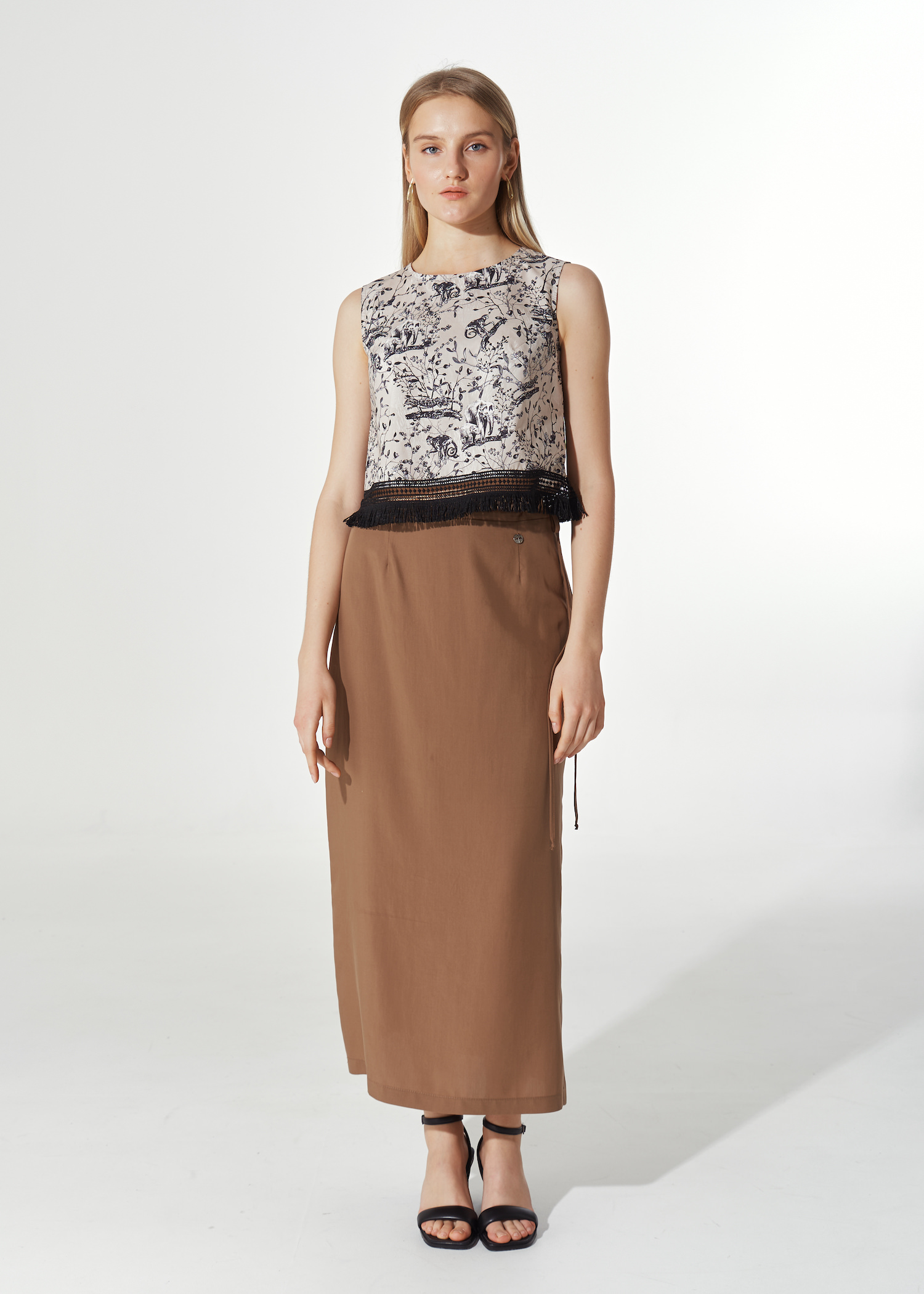 Топ в стиле animal, укороченный с бахромой по низу. Модель с круглым воротом без застежки. Без рукавов.