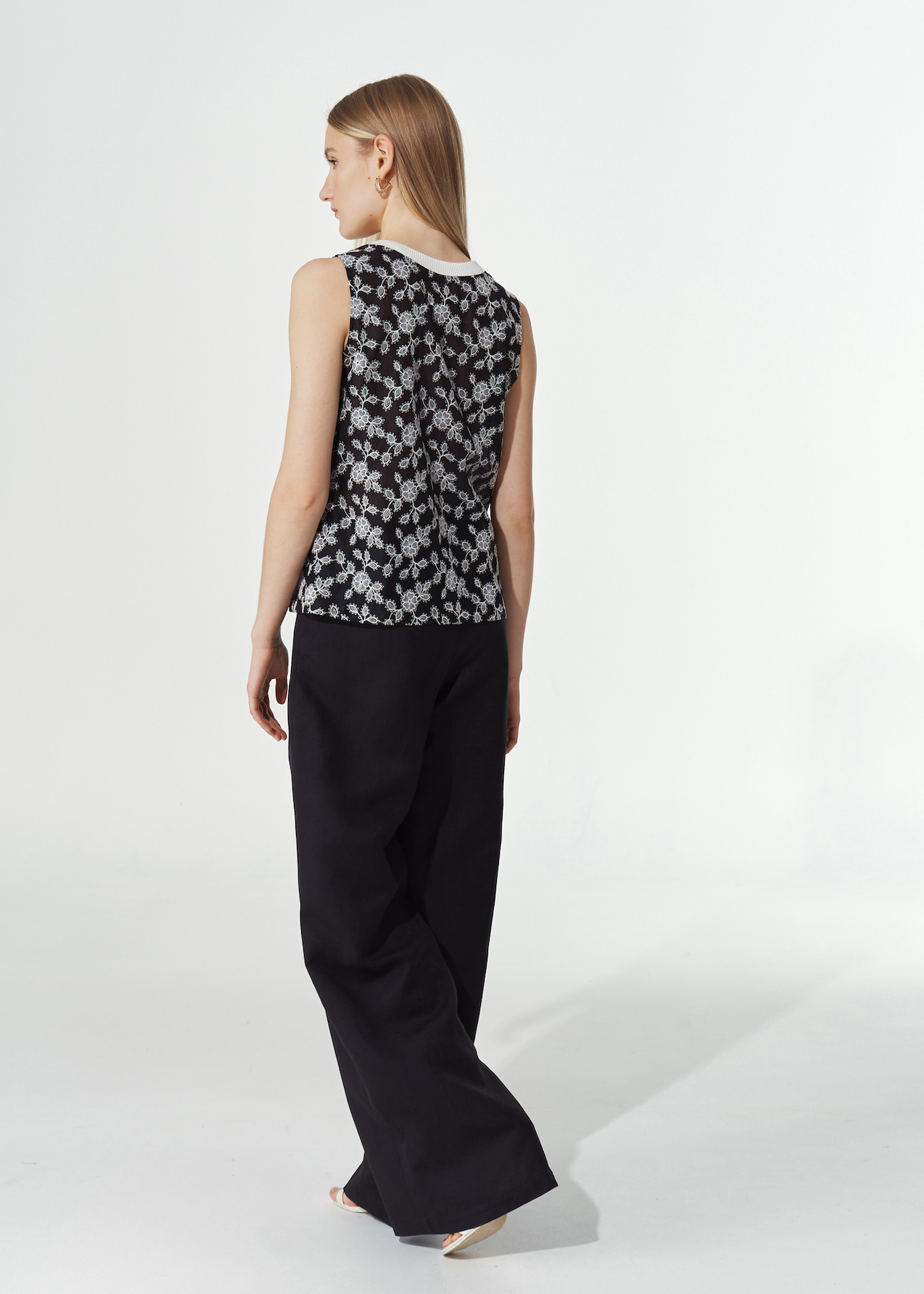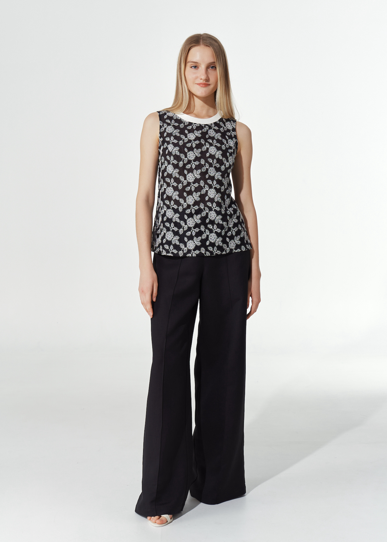 Черно-белая блузка без рукавов. Модель по фигуре из 100% тенсела с контрастным узором. Круглый ворот резинкой белого цвета в тон узору. Без застежки.
