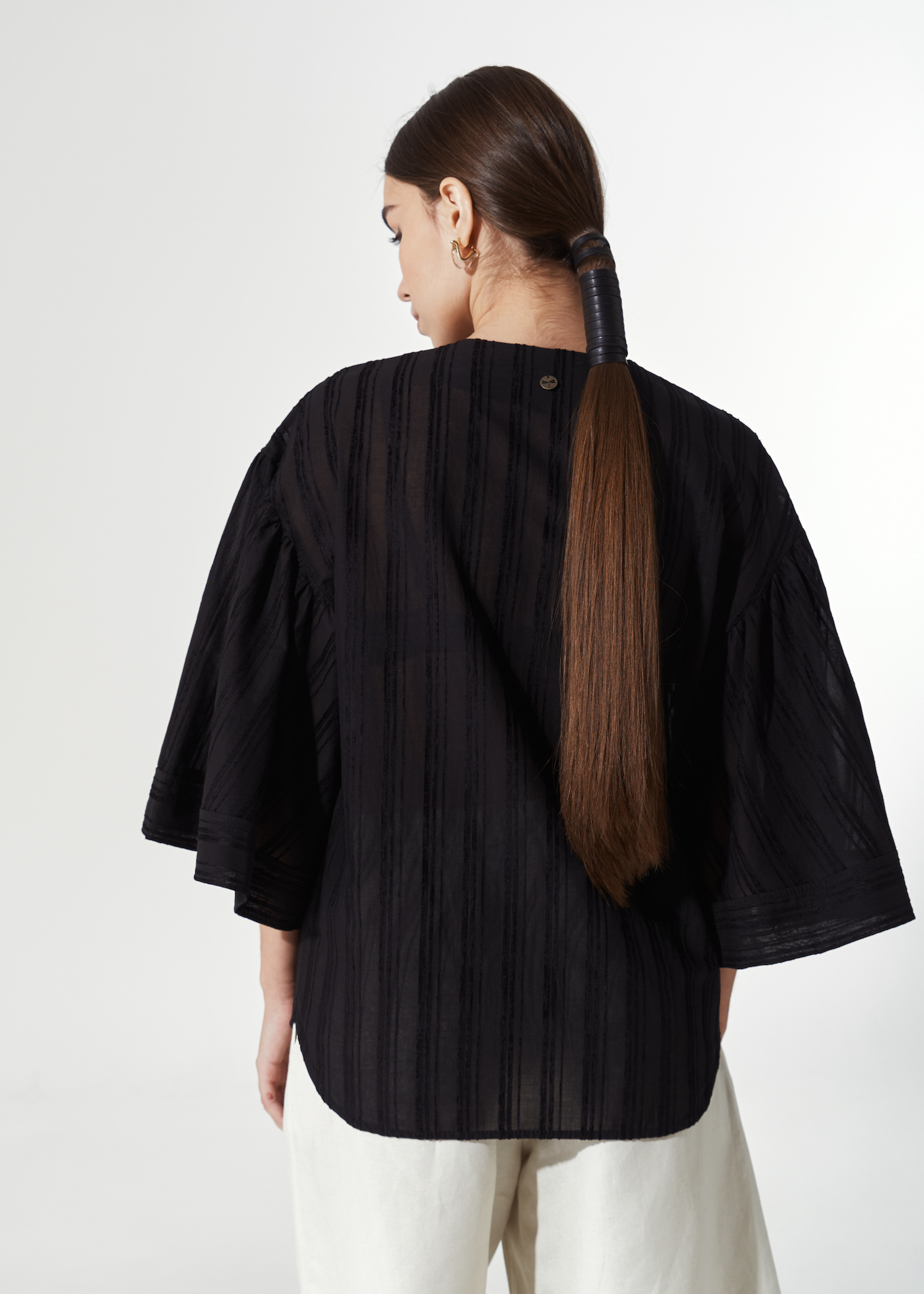 Блузка с акцентными рукавами черная. Полупрозрачная модель прямого кроя с полукруглым краем. V-образный вырез без застежки. Спущенная линия плеча с рукавами до локтя.