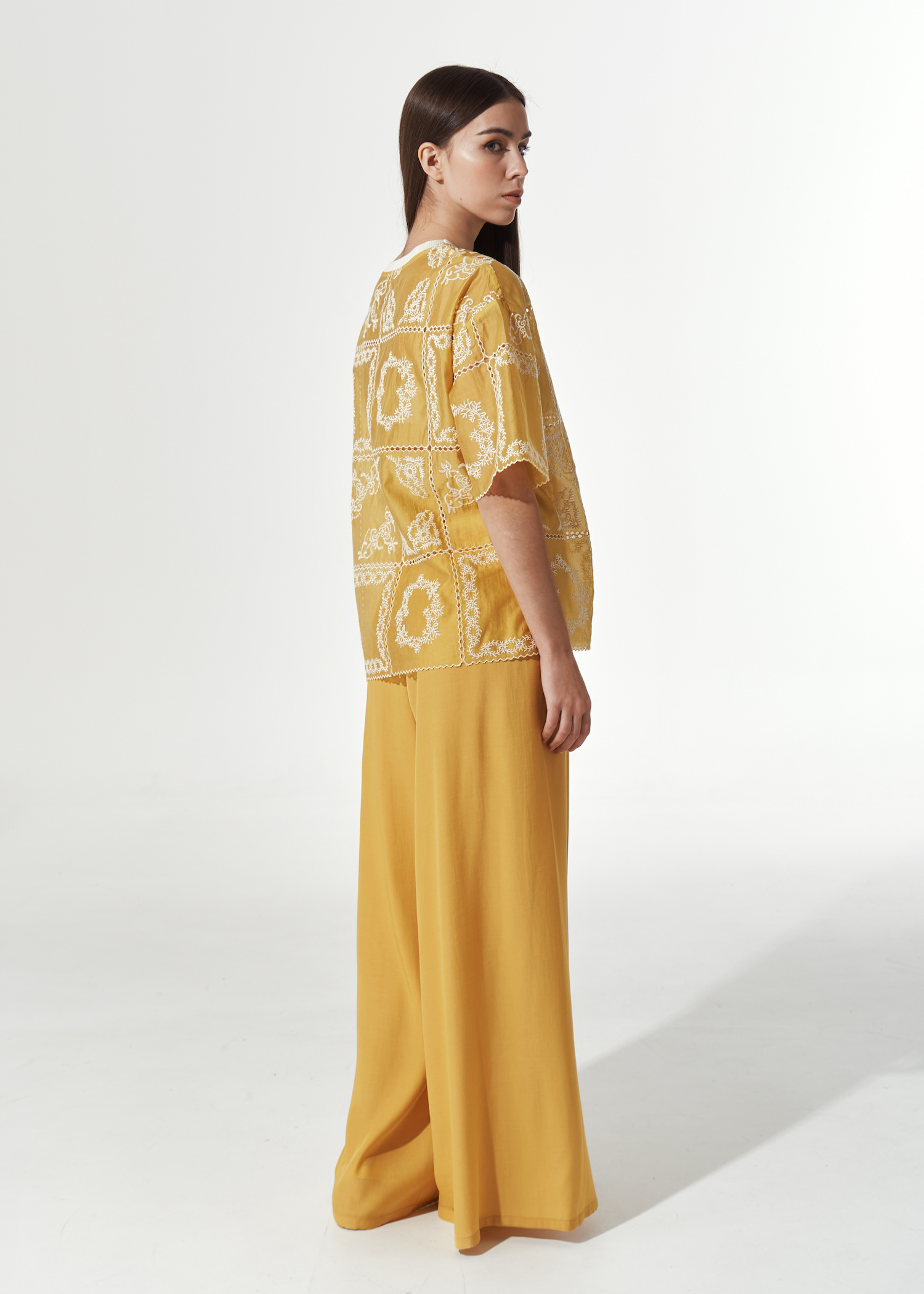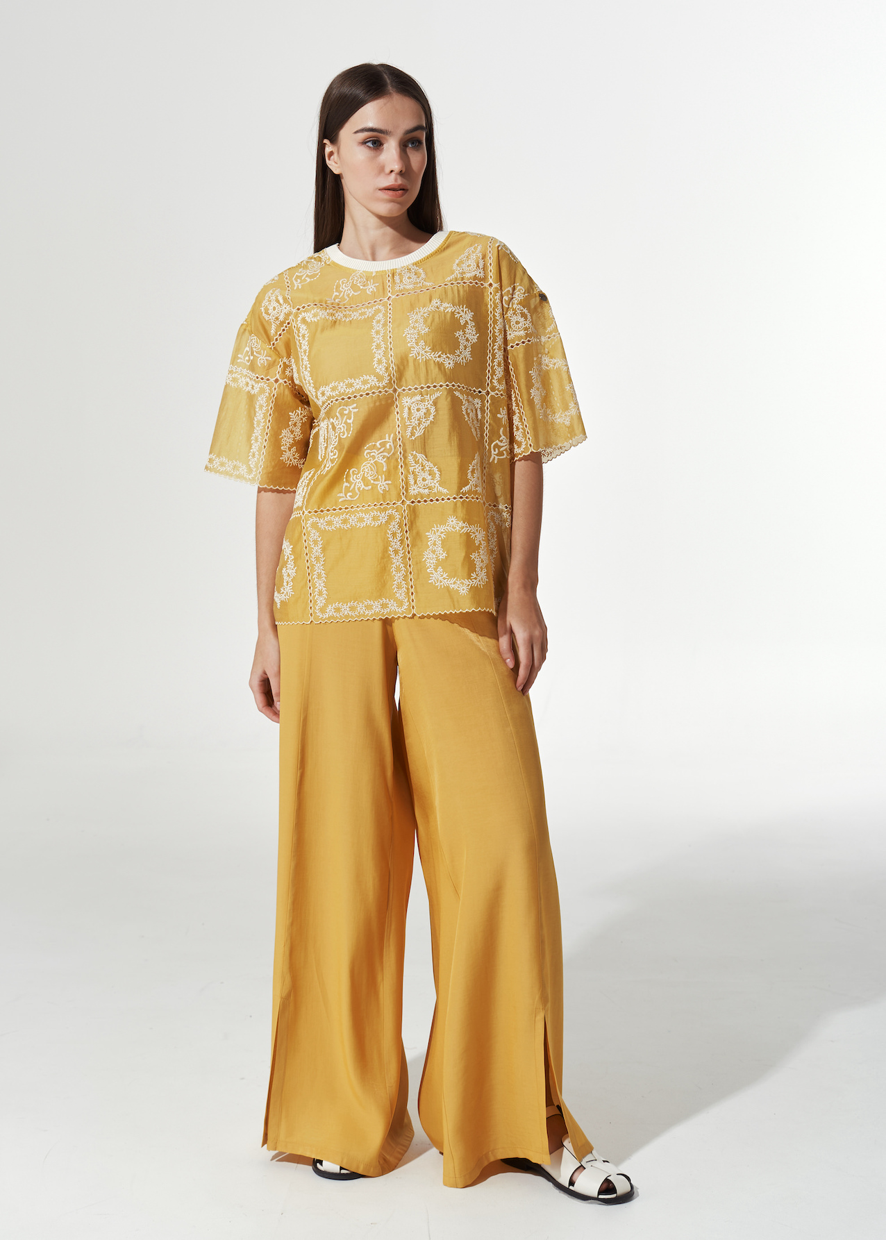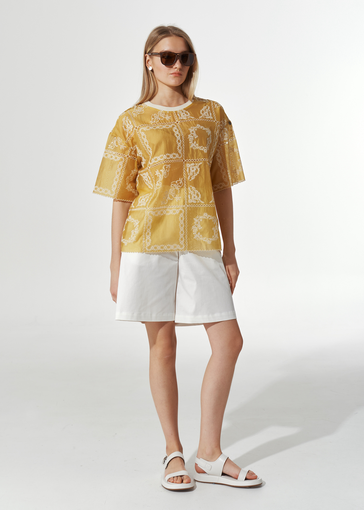 Блузка горчичная женская. Полупрозрачная модель прямого кроя с белым узором и трикотажным круглым воротом, без застежки. Спущенная линия плеча с рукавами до локтя.