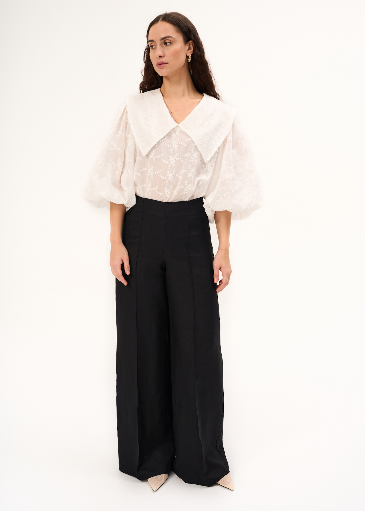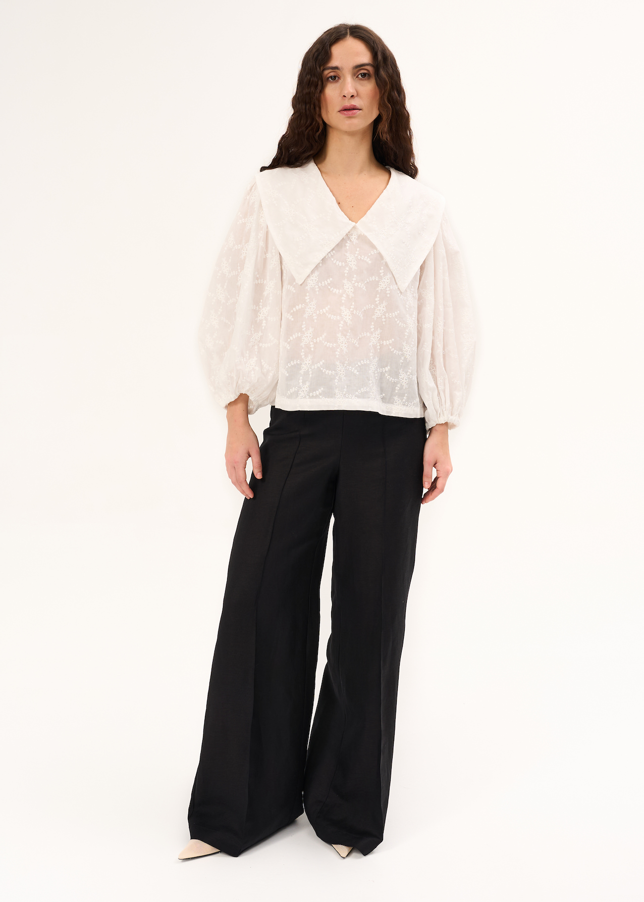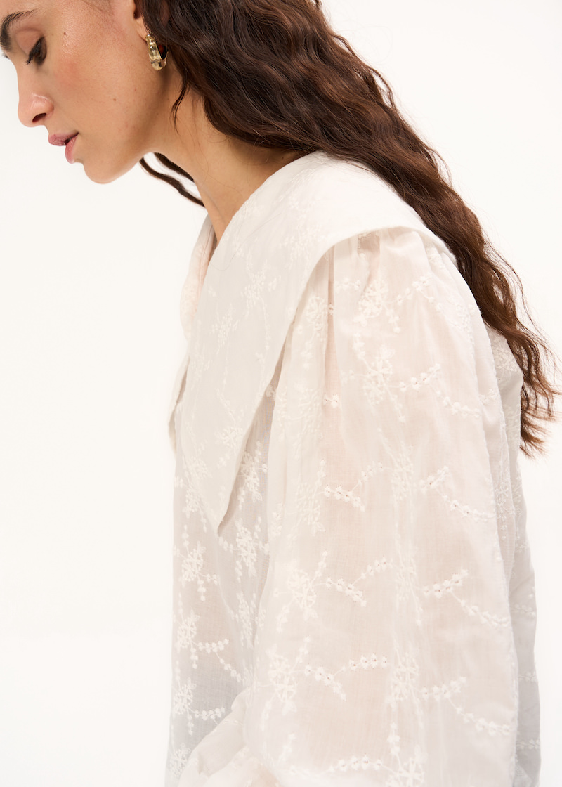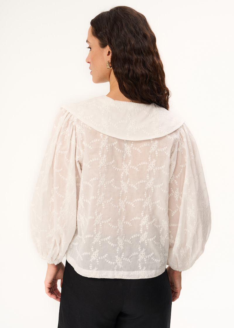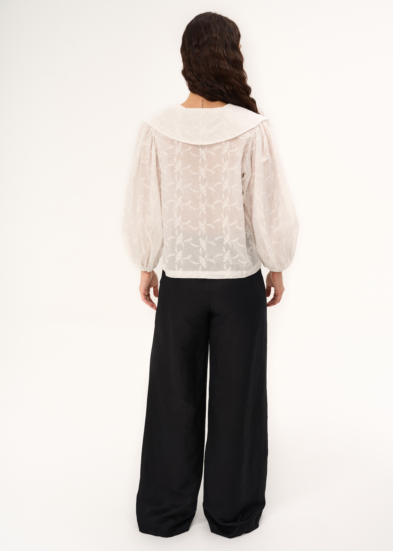 Блузка с акцентным воротником белая. Хлопковая модель с перфорацией и вышивкой в тон изделия. Длинные рукава фонарики с манжетой на резинке. Без застежки.