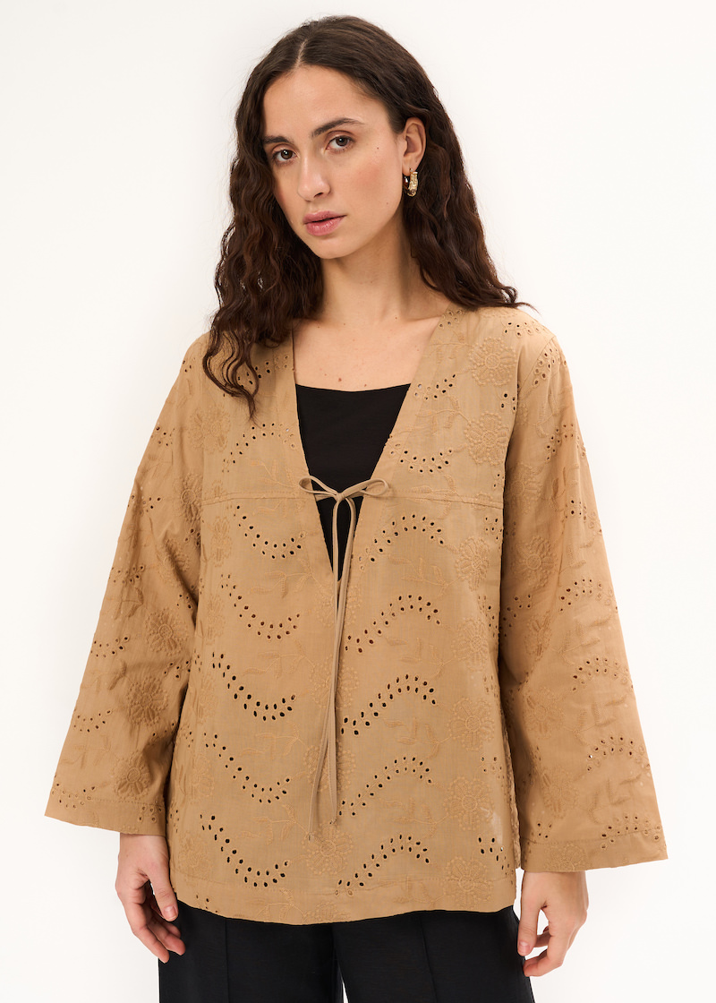 Коричневая блузка кроше с завязками в районе груди. Удлиненная полупрозрачная модель свободного кроя с V-образным вырезом. Спущенная линия плеча со свободными рукавами полной длины. Манжеты с широкой окантовкой тон изделия. Без застежки.