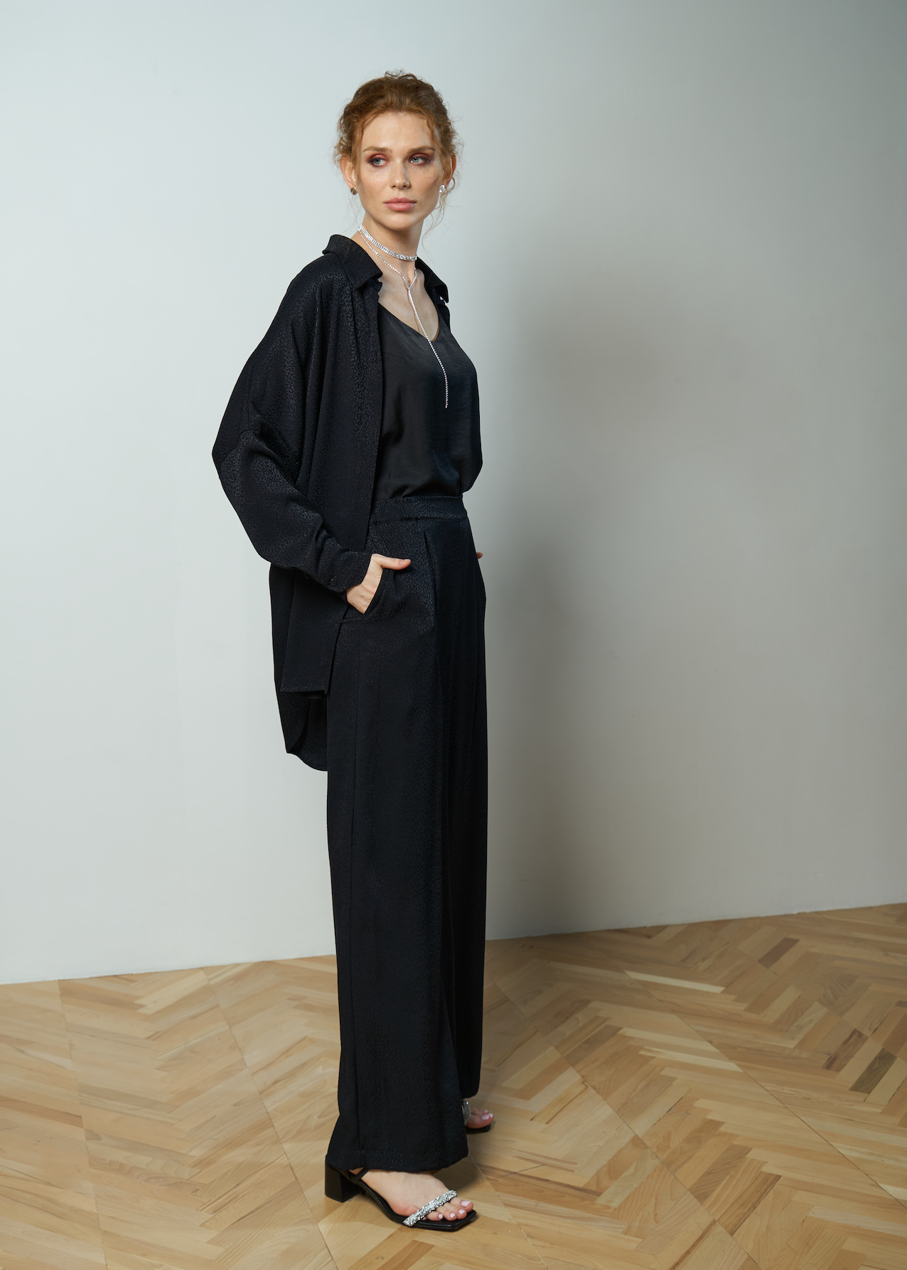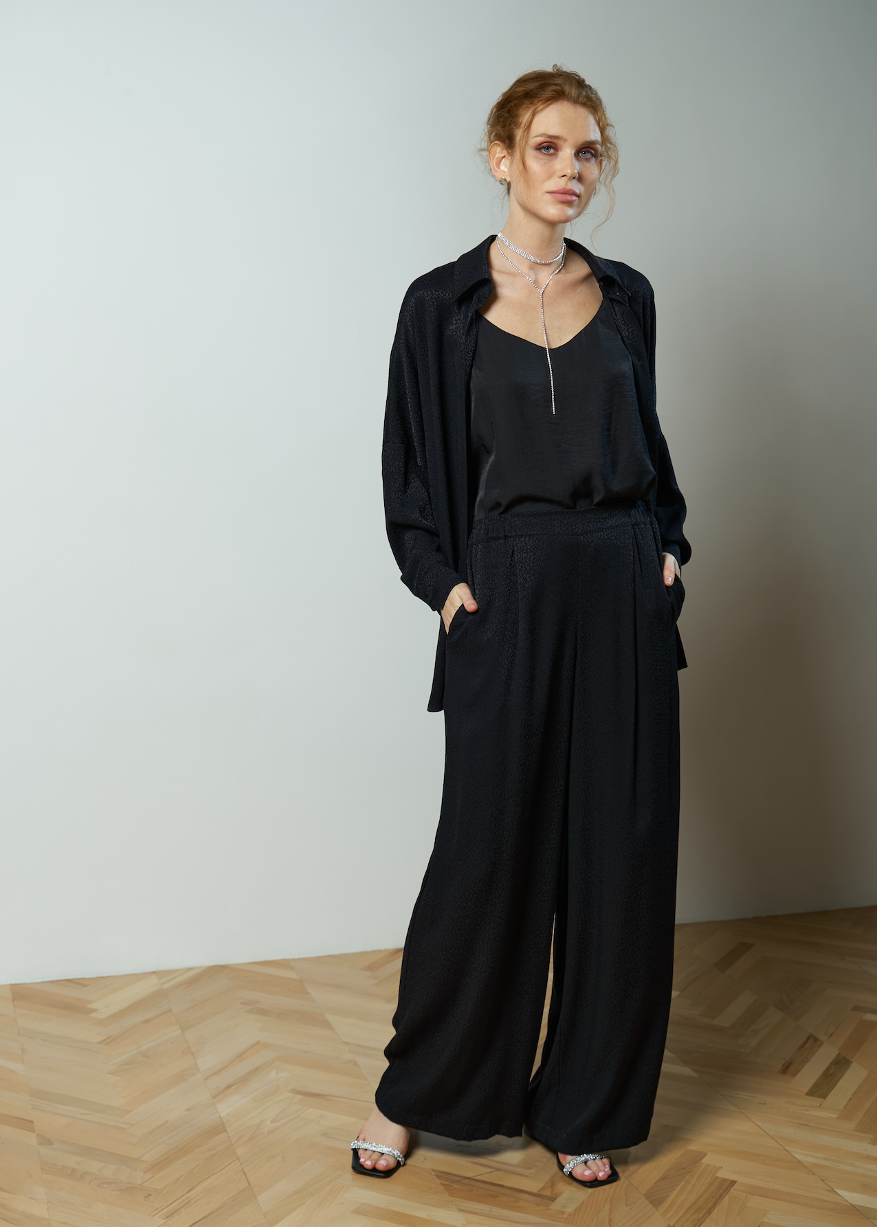 Брюки атласные с минималистичным принтом. Модель клеш от бедра полной длины с карманами. Струящиеся брюки с поясом на резинке.