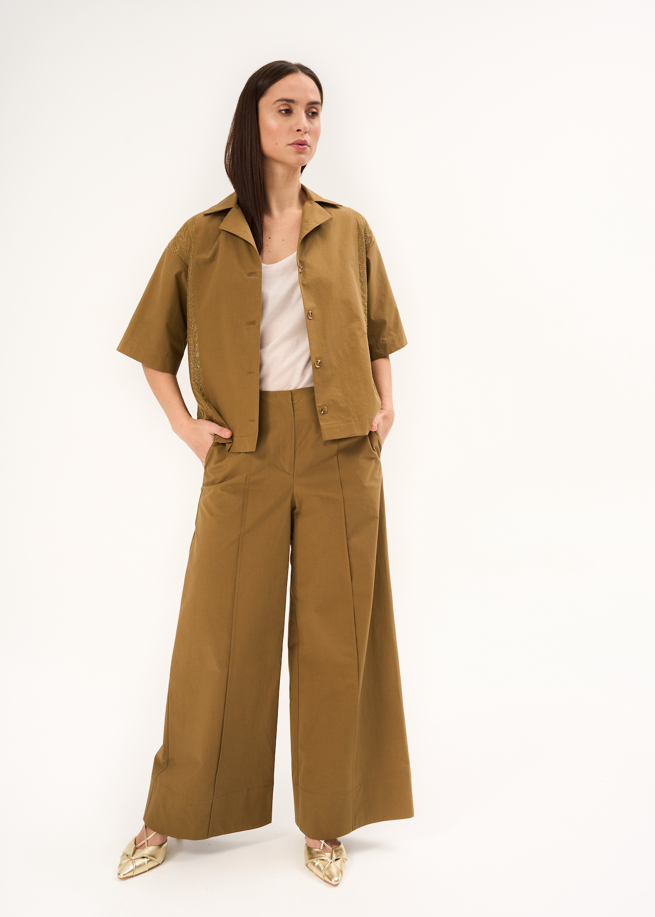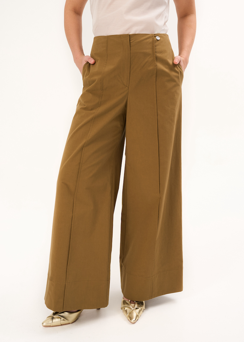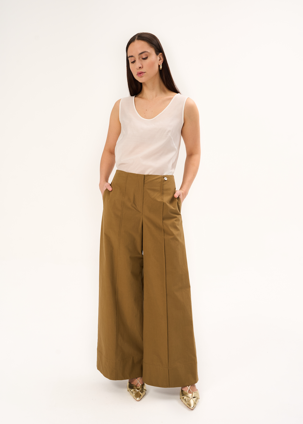 Брюки широкие льняные. Модель палаццо со стрелкой. Брюки с карманами и застежкой на молнию. Без пояса и шлевок.