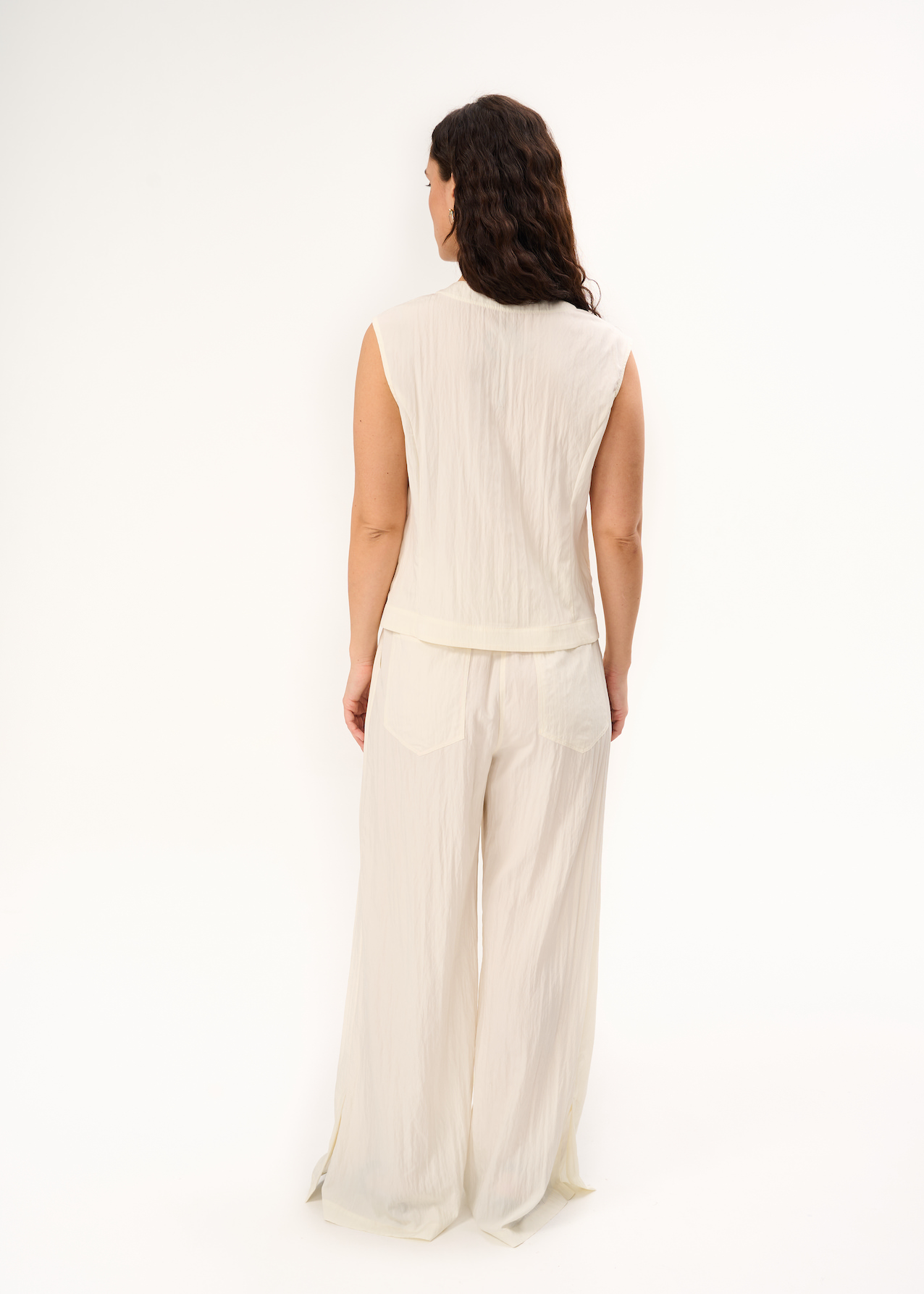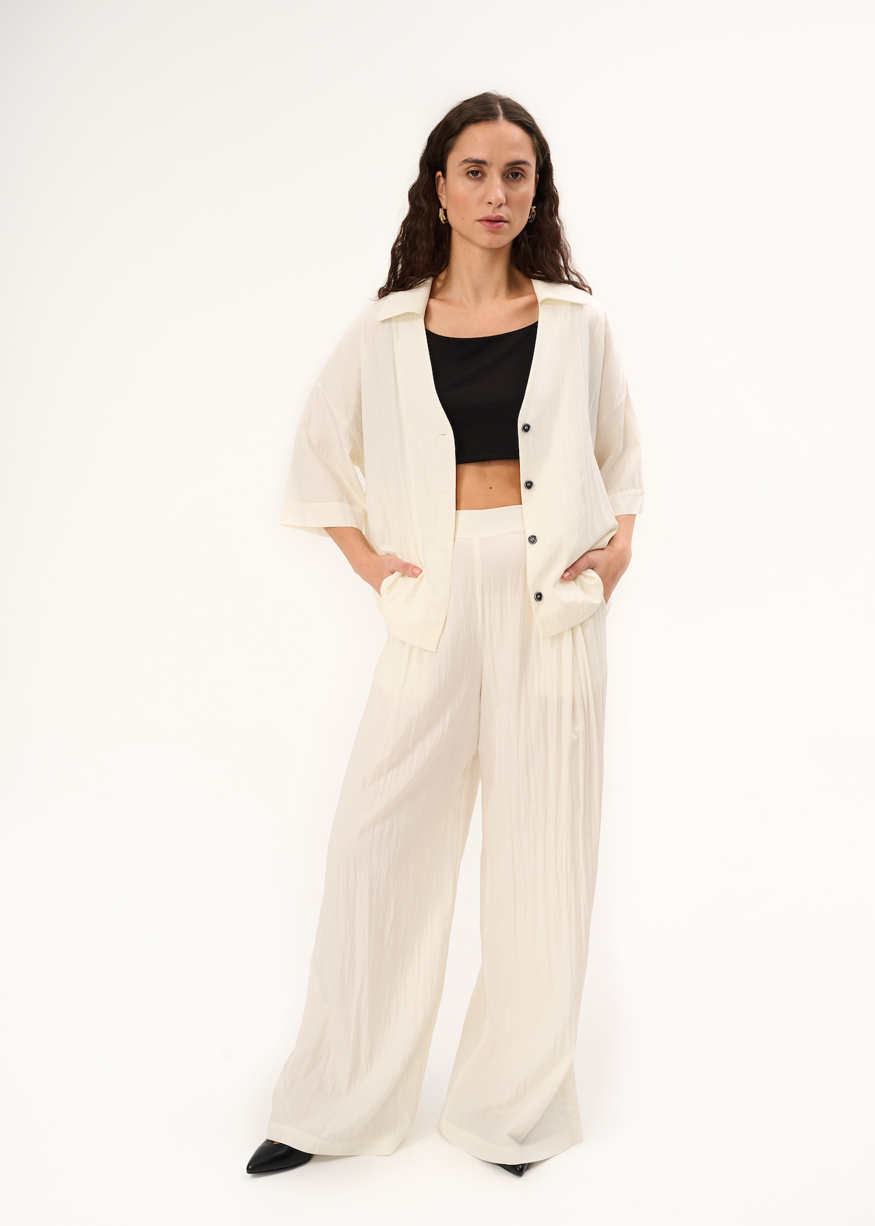 Брюки из жатой ткани. Широкая полупрозрачная модель в пол с разрезами и карманами. Пояс на резинке.