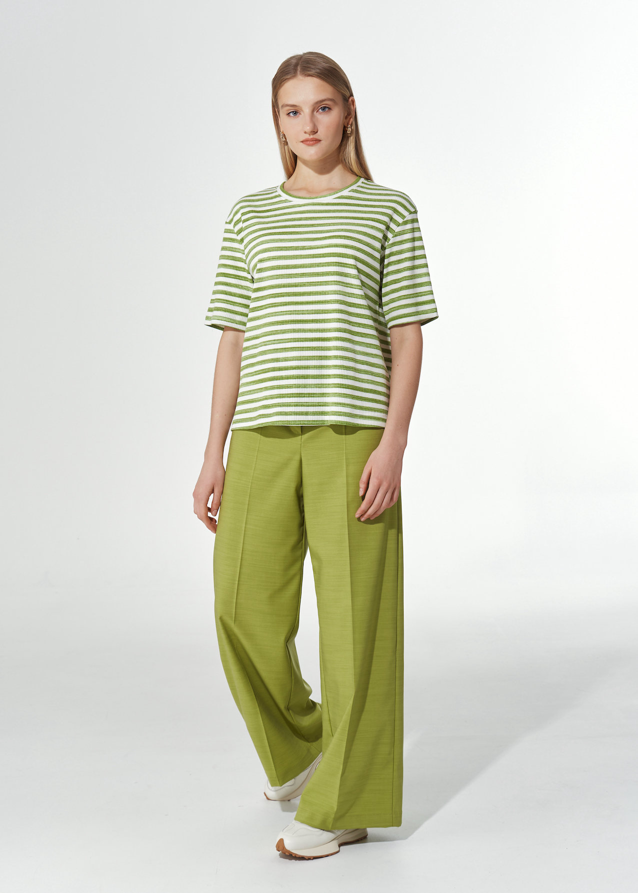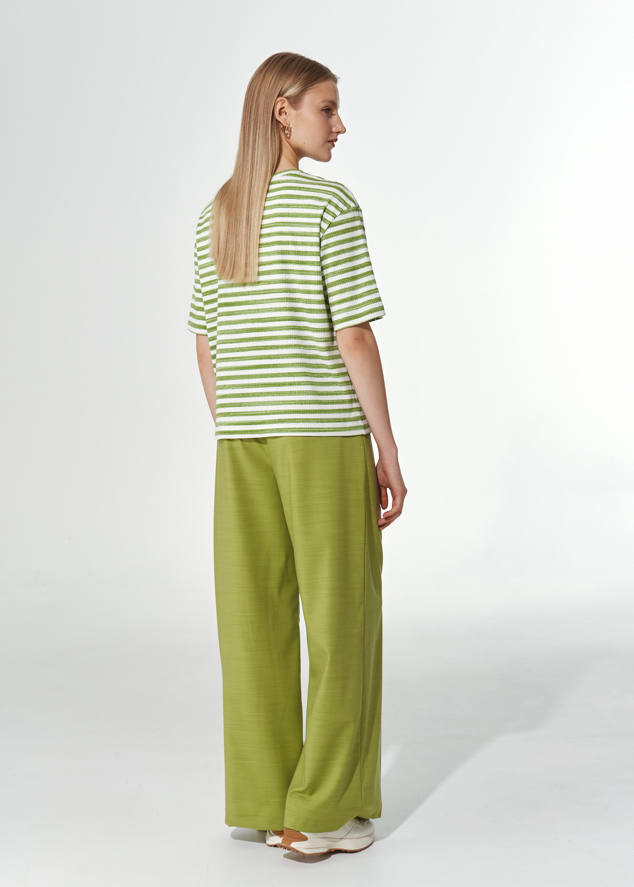 Футболка хлопковая до бедра. Модель свободного кроя с горизонтальной полоской бело-зеленого цвета, спущенная линия плеча с рукавом до локтя. Круглый вырез без застежки.