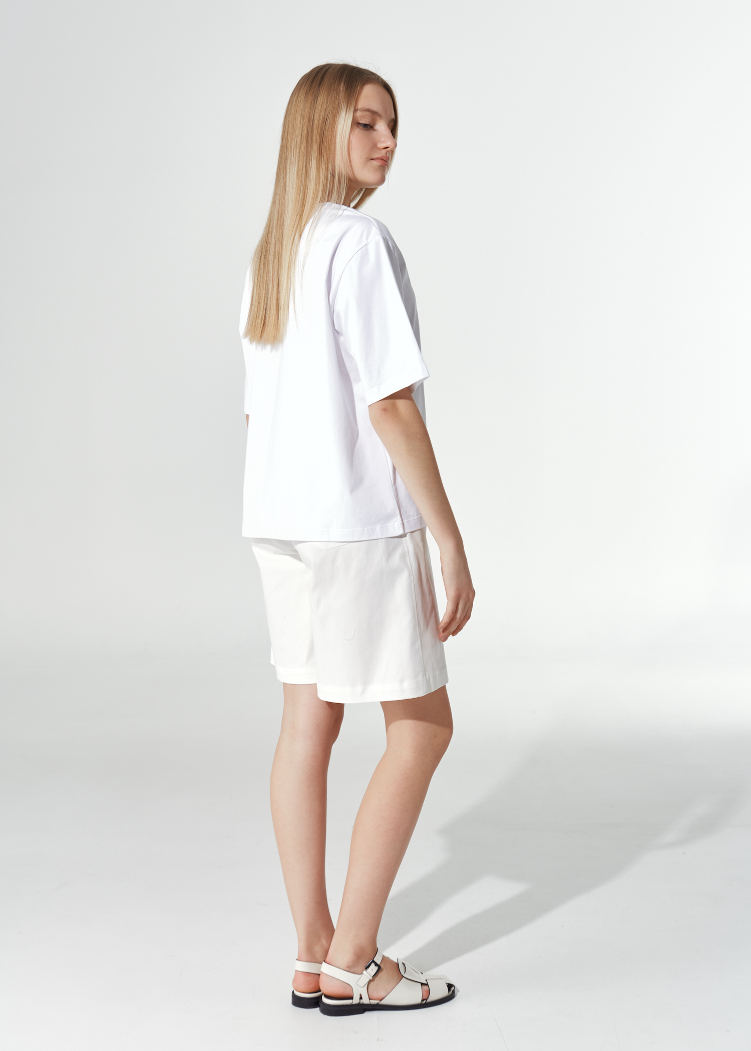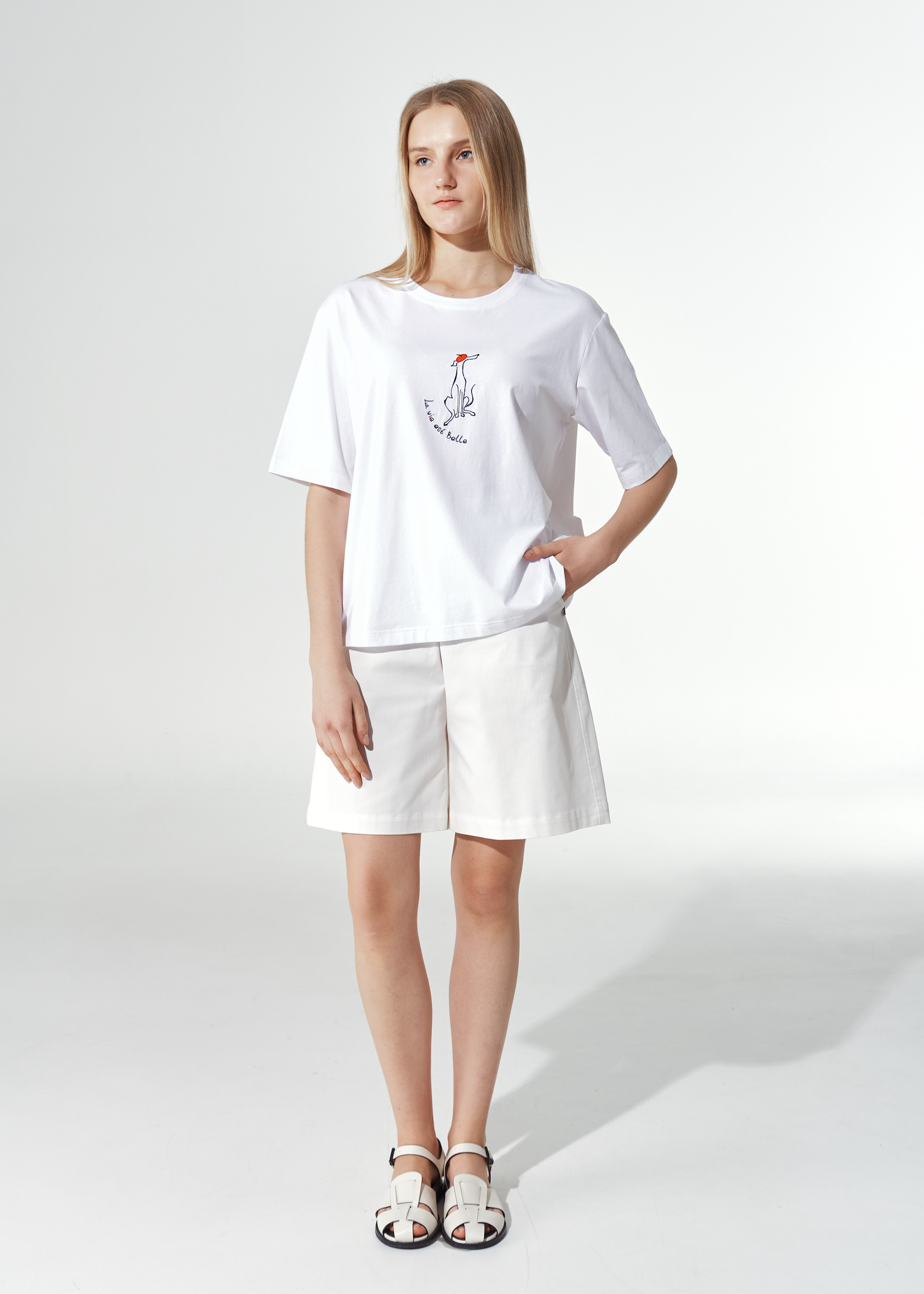 Женская футболка с принтом на груди. Однотонная модель прямого кроя до бедра. Слегка спущенная линия плеча с рукавами до локтя. Круглый вырез без застежки.