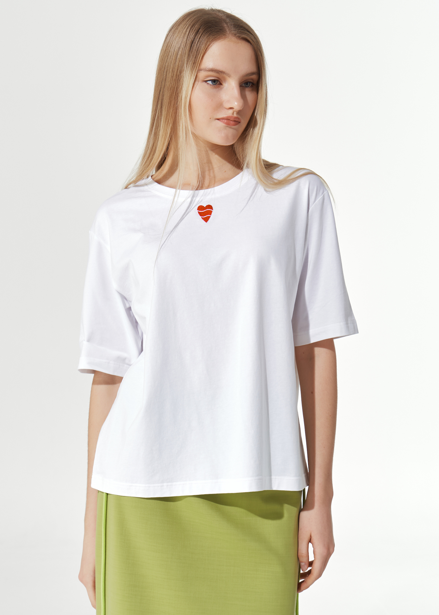 Белая футболка с принтом сердце у воротника. Модель прямого кроя до бедра. Слегка спущенная линия плеча с рукавами до локтя. Круглый воротник без застежки.