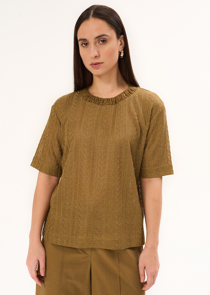 Футболка оливковая. Модель с вязанным эффектом, прямого кроя без принта. Футболка с жатым воротником в тон изделия, спущенная линия плеча с рукавами до локтя. Без застежки.