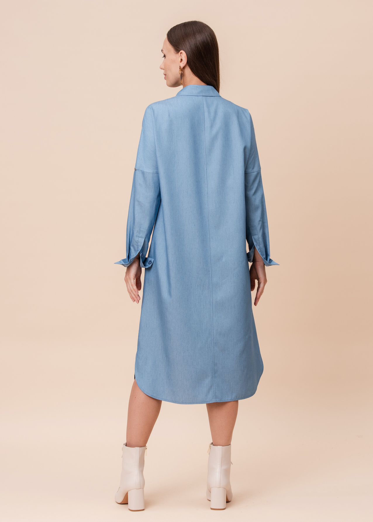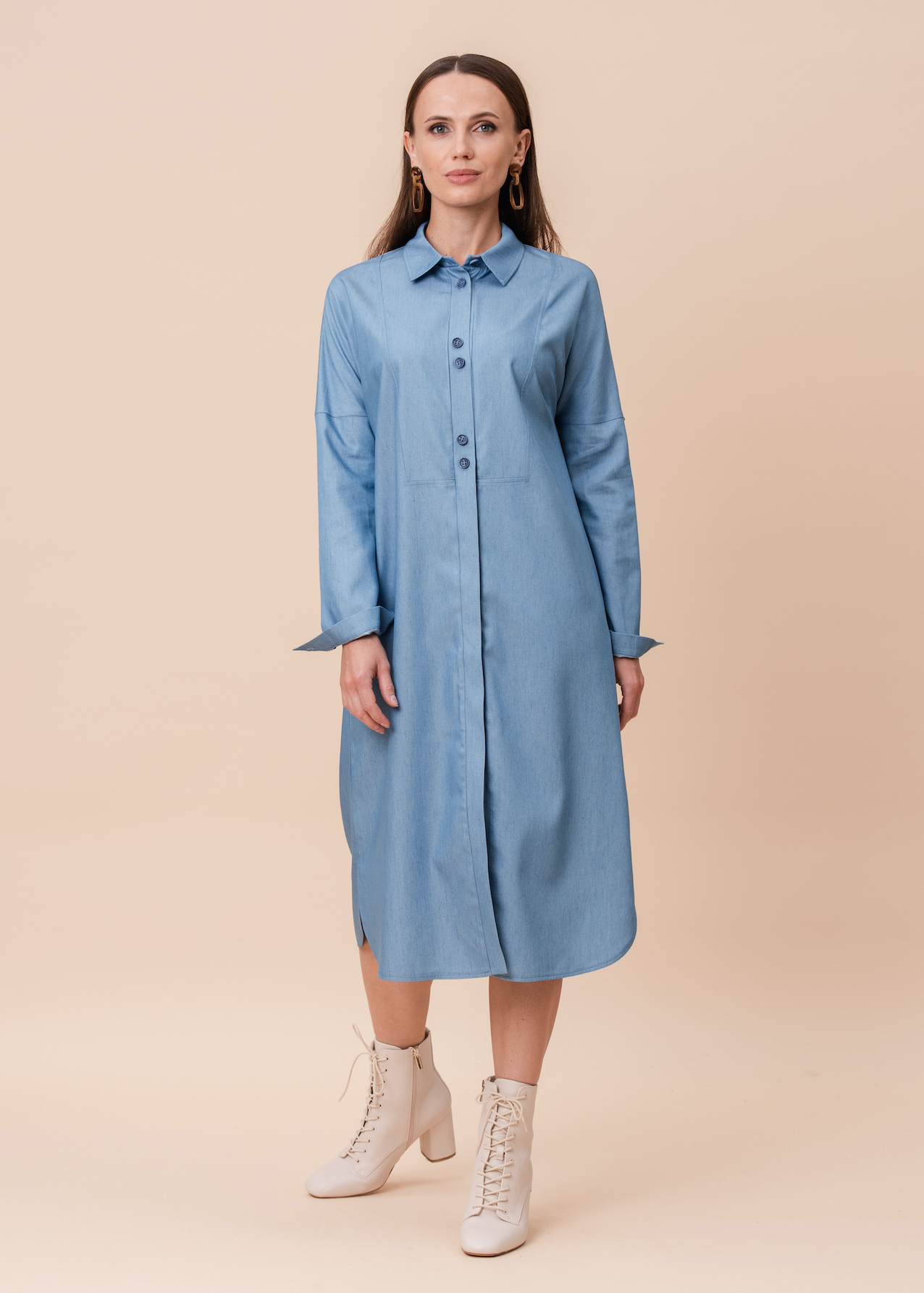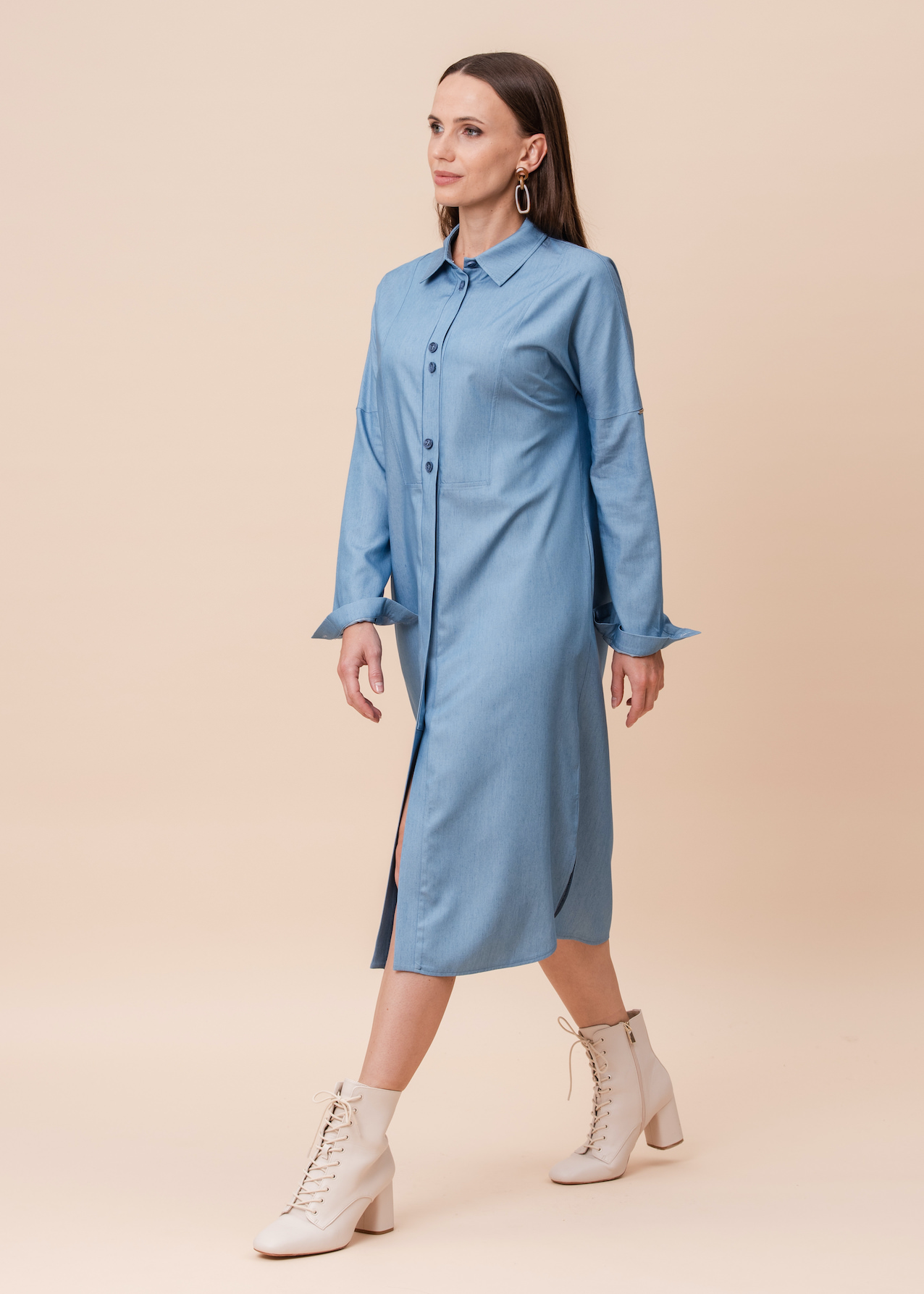 Прямое свободное платье из тенселя с расцветкой под деним с длинным рукавом и отложным воротничком. Спереди и по рукавам застежки на пуговицы. Спущенное плечо. По бокам снизу небольшие зазрезы с плавным закруглением.