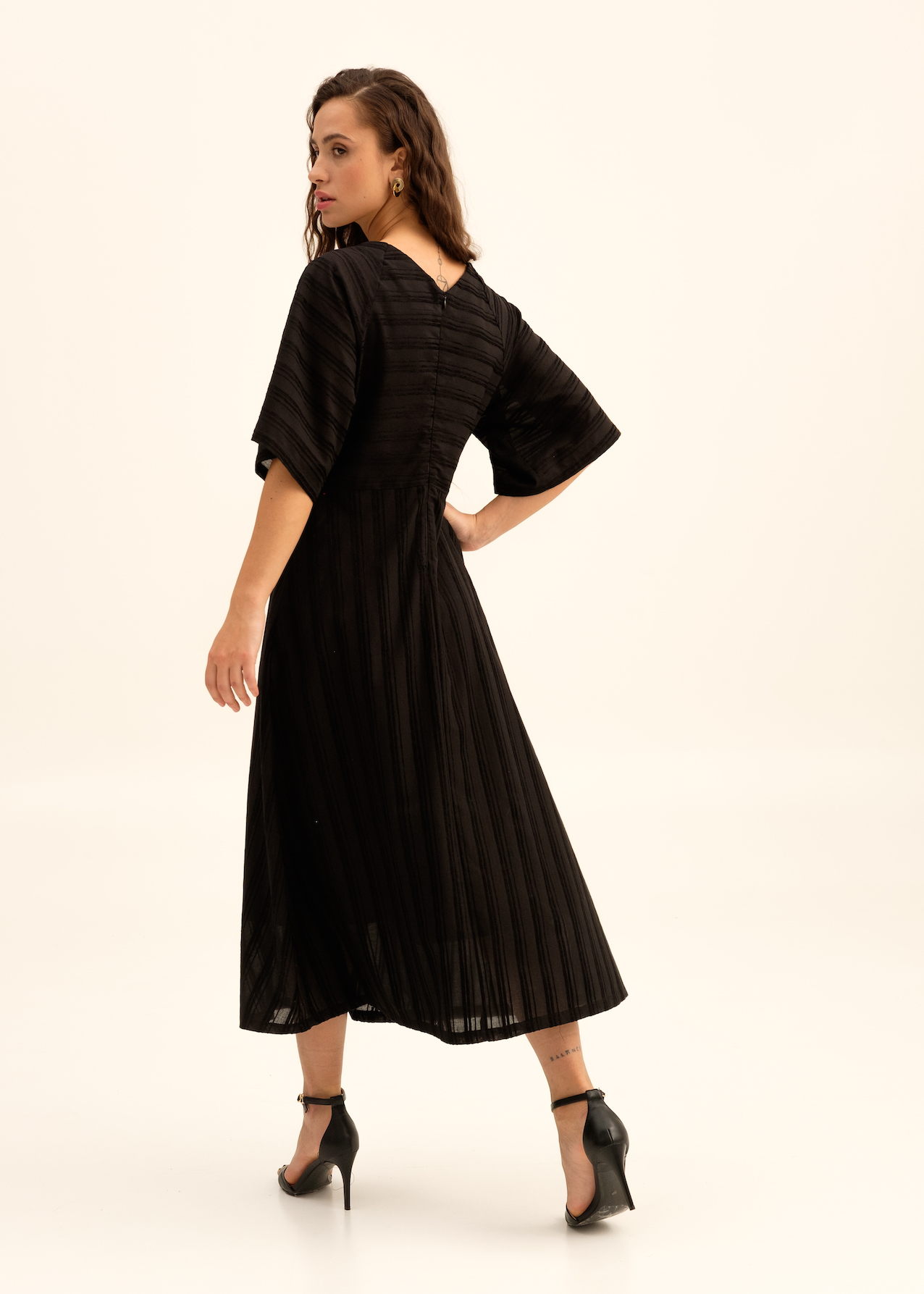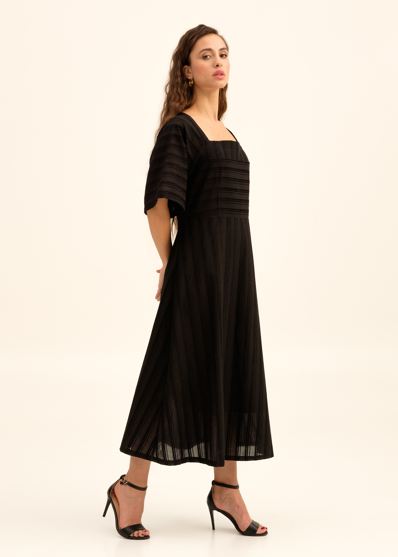 Платье миди из черного полосатого хлопка с подкладом. Отрезная линия по талии со сменой направления рисунка. Квадратная горловина и широкий рукав до локтя. Сзади застежка на потайную молнию.
