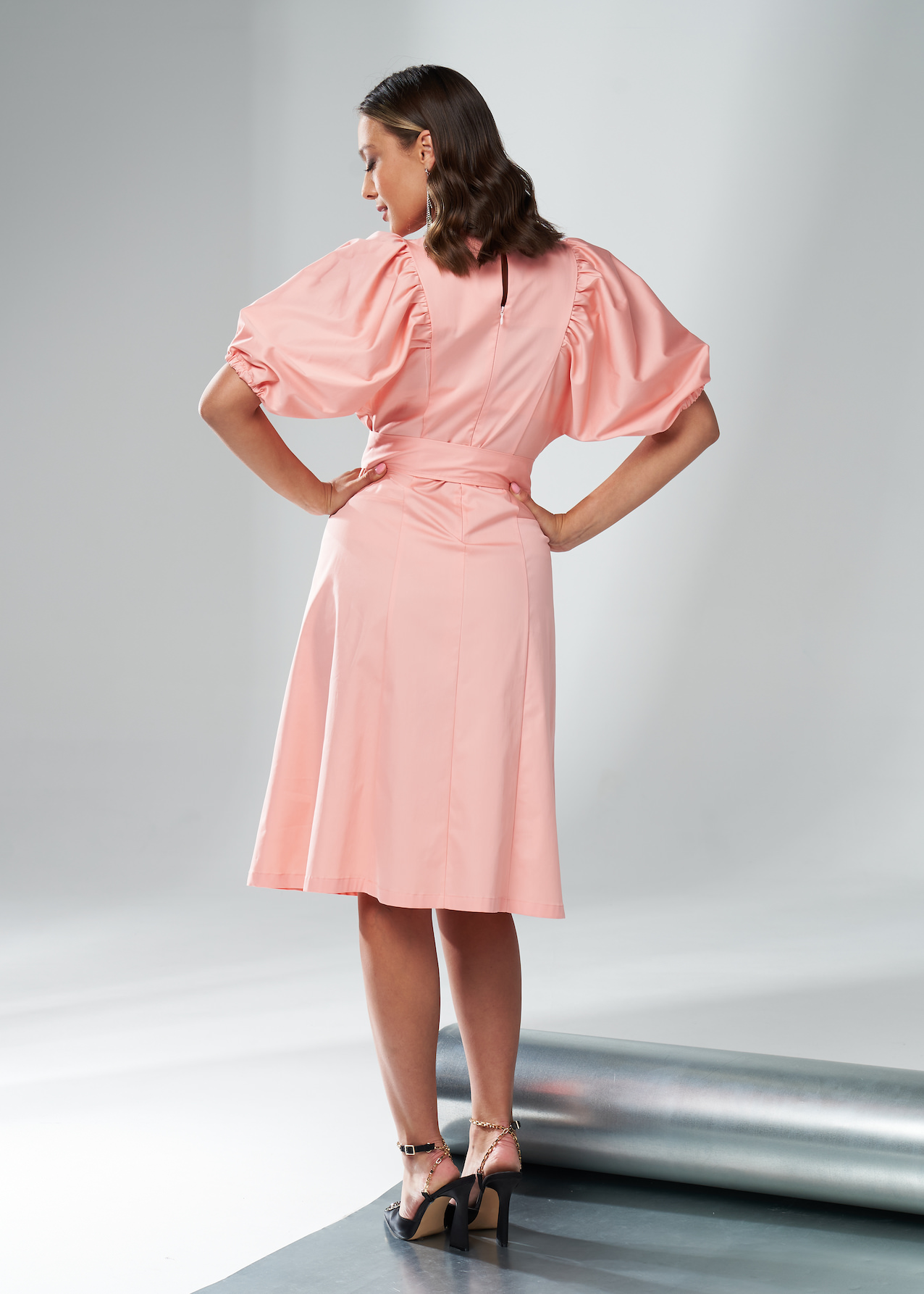 Розовое женское платье из хлопка с легким переливом. Приталенная модель с круглой горловиной. Прямой от бедра крой, в комплекте съемный пояс-лента. Длина миди. Пышные короткие рукава “летучая мышь” присборены на плечах и собраны внизу. Сзади потайная застежка-молния и пуговица.