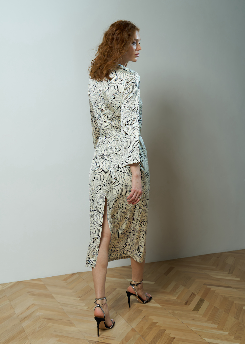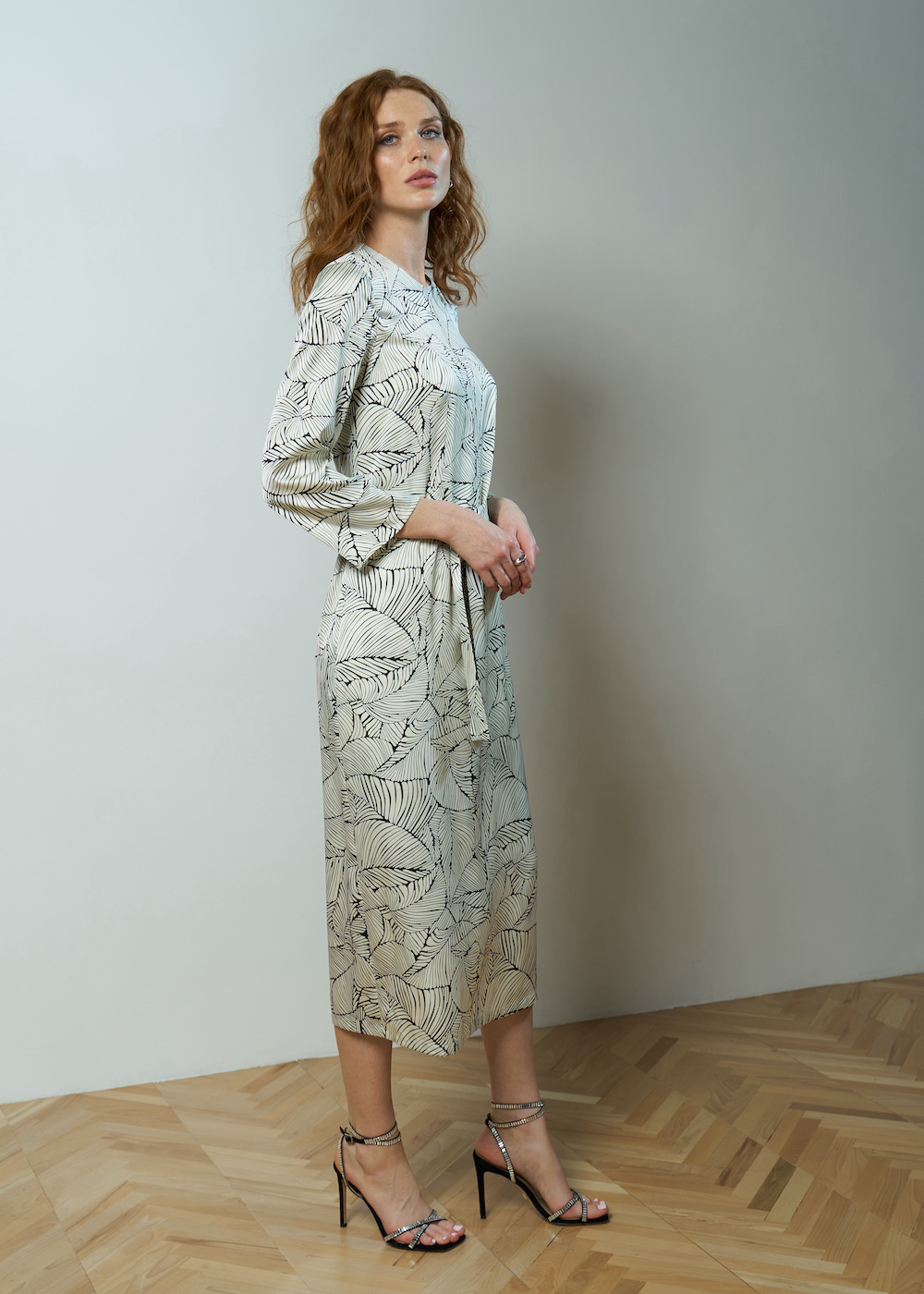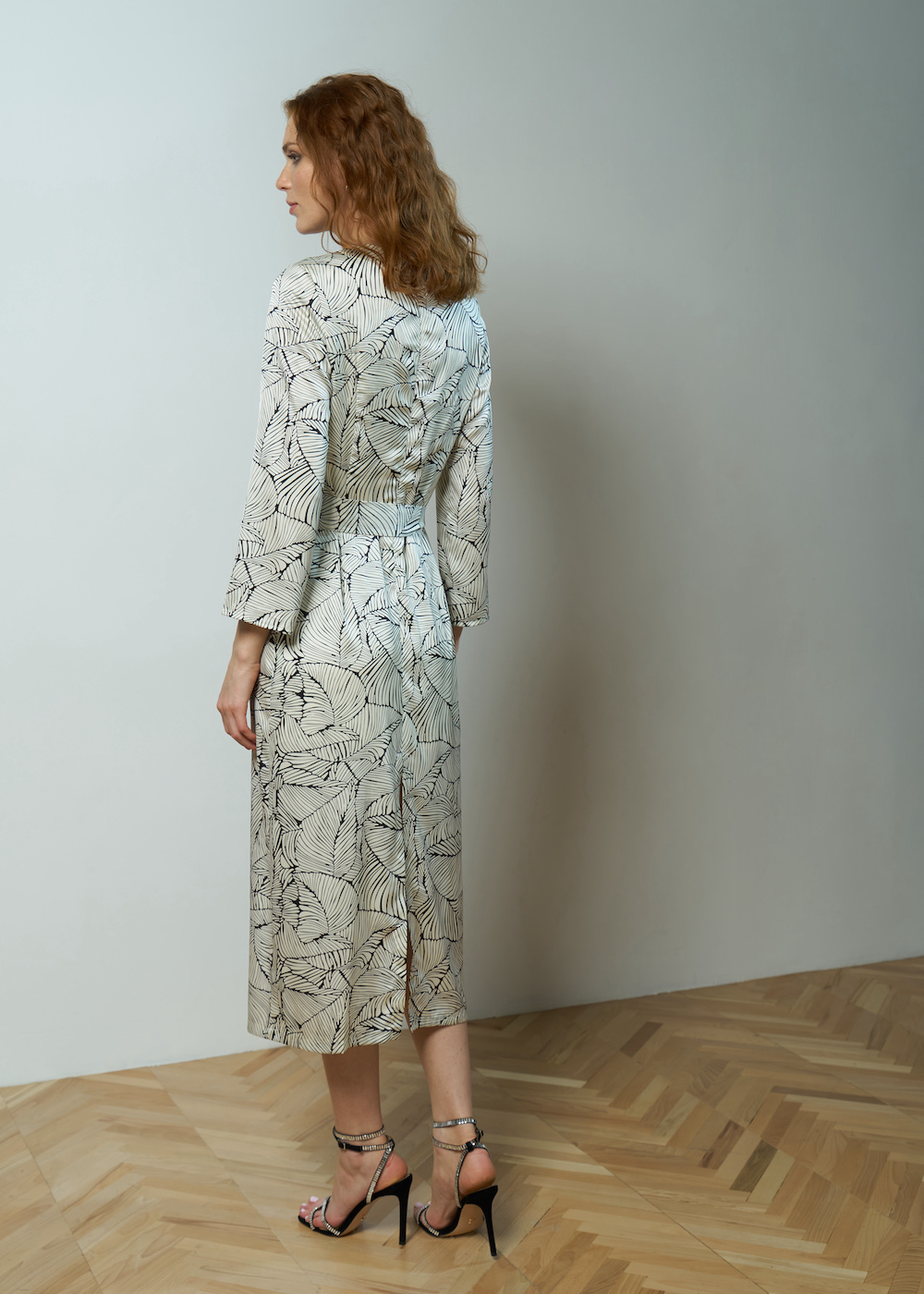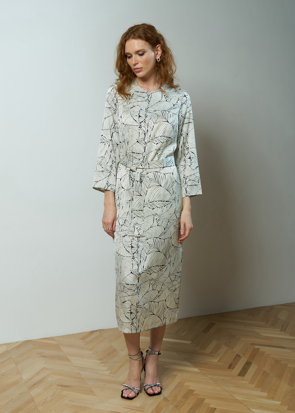 Платье молочное с принтом, длины миди. Рукав 5/8 длины, без манжет. Модель прямого силуэта с разрезом сзади. Платье с круглым вырезом с застежкой на спине. Широкий пояс в комплекте.