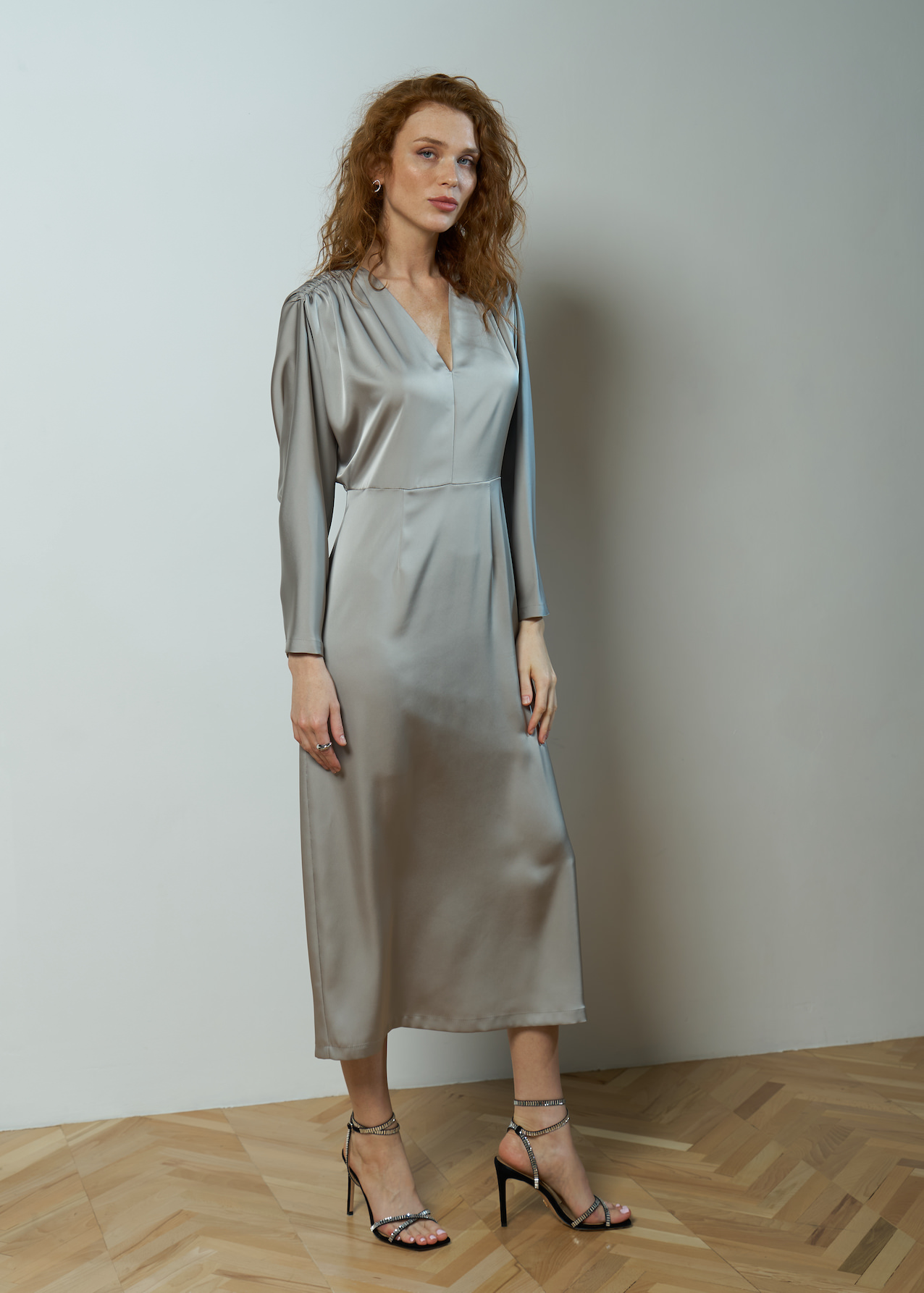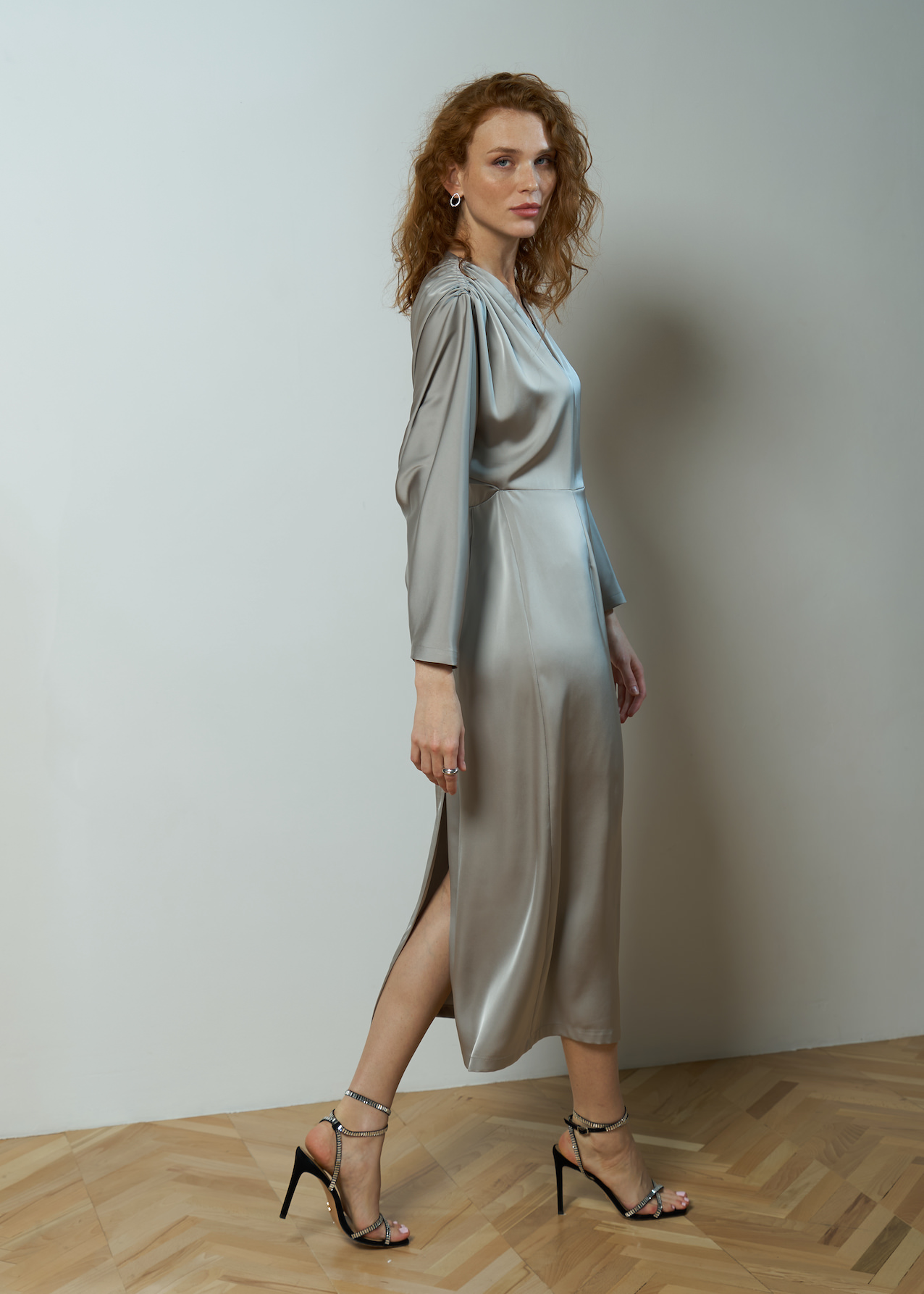 Платье серебро вечернее длины миди. Рукав полной длины без манжеты. Модель из ткани с металлическим блеском и акцентной драпировкой на плечах. Подчёркнутая линия талии, V-образный вырез без застежки. Без пояса.