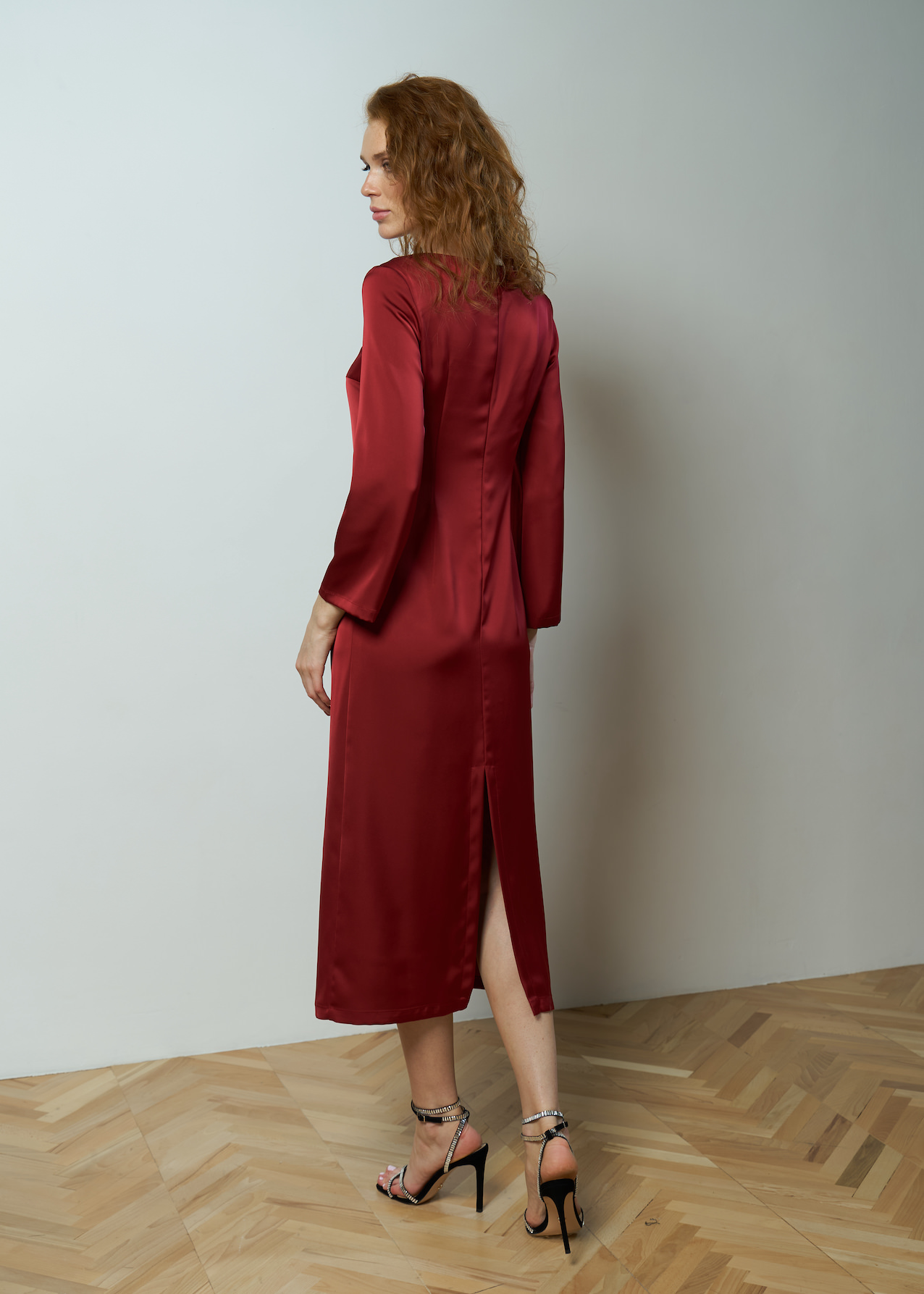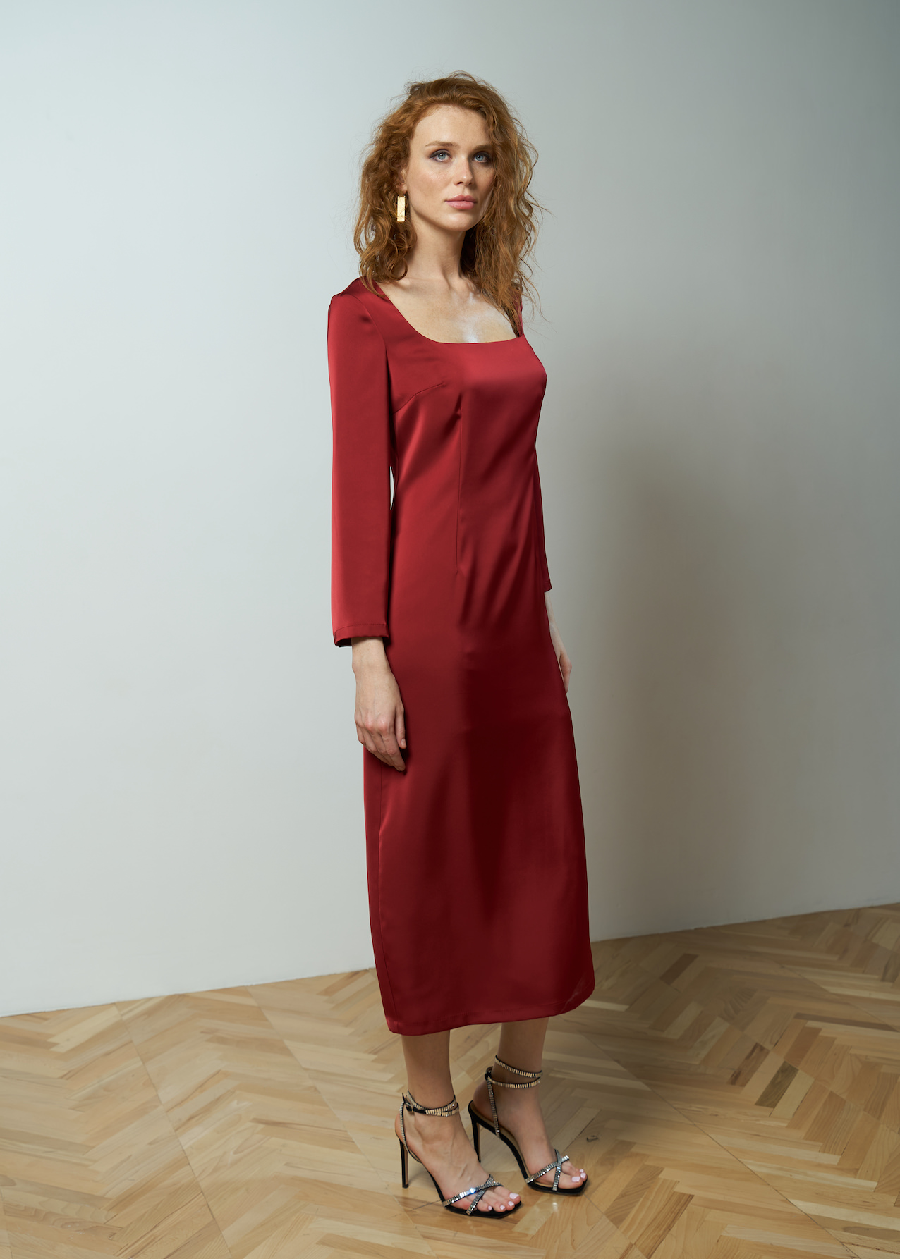 Платье с вырезом каре, длины миди. Рукав полной длины без манжеты. Однотонная, женственная модель приталенного силуэта с разрезом сзади. Застежка на пуговку на спине, без пояса.