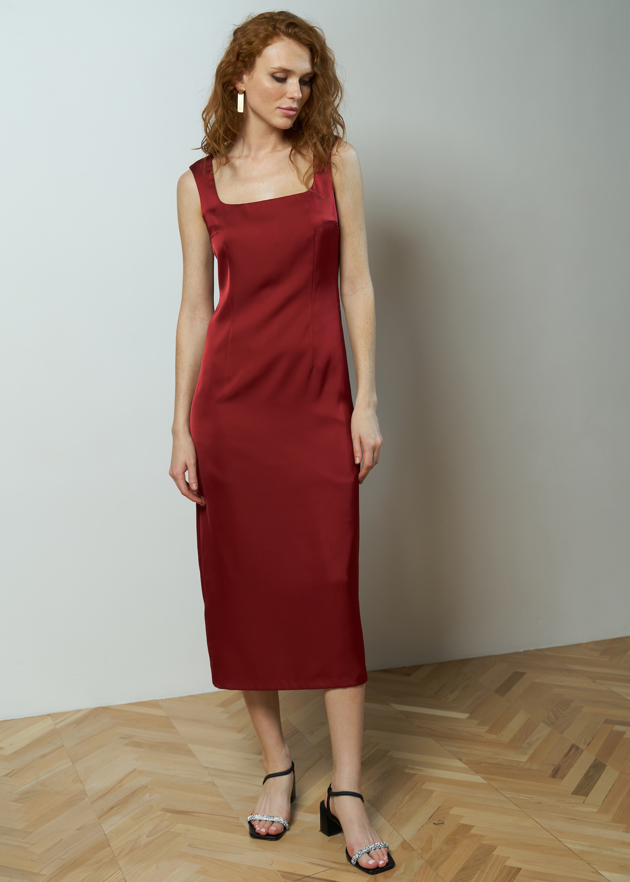 Платье красное женское без рукавов на широких бретелях. Модель длины миди приталенного силуэта с разрезом сзади. Вырез каре, застежка на потайной молнии на спине.
