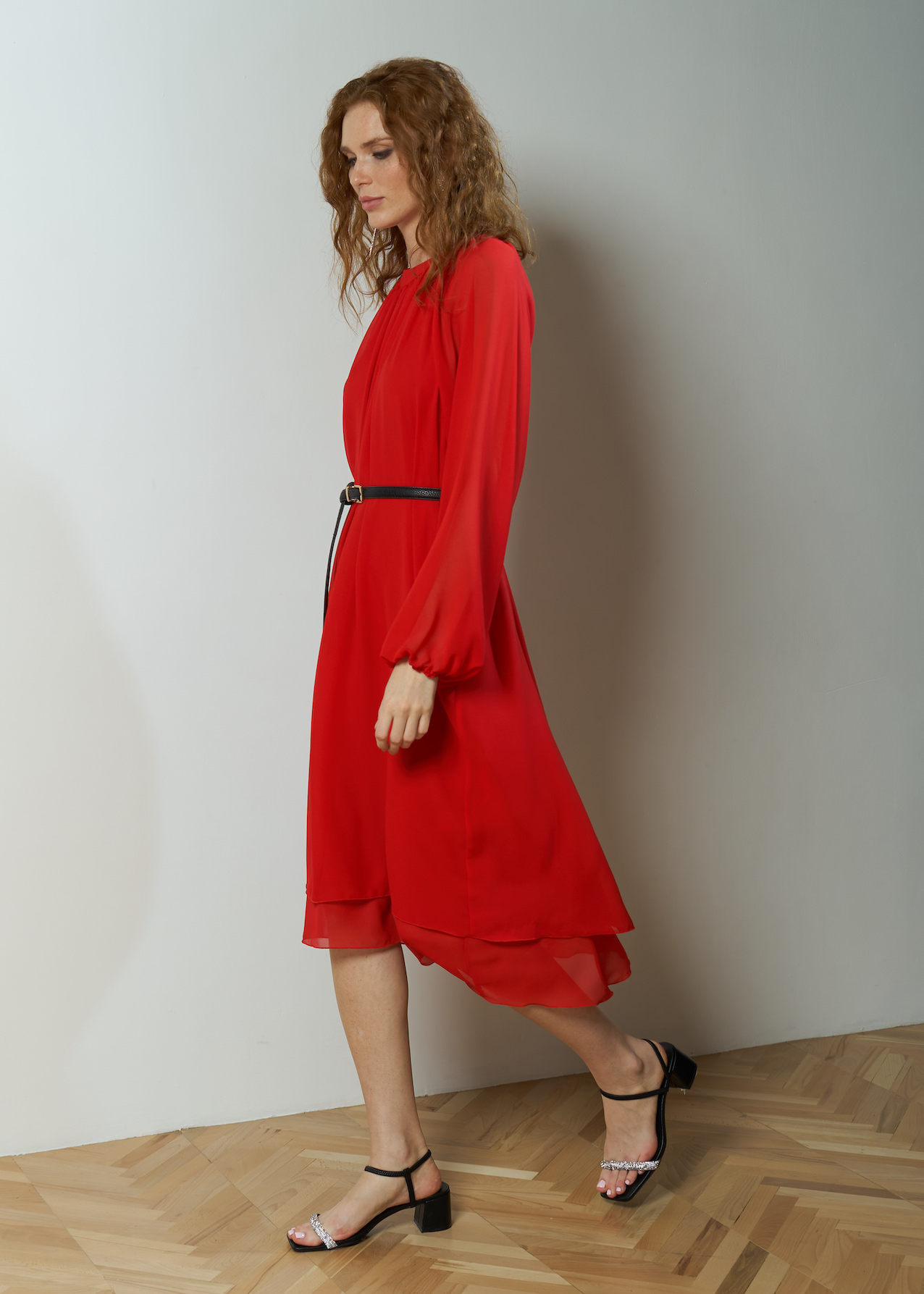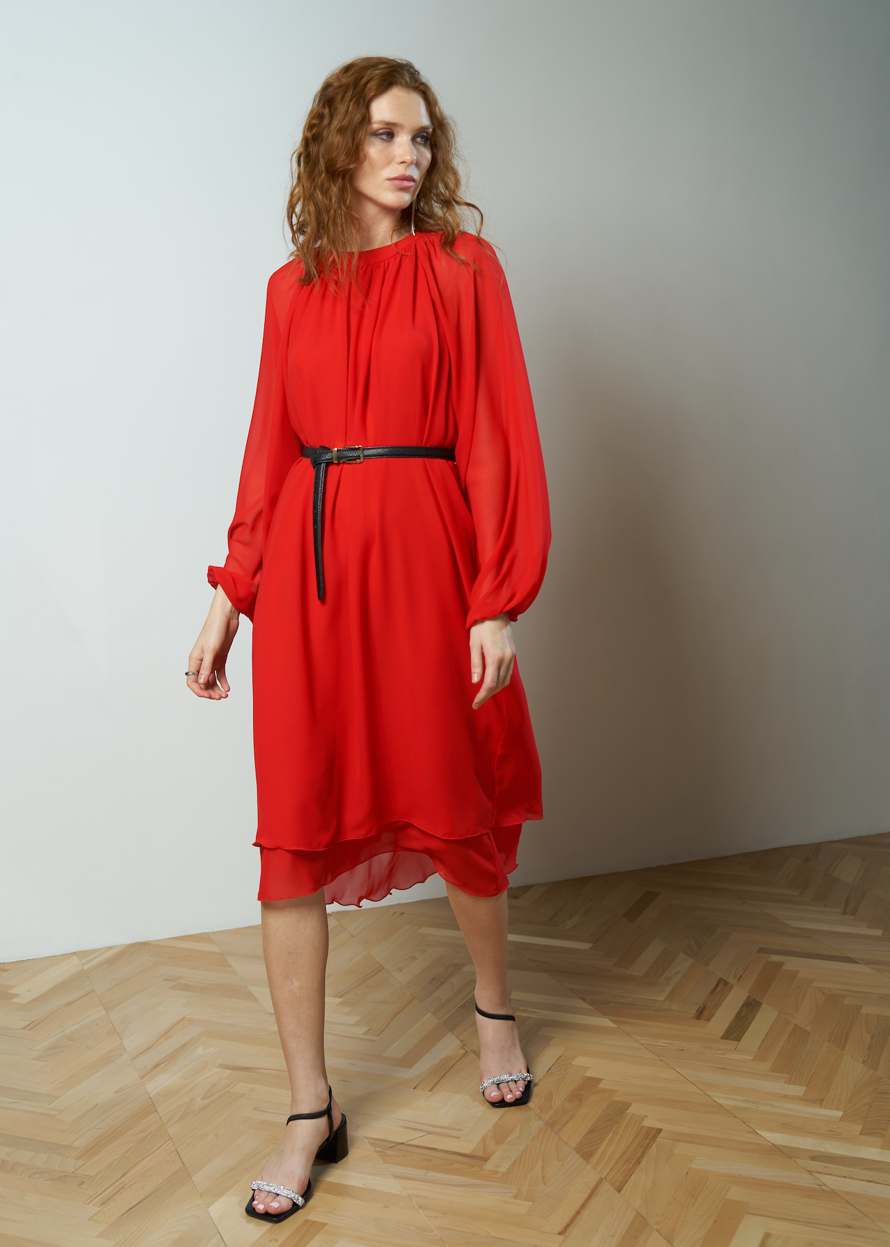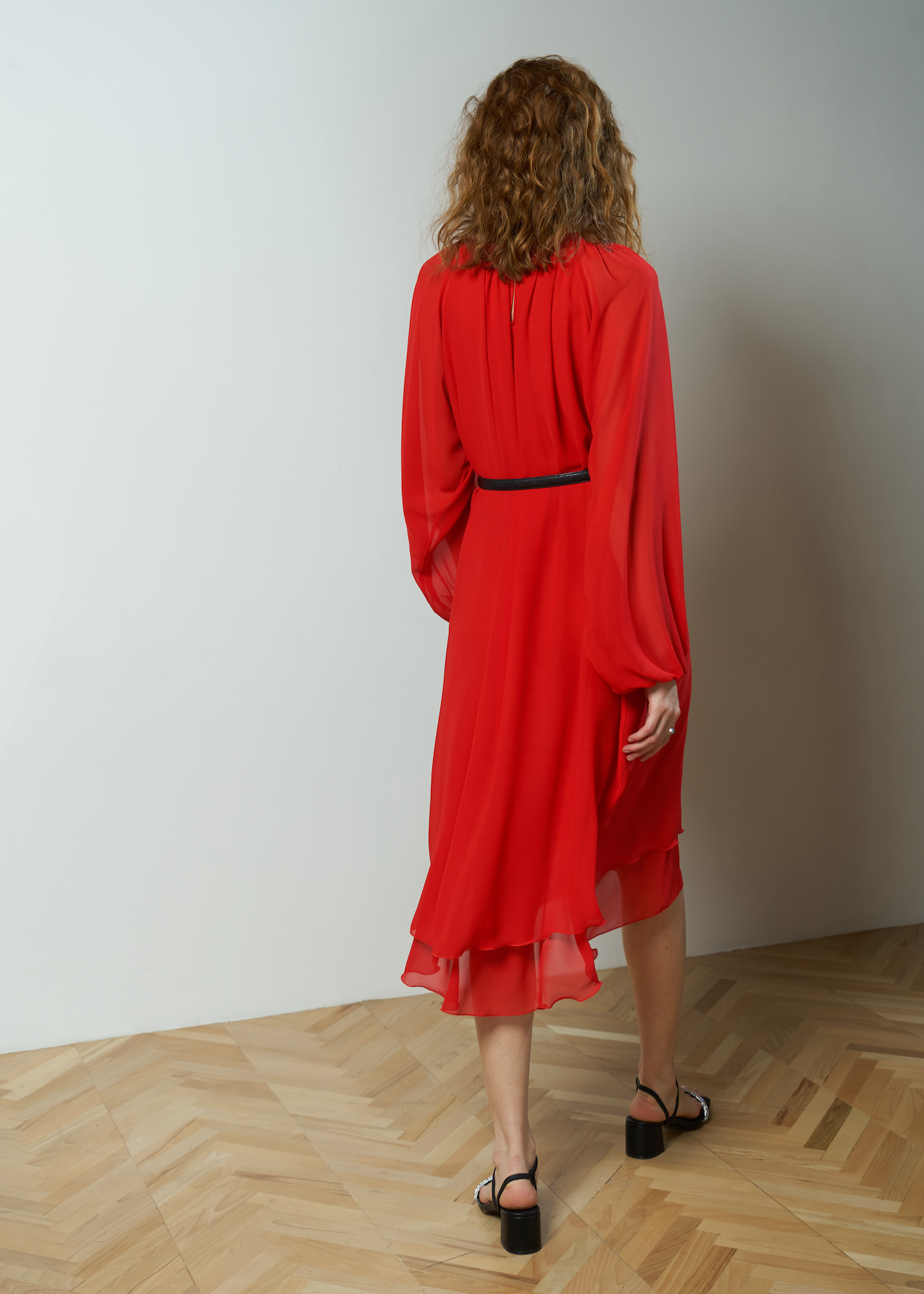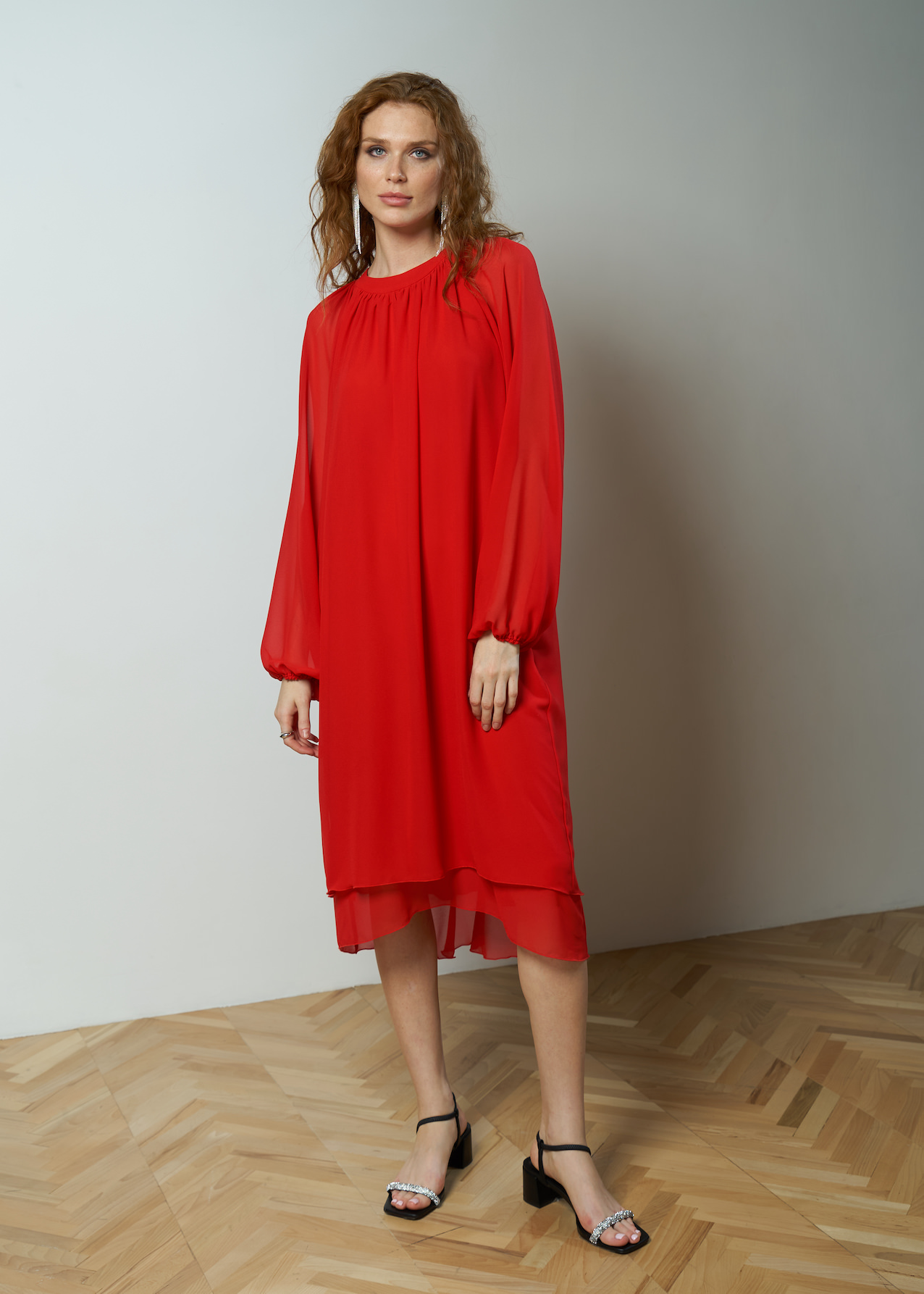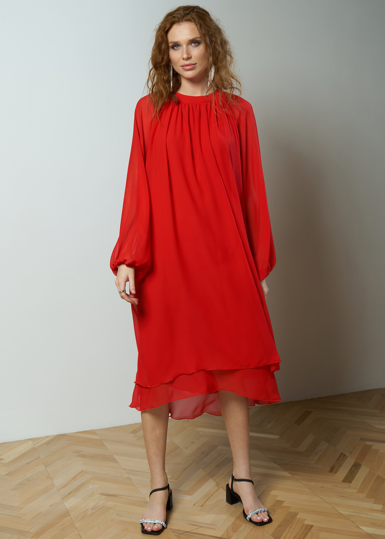 Платье красное воздушное длиной ниже колена. Полупрозрачный рукав фонарик с манжетой на резинке. Двухслойная модель летящего кроя с круглым драпированным воротником на застежке сзади.