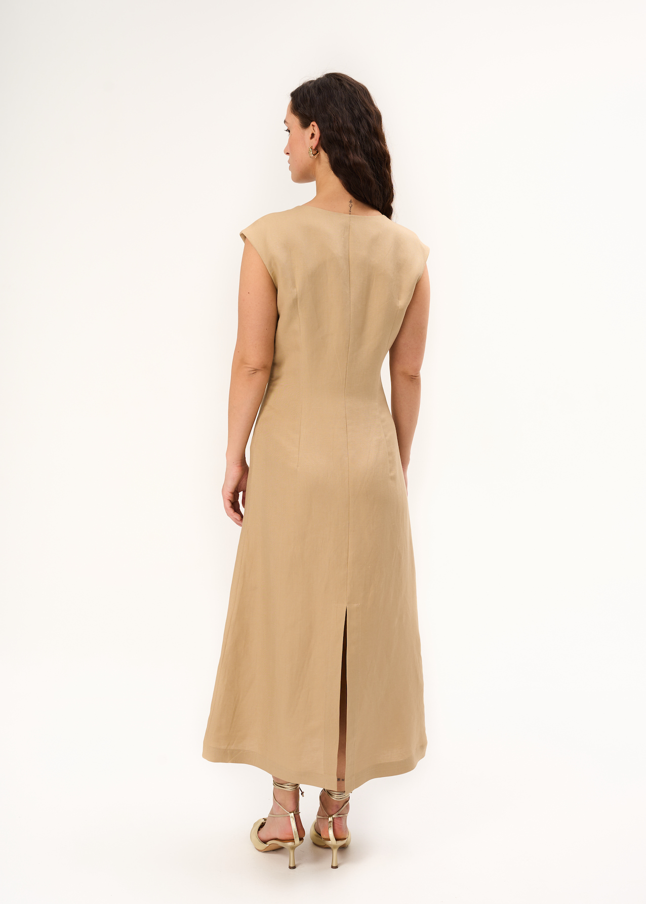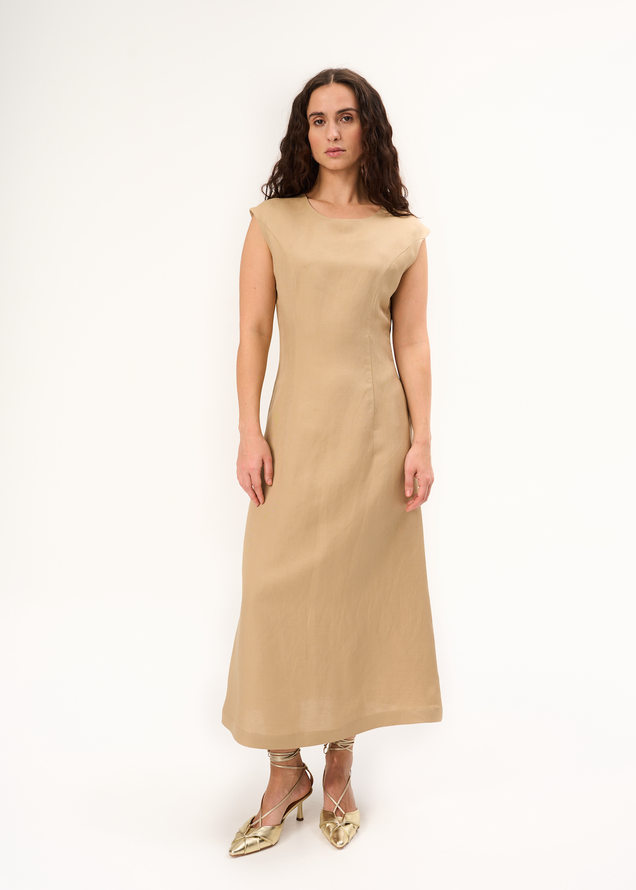 Льняное платье футляр. Модель миди в песочном цвете без рукавов с круглым вырезом. Застежка на молнию.