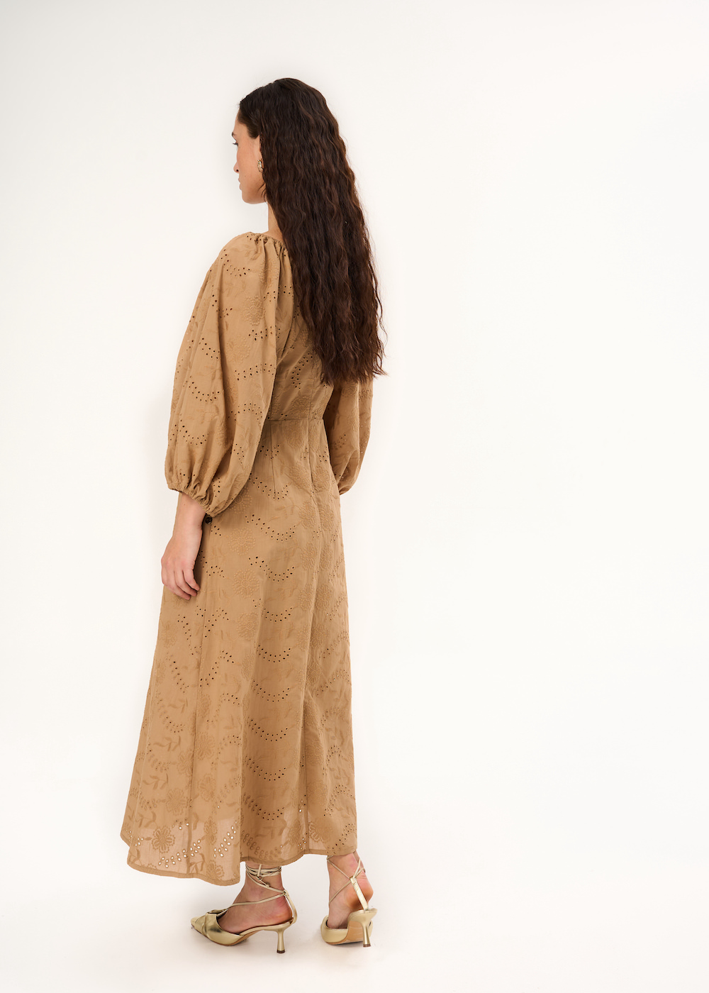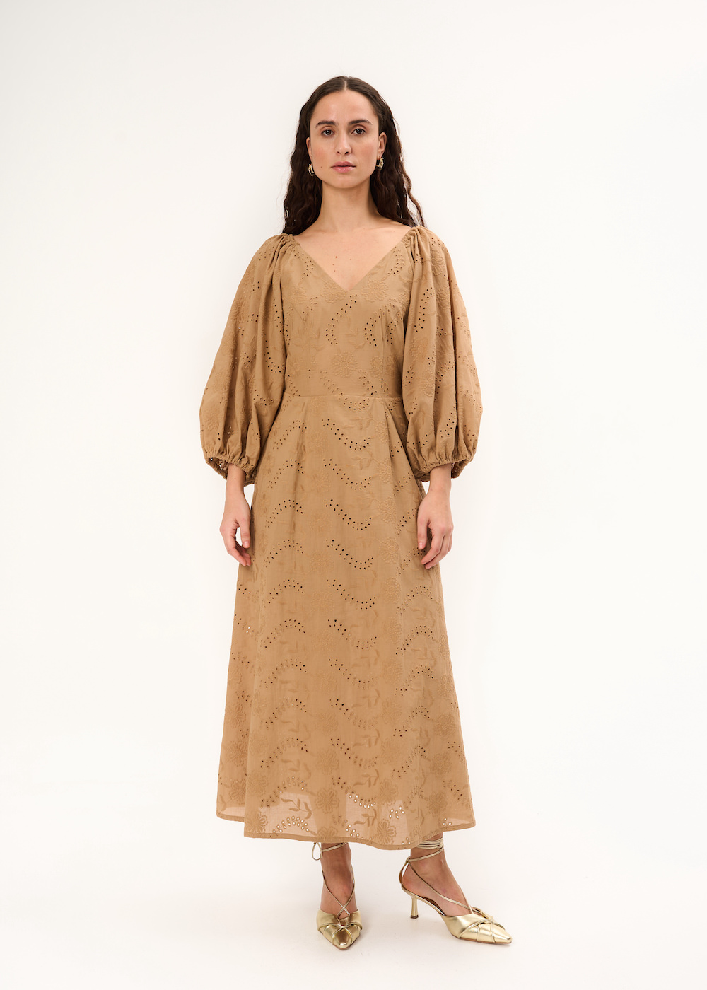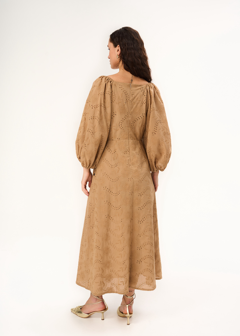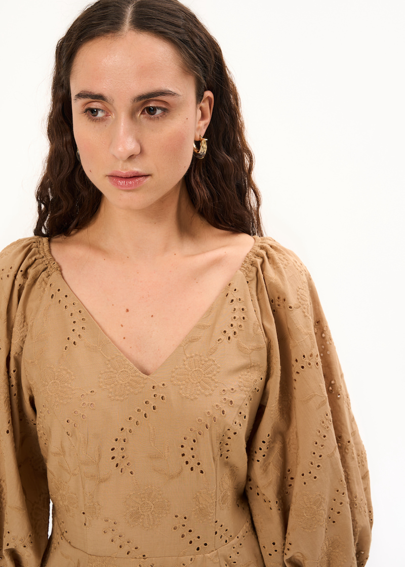 Платье с перфорацией. Модель миди приталенного кроя с подкладом. Платье с рукавами буфами и V-образным вырезом. Застежка на молнию.