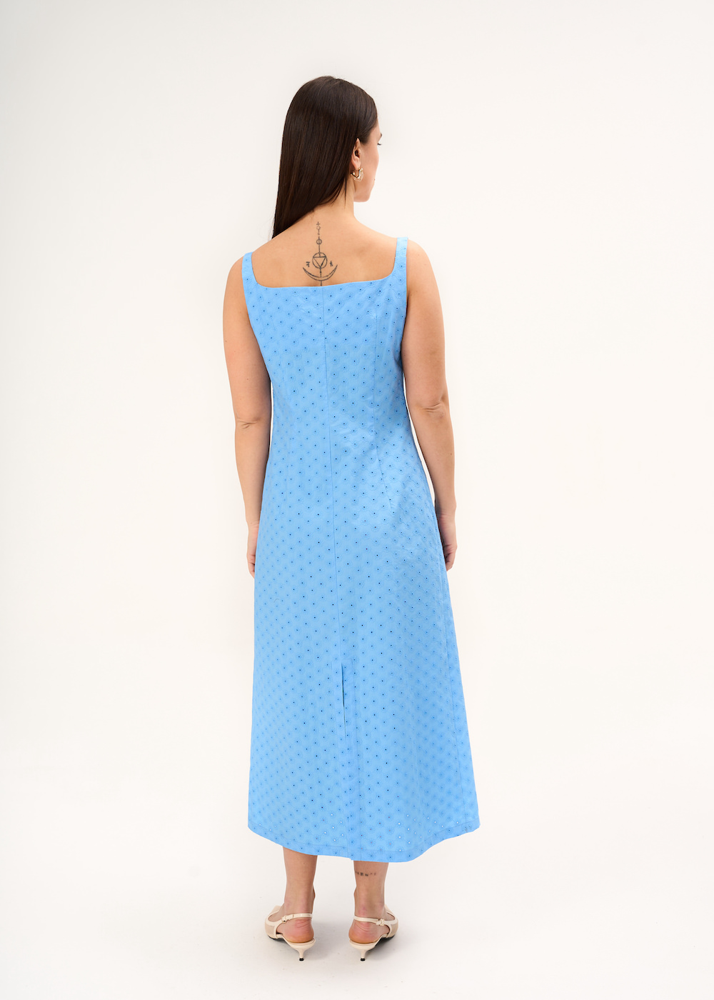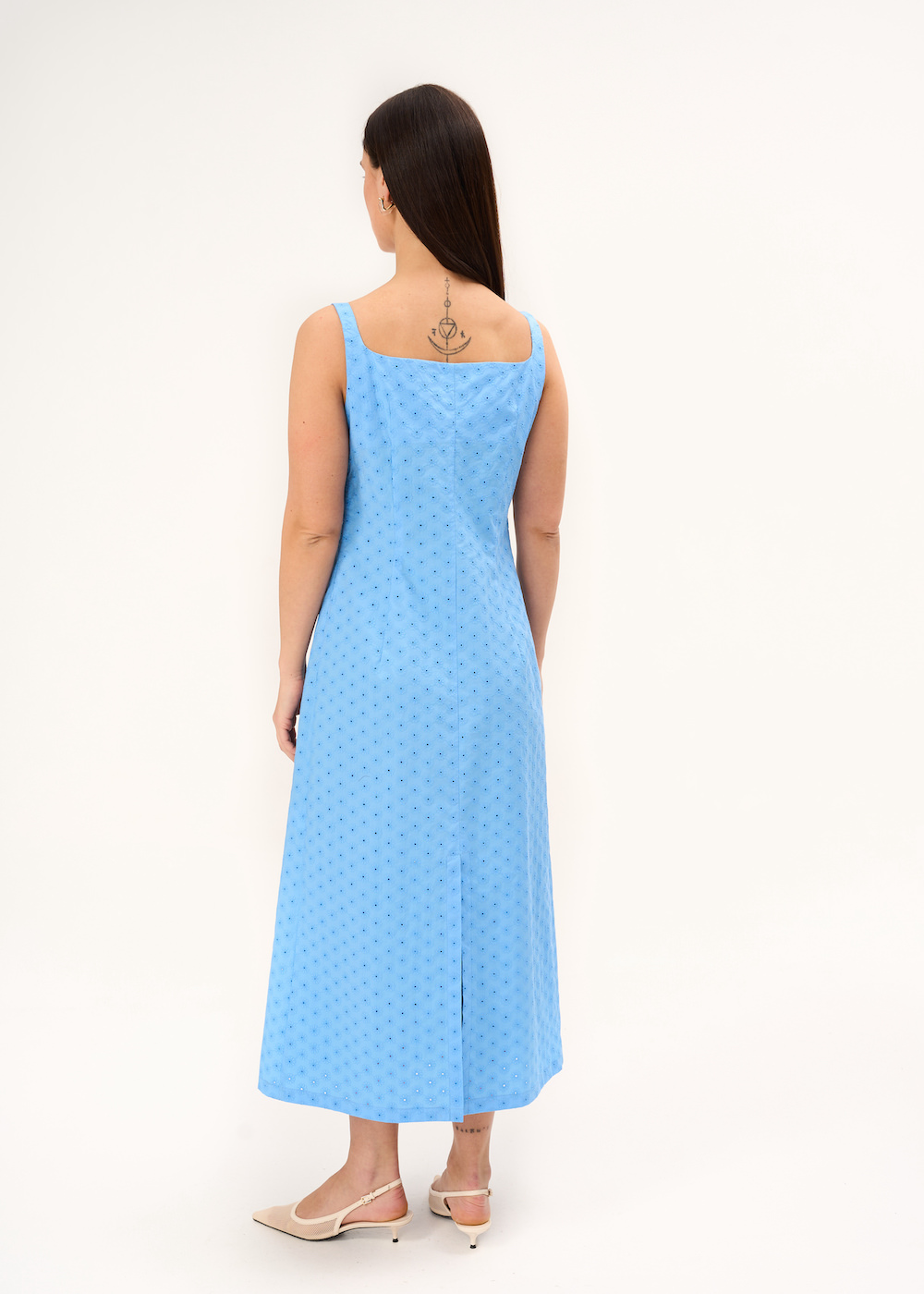 Платье кроше. Модель миди приталенного кроя на бретелях. Платье с глубоким вырезом каре и застежкой на молнию.