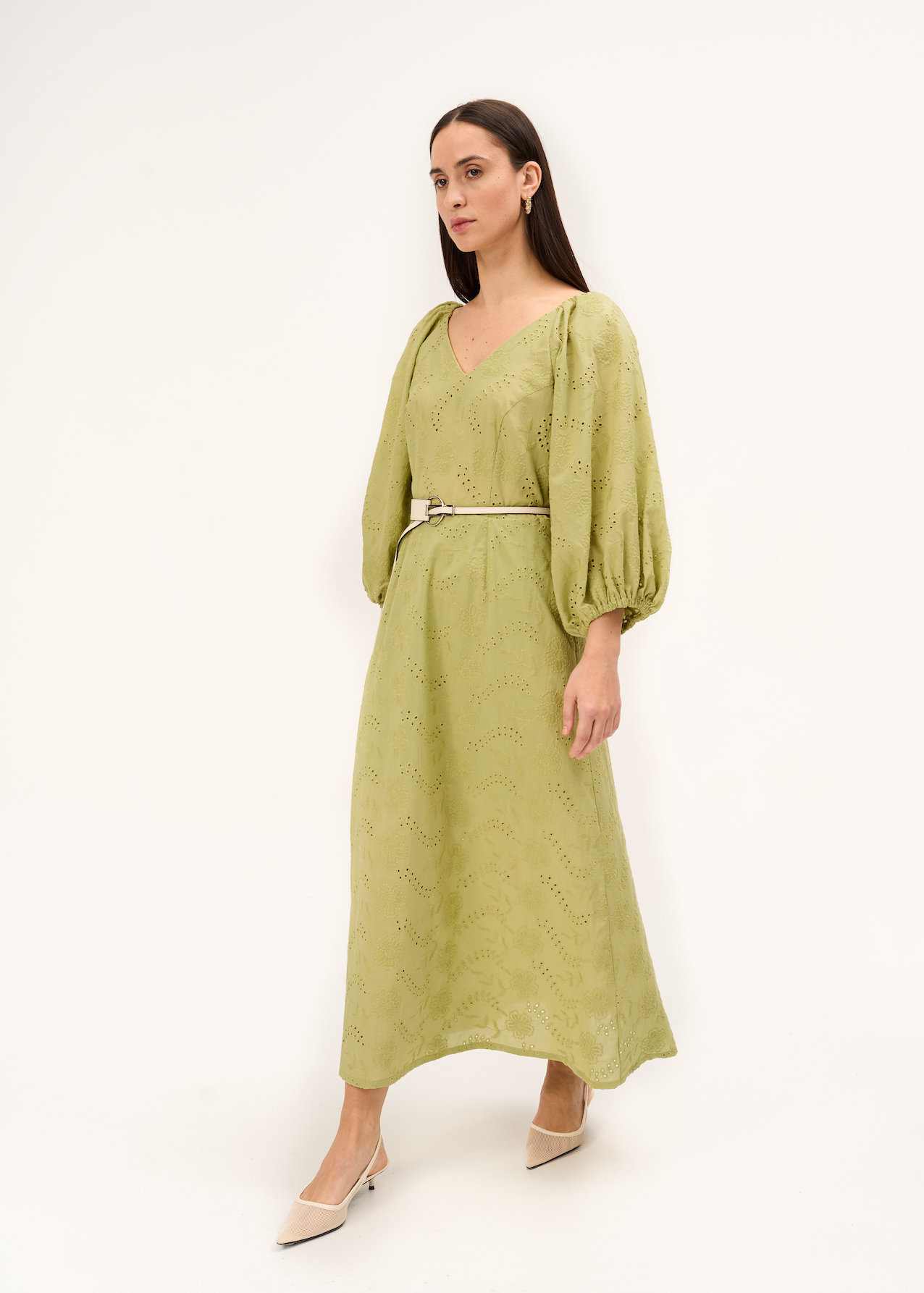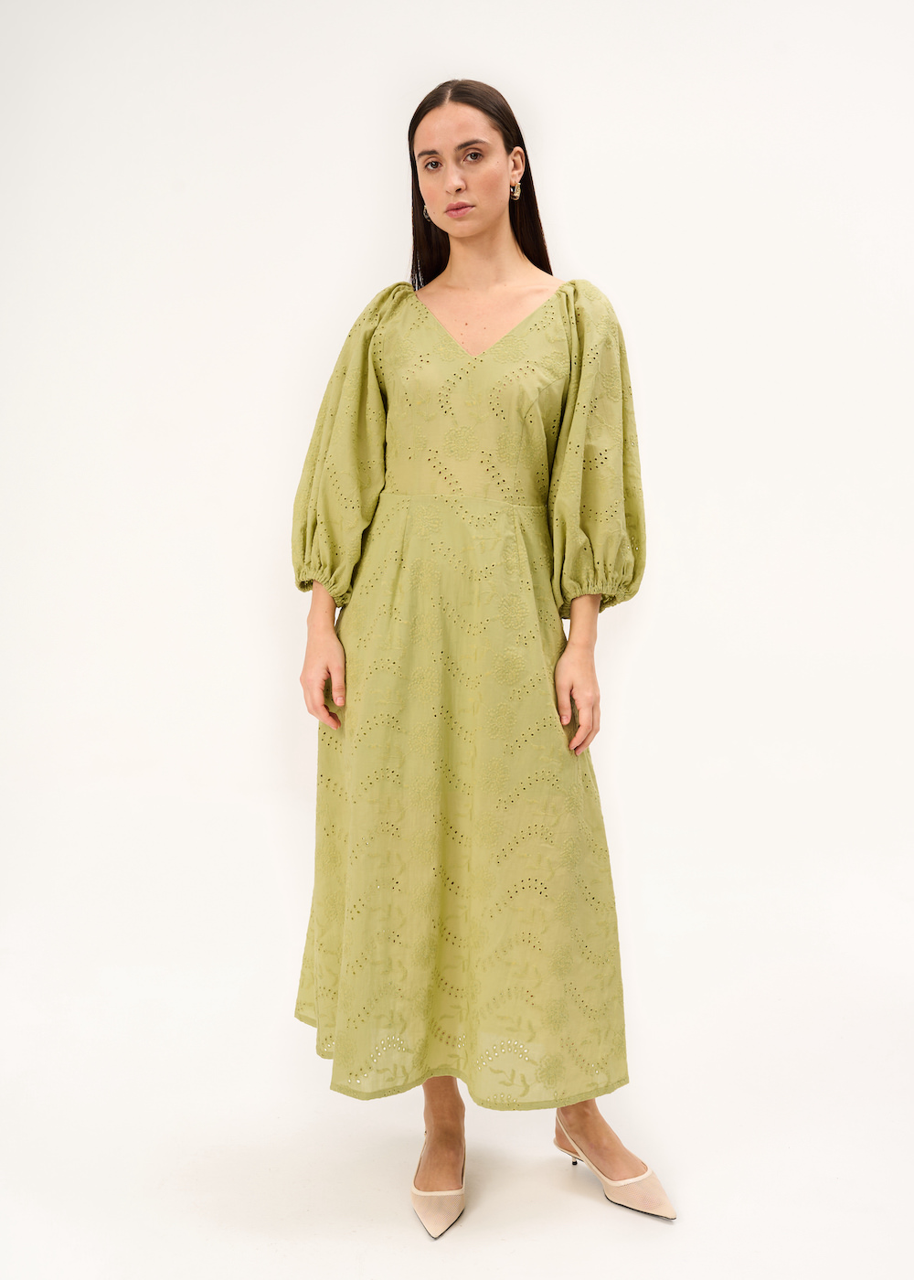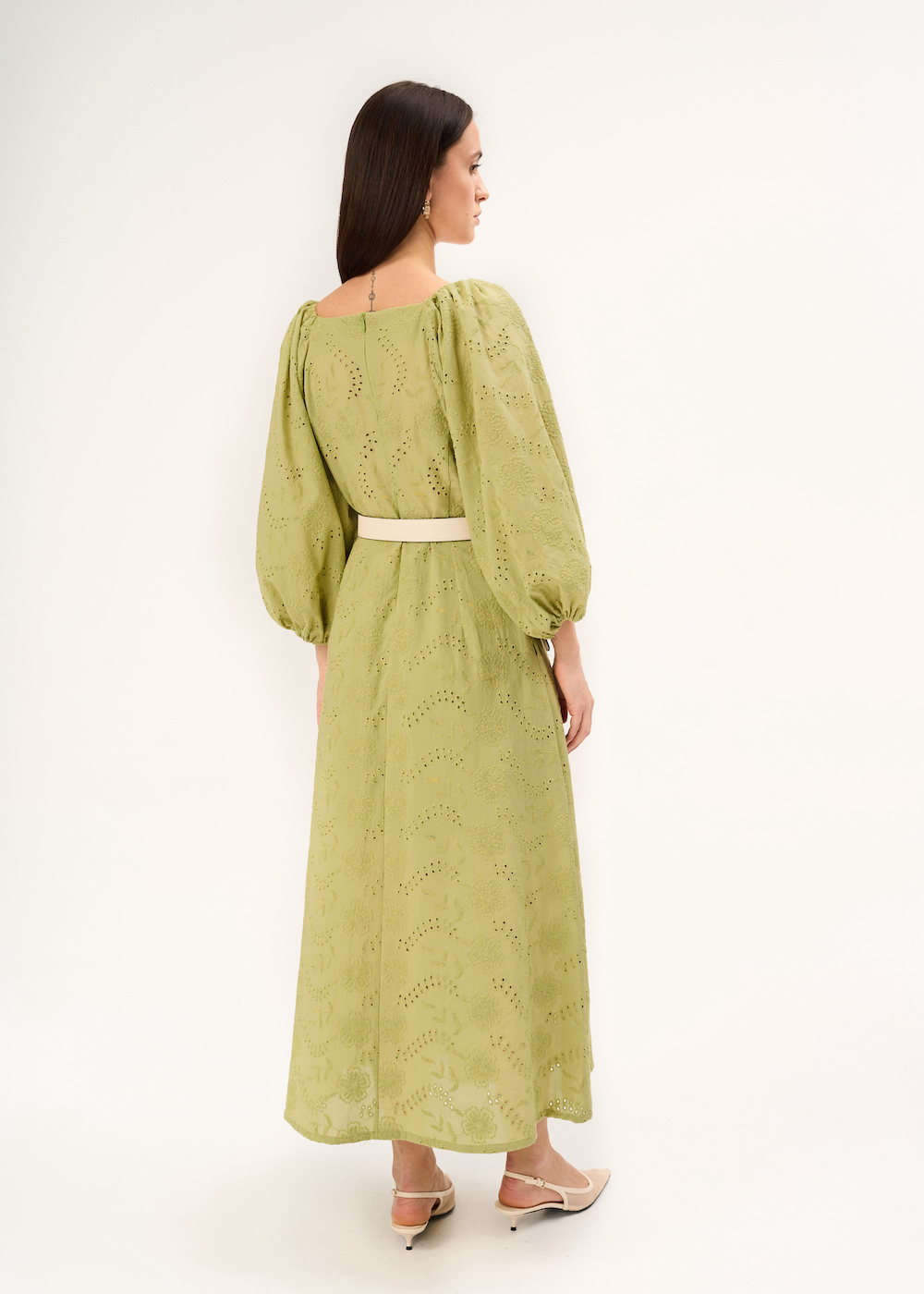 Платье хлопковое кроше. Модель миди приталенного кроя с подкладом. Платье с рукавами буфами и V-образным вырезом. На молнии.