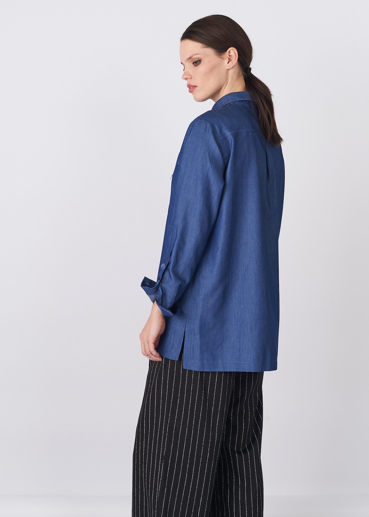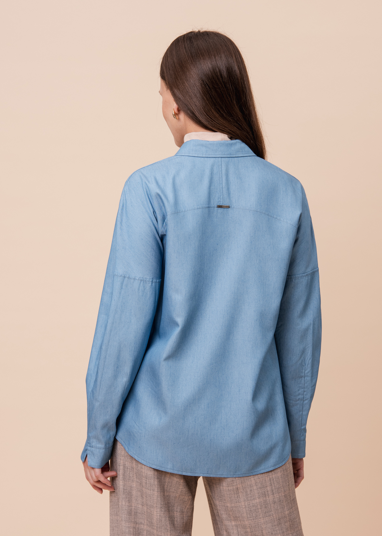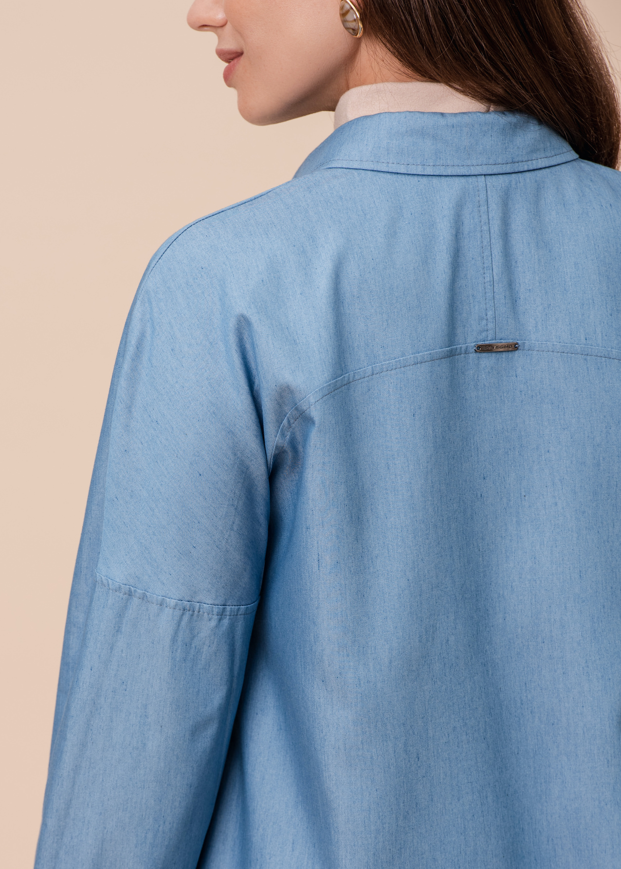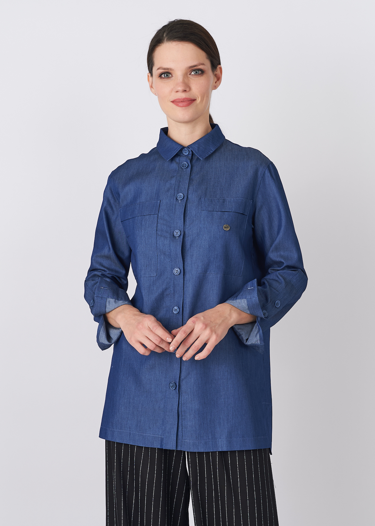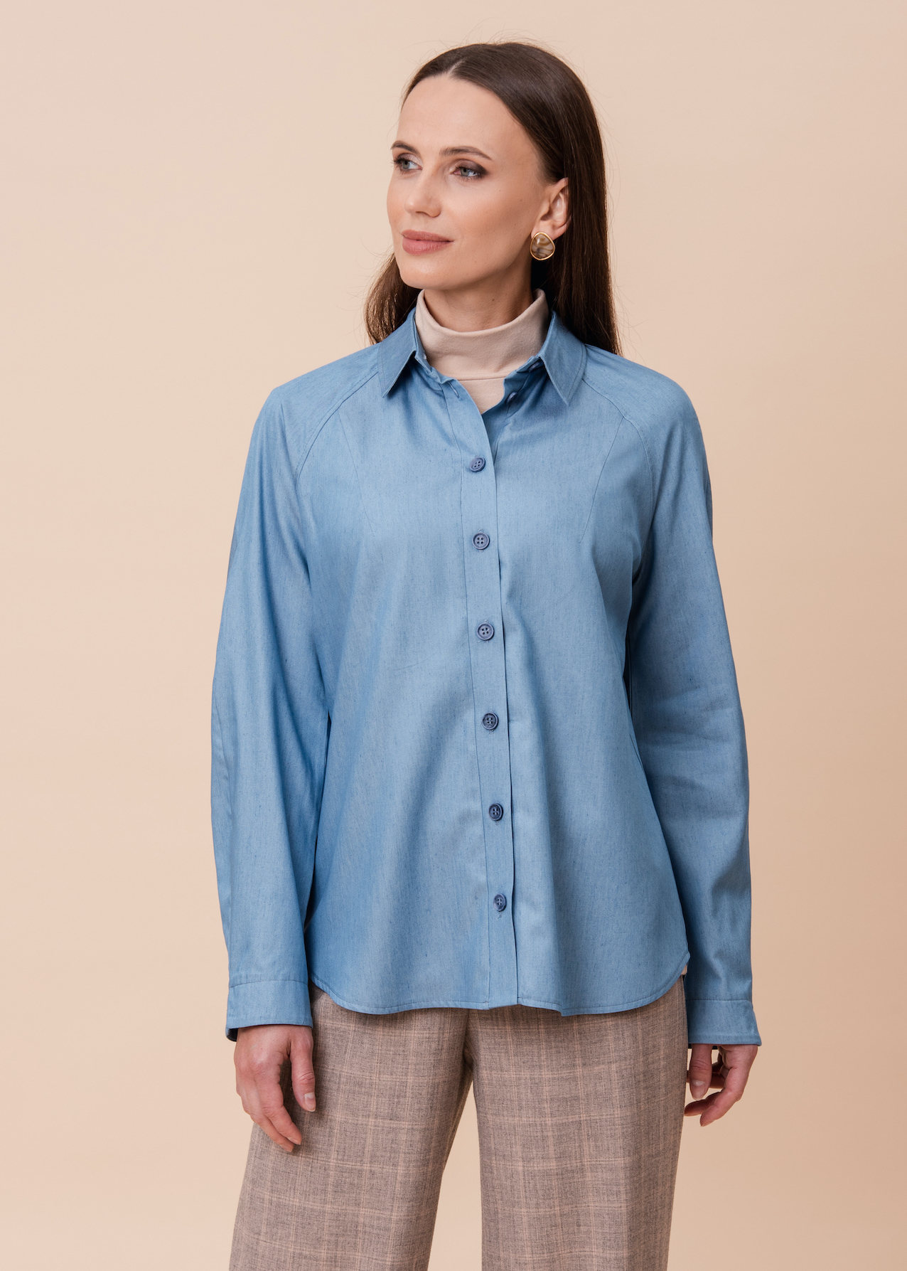 Рубашка из тенселя с эффектом денима с отложным воротничком. Накладные карманы на груди. Спереди застежка на пуговицы, длинный рукав с манжетом на пуговицах.