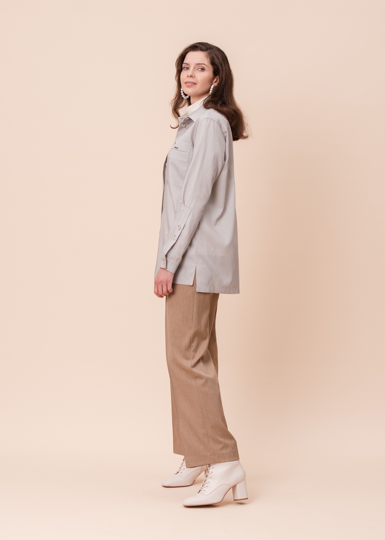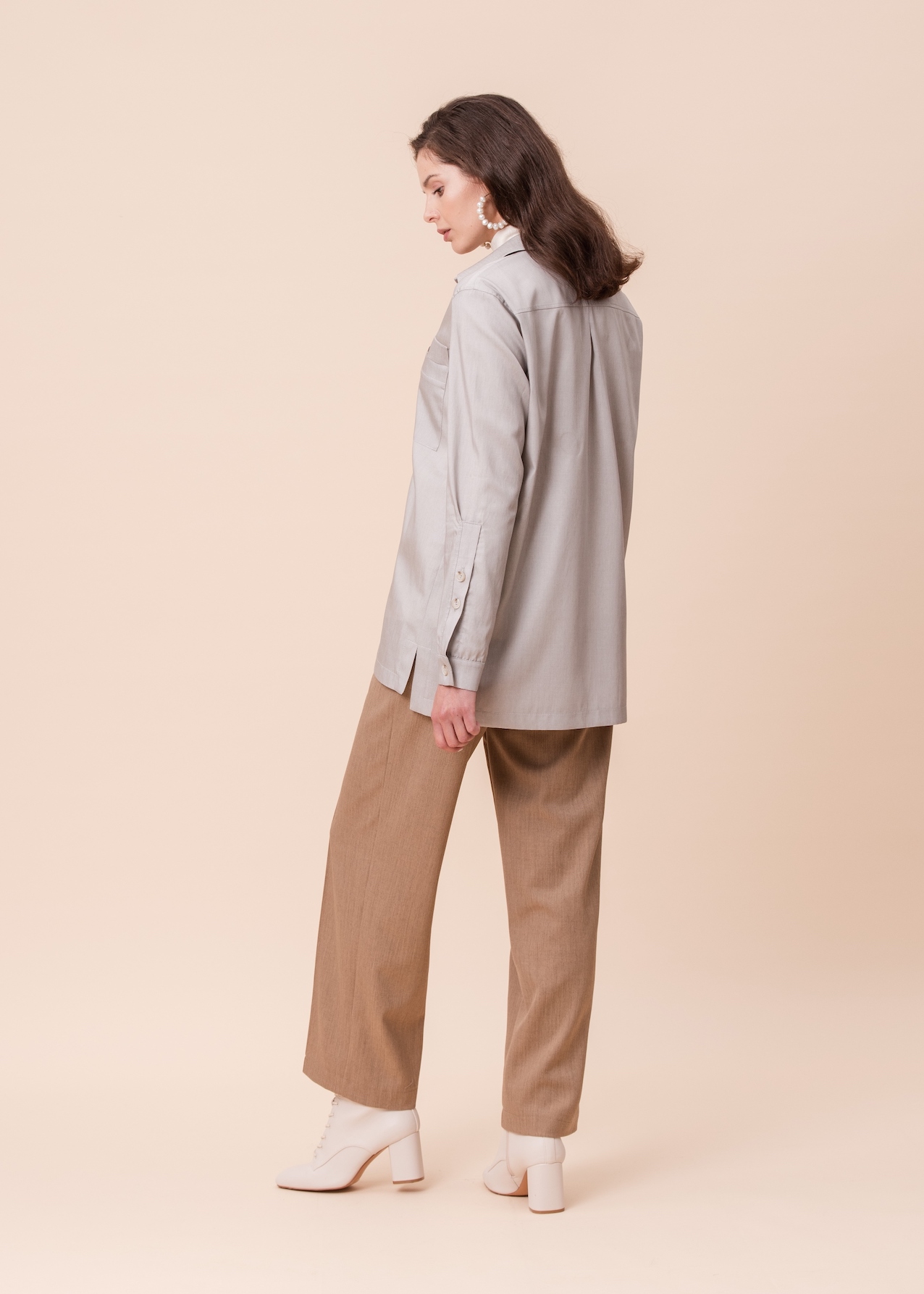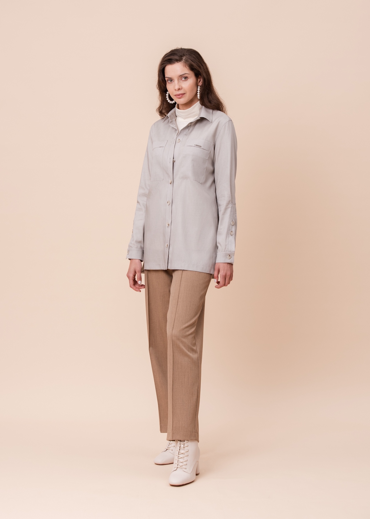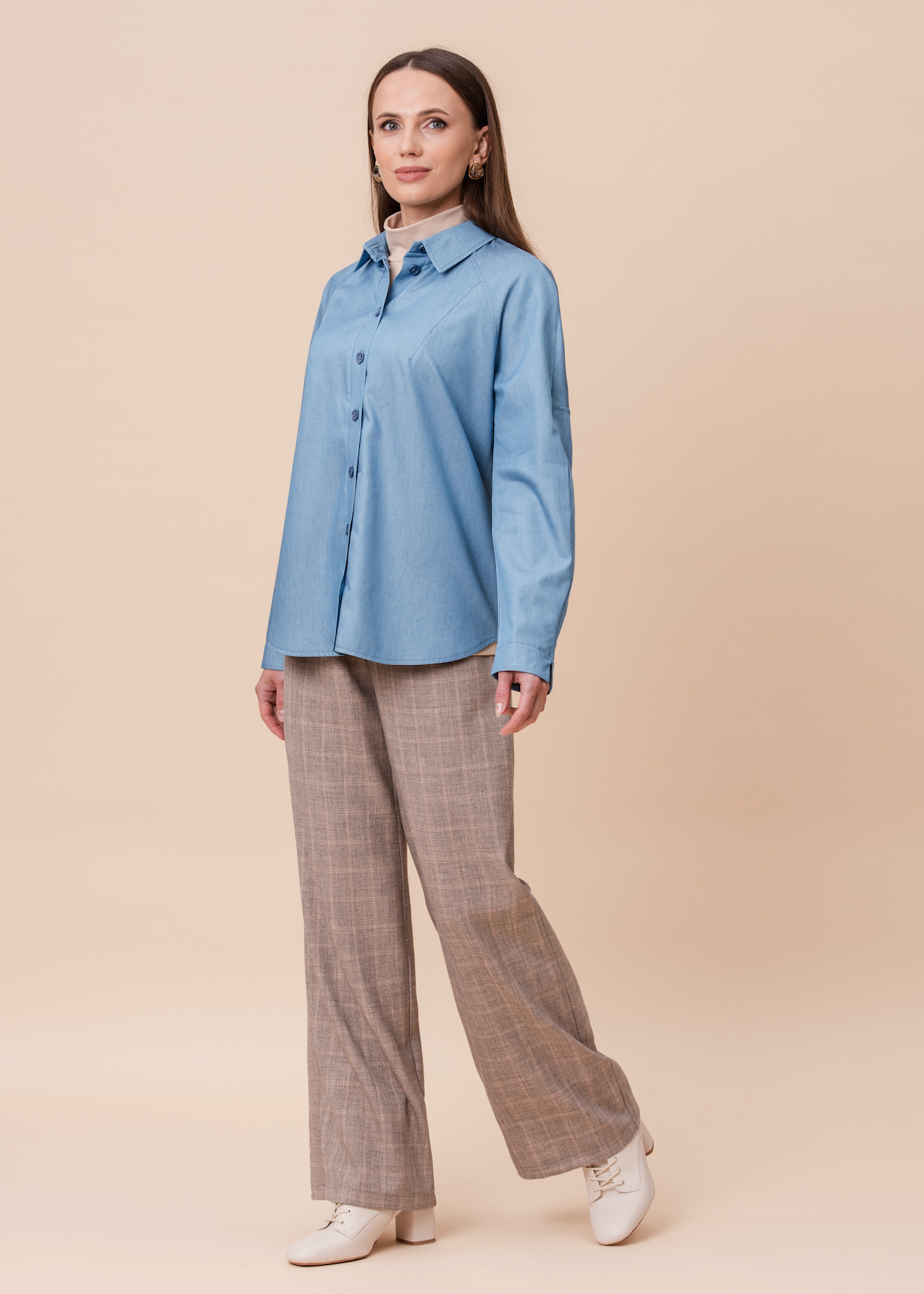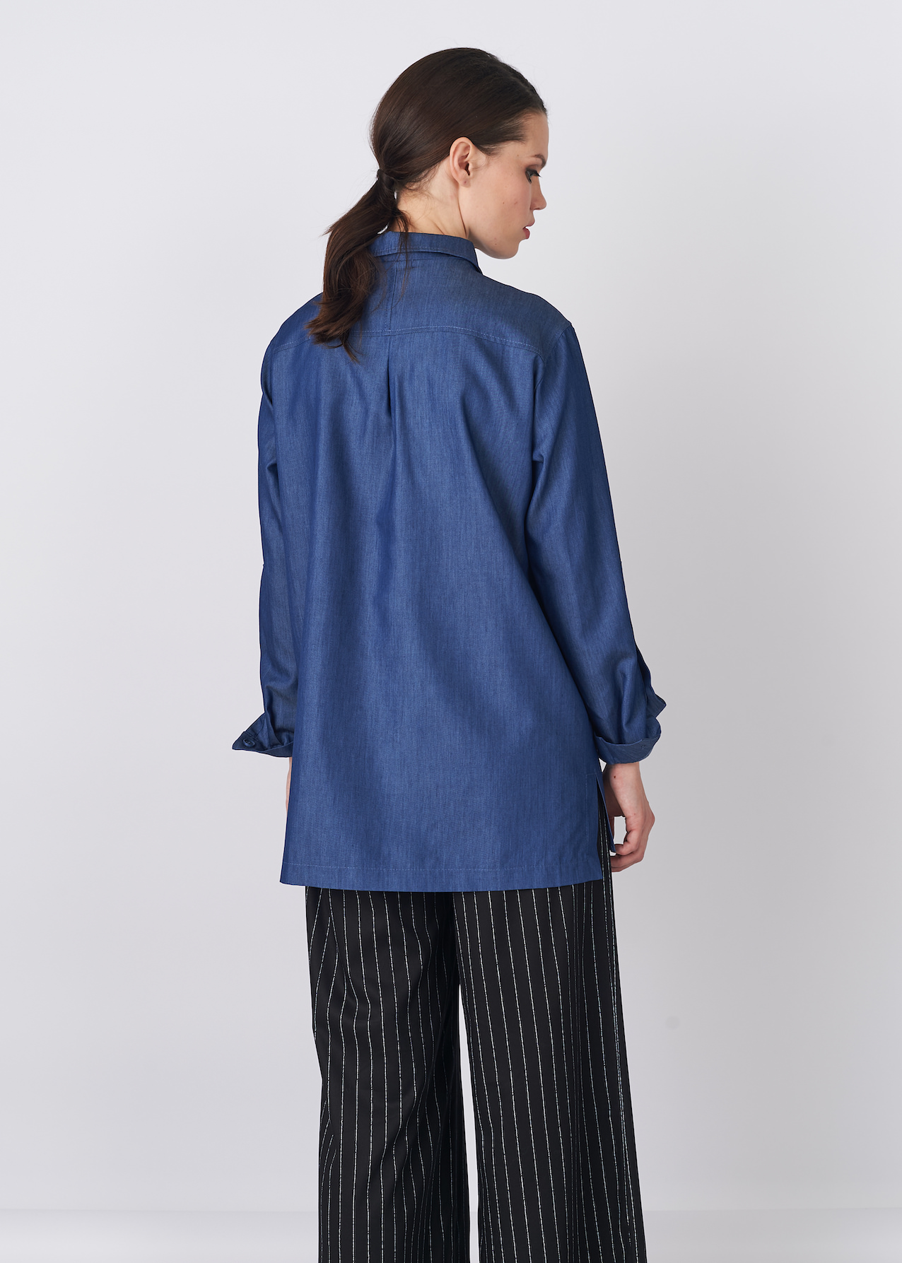 Рубашка из тенселя с эффектом денима с отложным воротничком. Накладные карманы на груди. Спереди застежка на пуговицы, длинный рукав с манжетом на пуговицах.