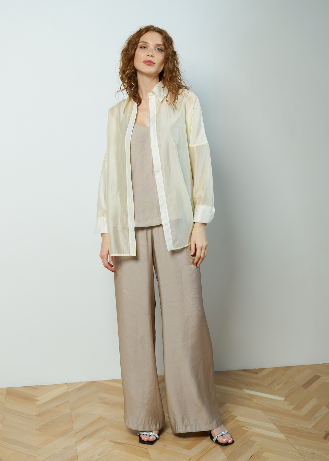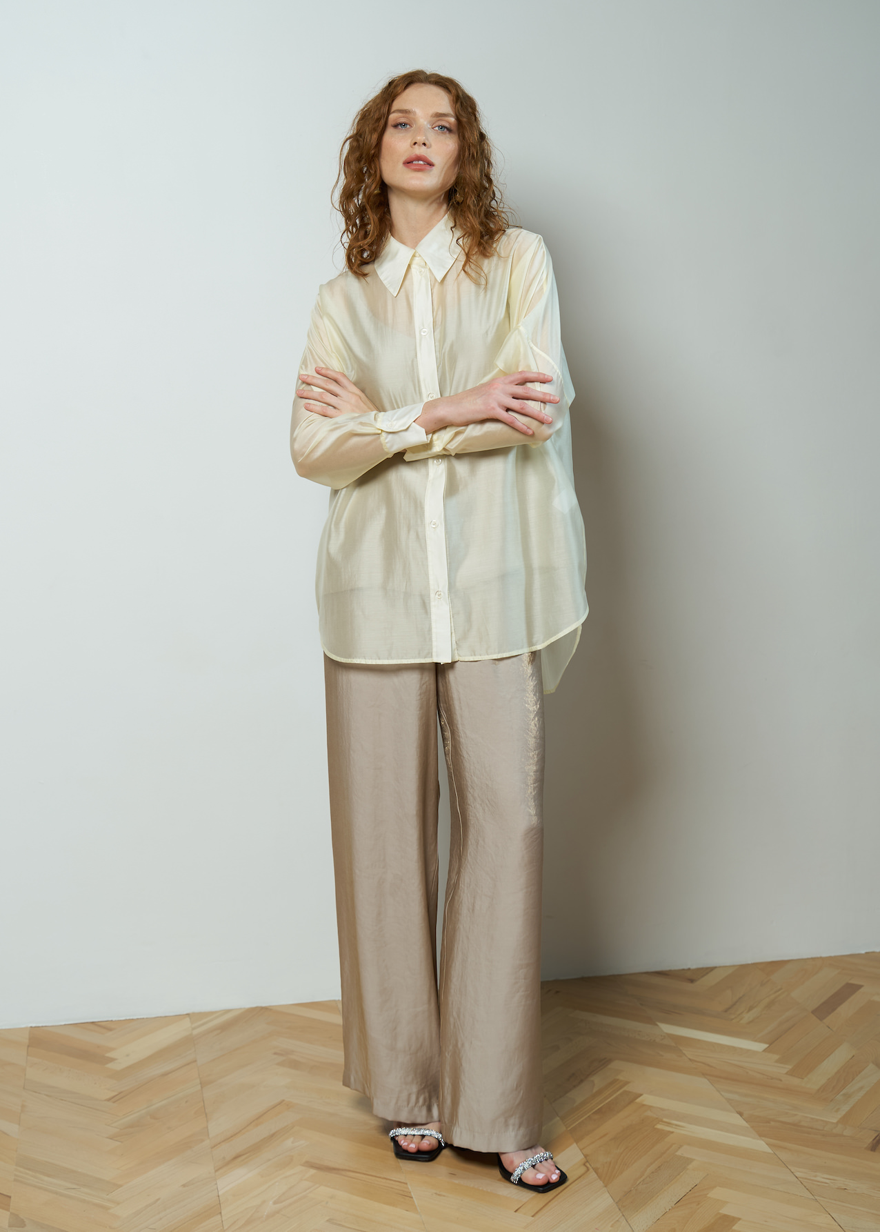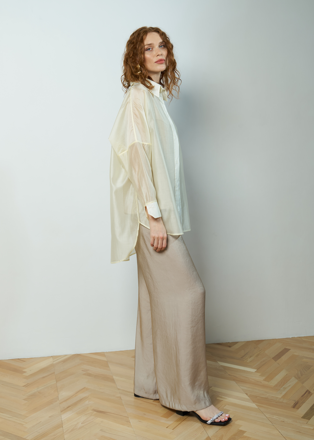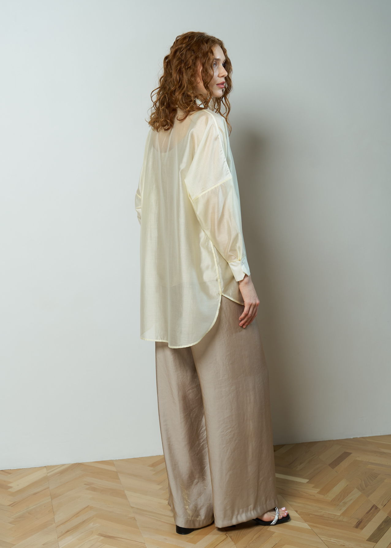 Рубашка полупрозрачная удлиненная со спущенной линией плеча, рукав полной длины на манжете. Модель с застежками на пуговицы и отложным воротником. Рубашка свободного кроя с разрезами по бокам и удлиненной спинкой.