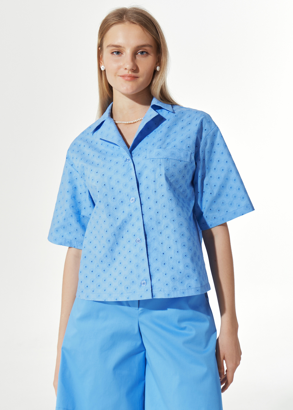 Рубашка с перфорированным узором, укороченная. Модель прямого кроя на пуговках с отложным воротником и широкими рукавами до локтя.