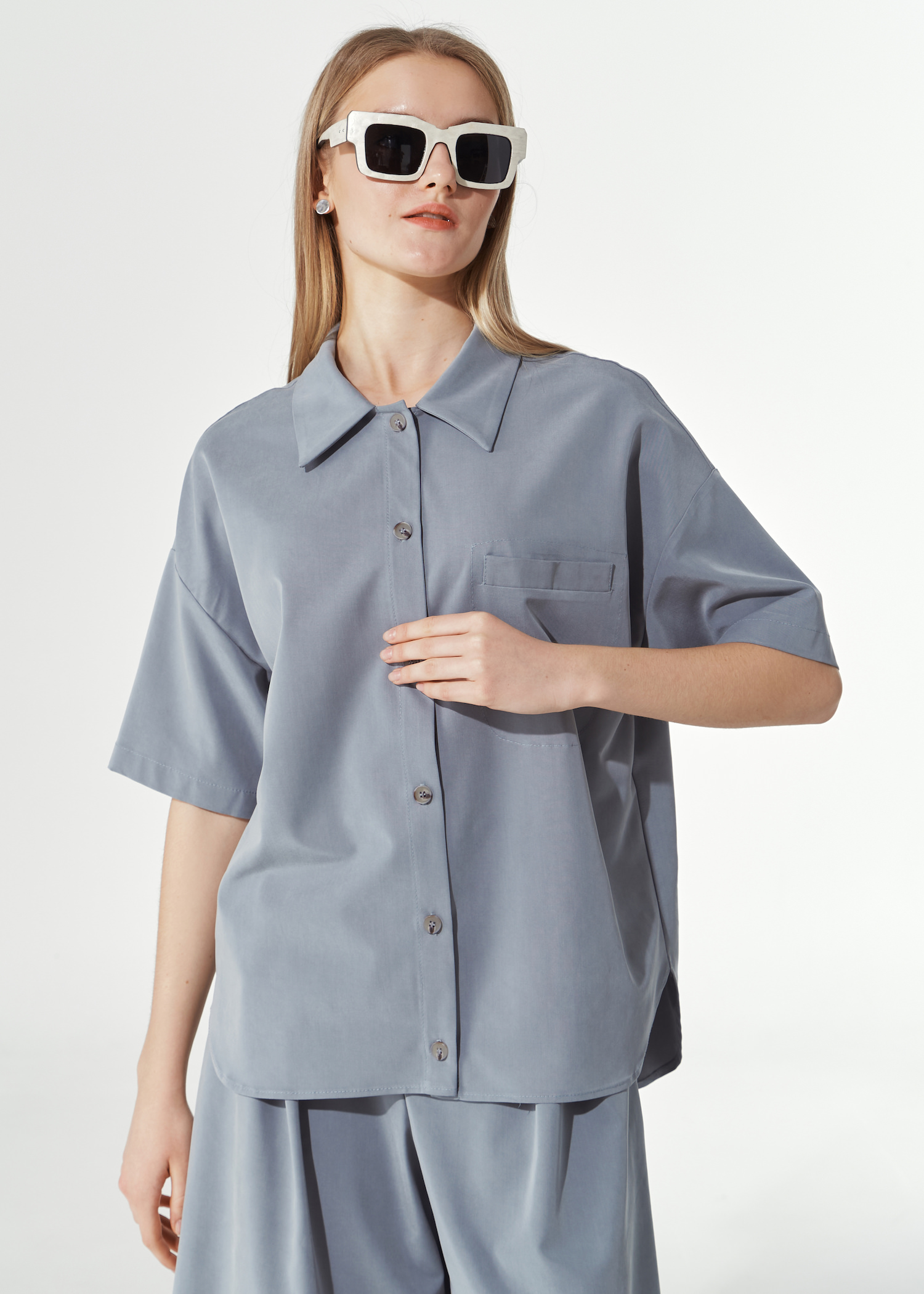 Рубашка с коротким рукавом и спущенной линией плеча. Модель прямого кроя на пуговках и отложным воротником. Удлинённая спинка с разрезами по бокам и вертикальным швом.