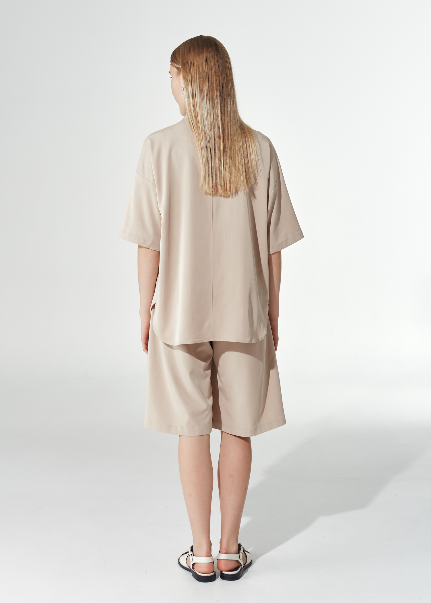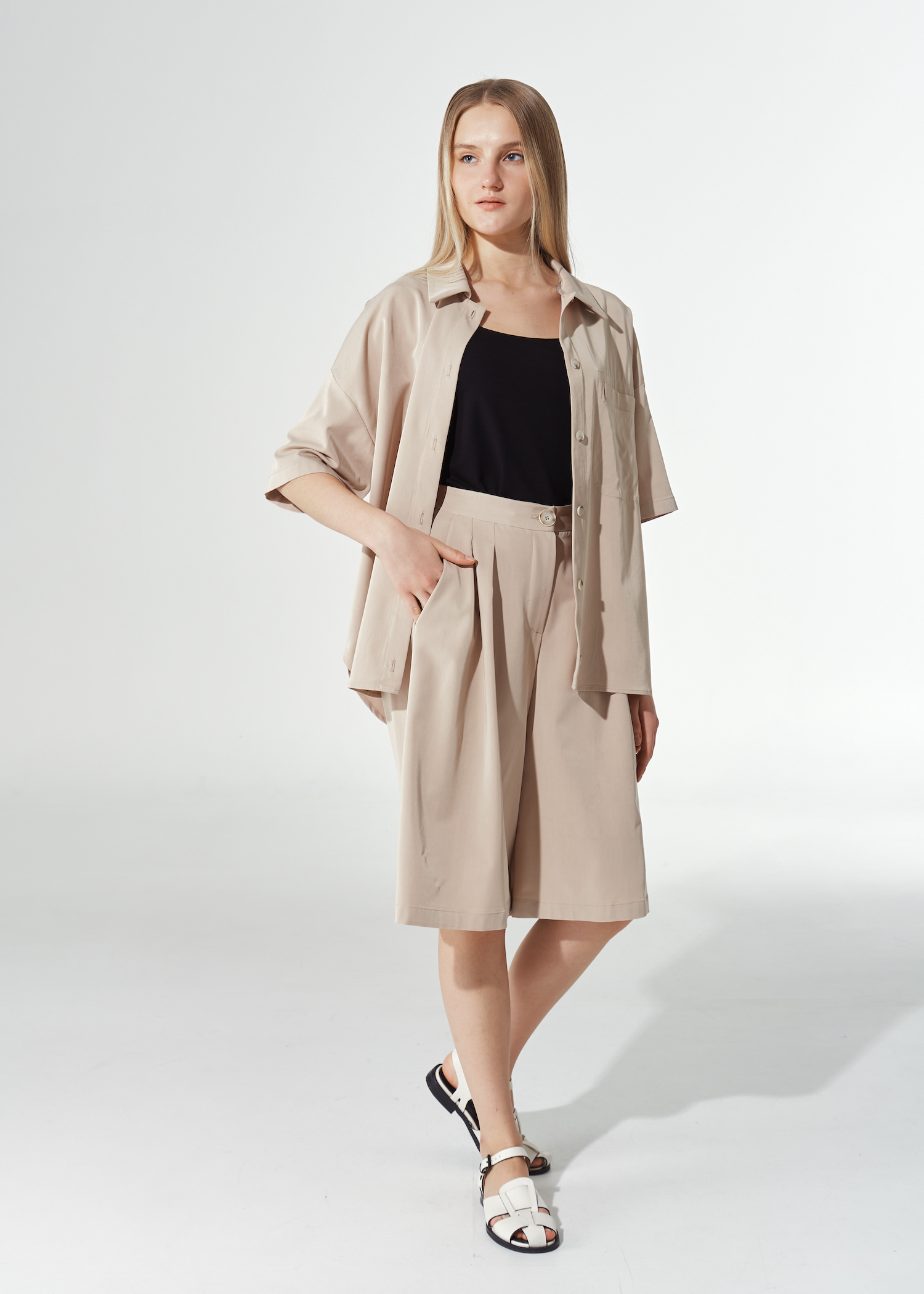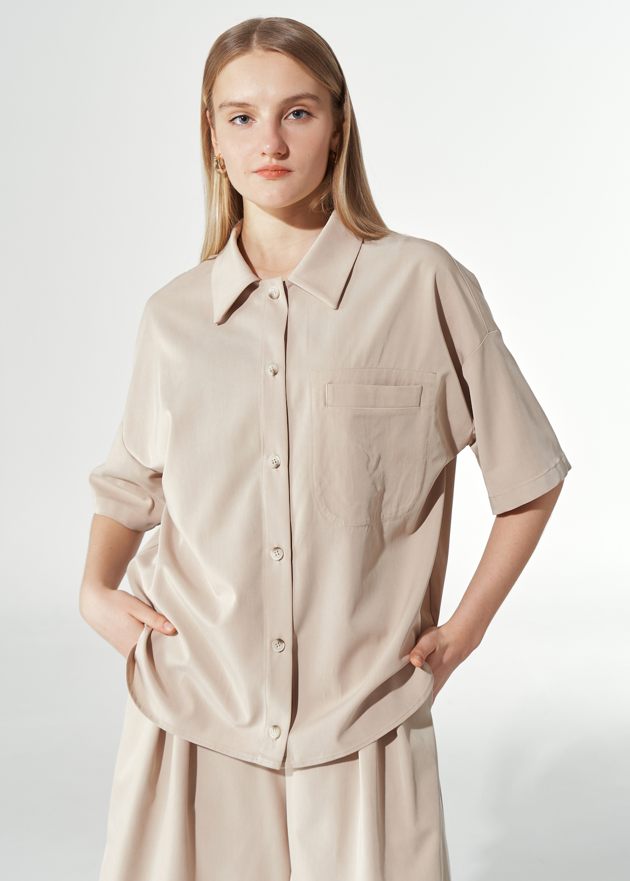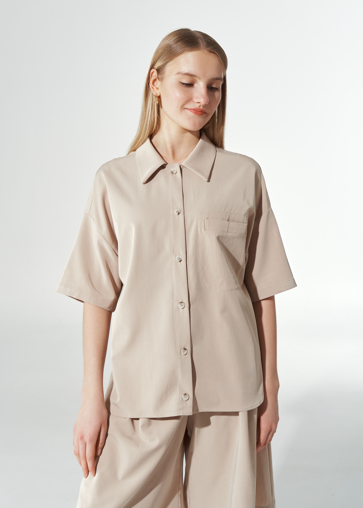 Рубашка бежевая с коротким рукавом и спущенной линией плеча. Модель прямого кроя на пуговках и отложным воротником. Удлинённая спинка с разрезами по бокам и вертикальным швом.