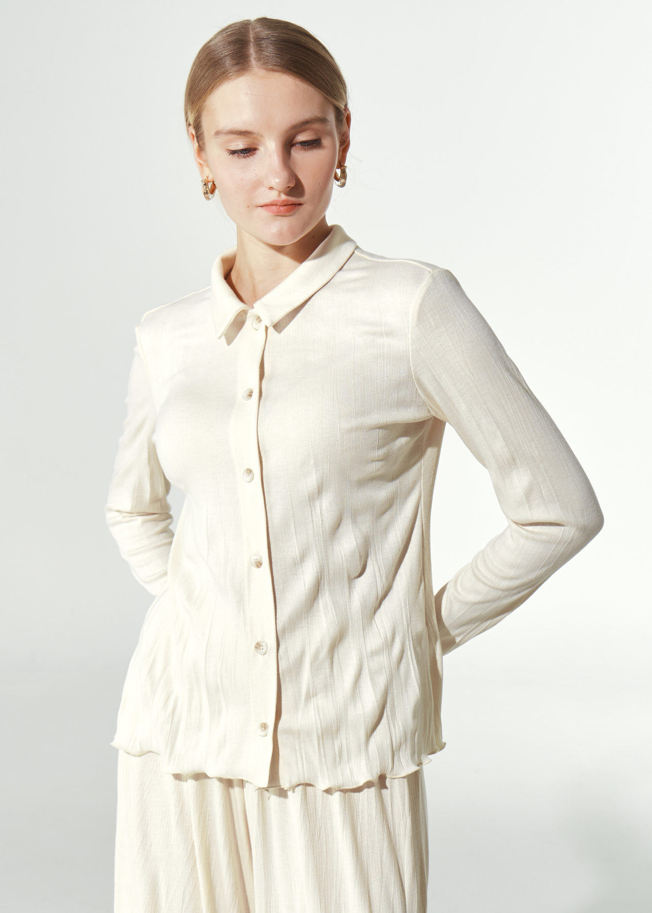 Рубашка трикотажная однотонная до бедра. Приталенная модель на пуговках и отложным воротником. Рукава полной длины без манжет.