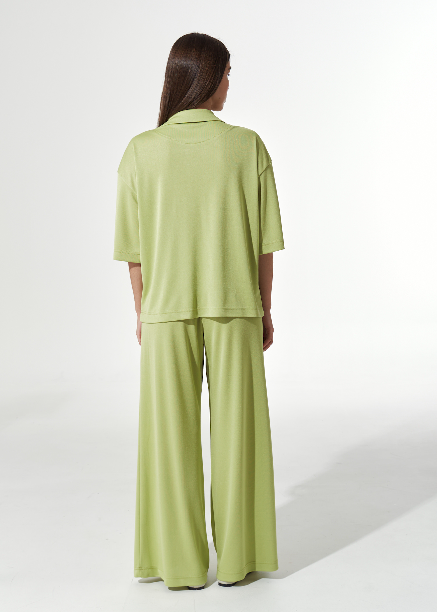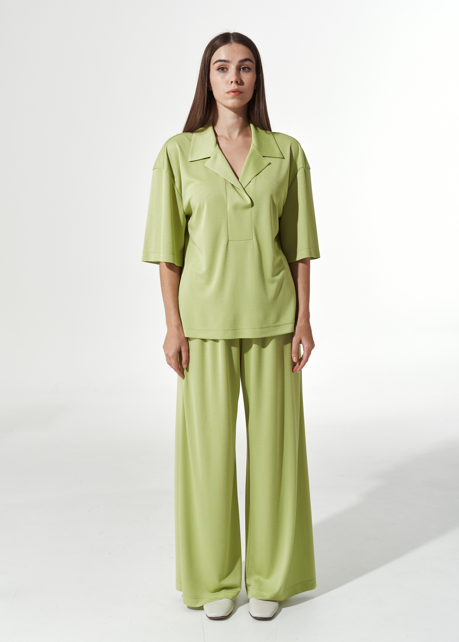 Рубашка поло салатовая прямого кроя. Модель до бедра с отложным воротником и лацканами. Спущенная линия плеча с широкими рукавами до локтя. Без застежек.