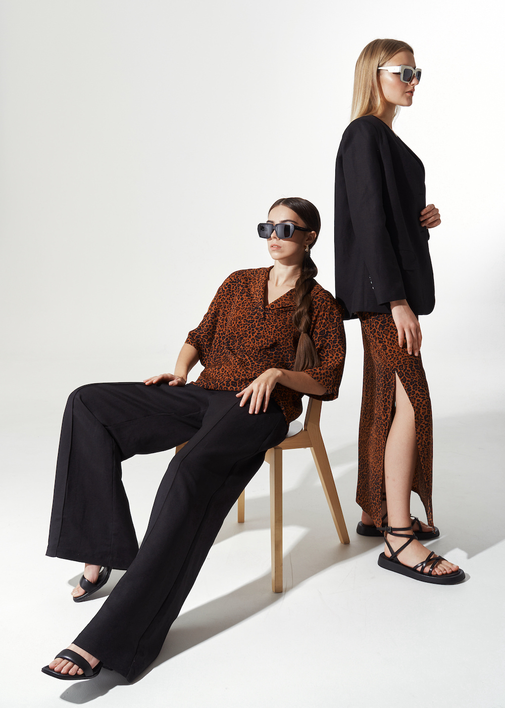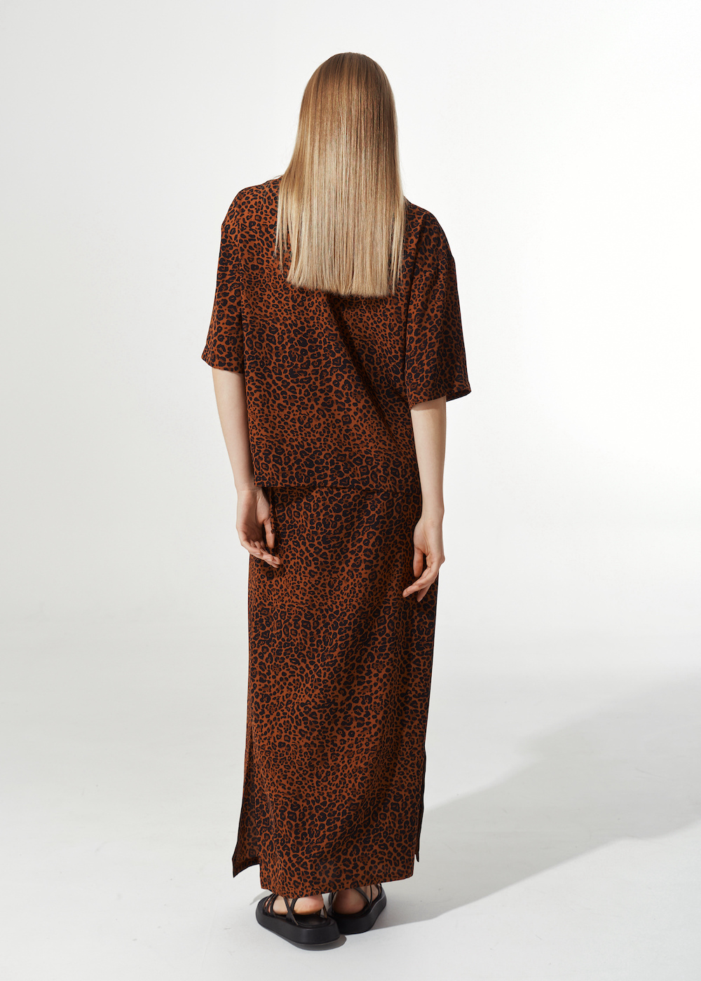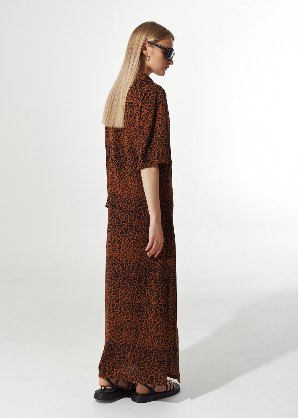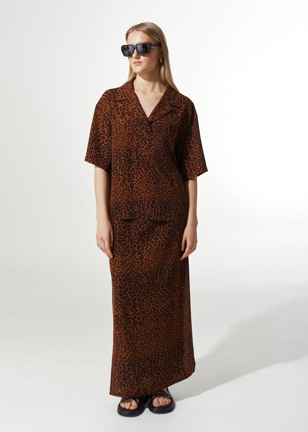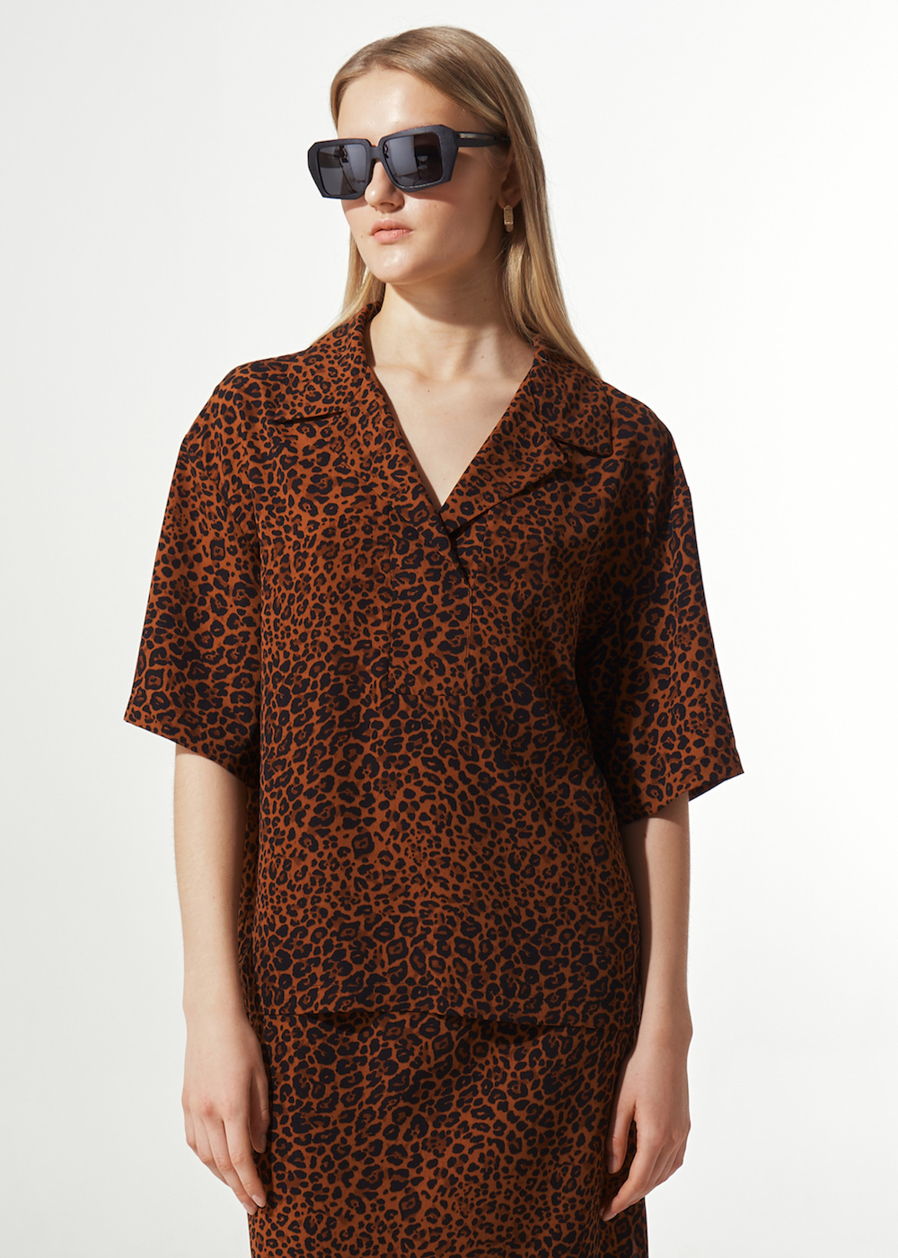 Рубашка поло с принтом animal прямого кроя. Модель до бедра с отложным воротником и лацканами. Спущенная линия плеча с широкими рукавами до локтя. Без застежек.