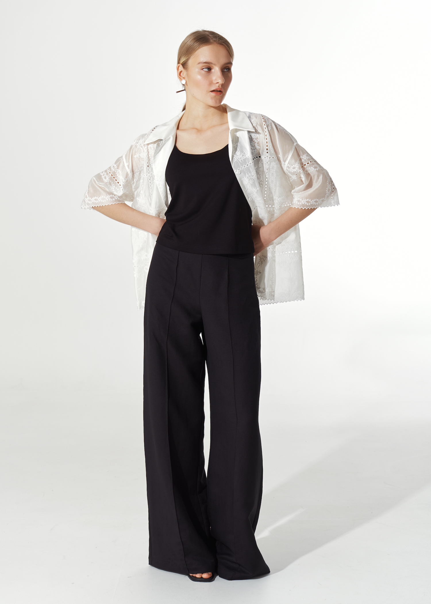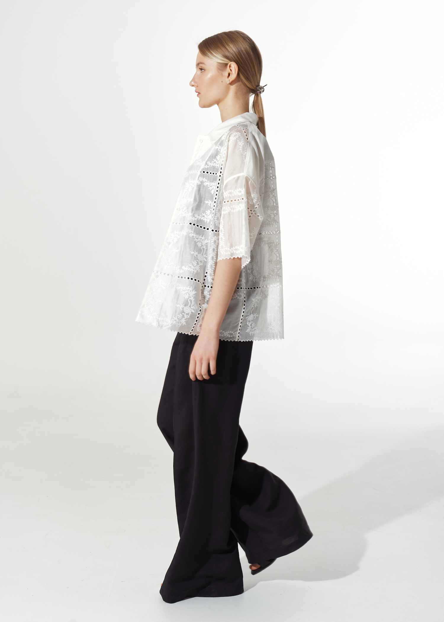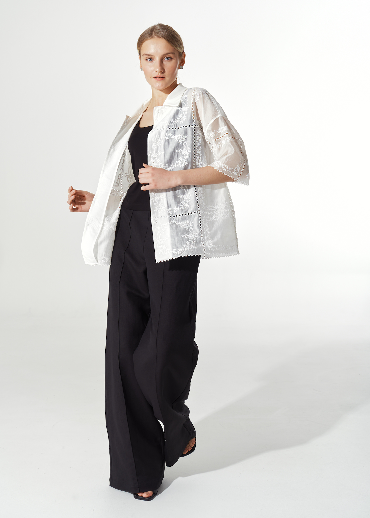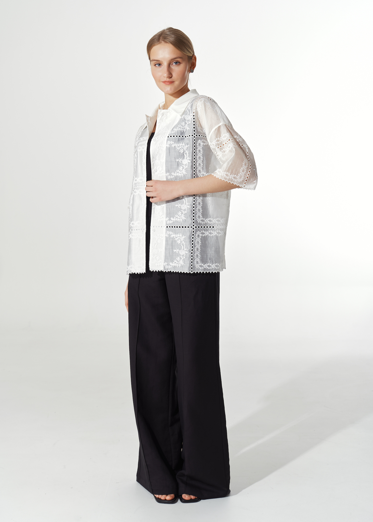 Рубашка белая с перфорацией свободного кроя. Полупрозрачная модель на пуговках и отложным воротником, спущенная линия плеча с широкими рукавами до локтя.