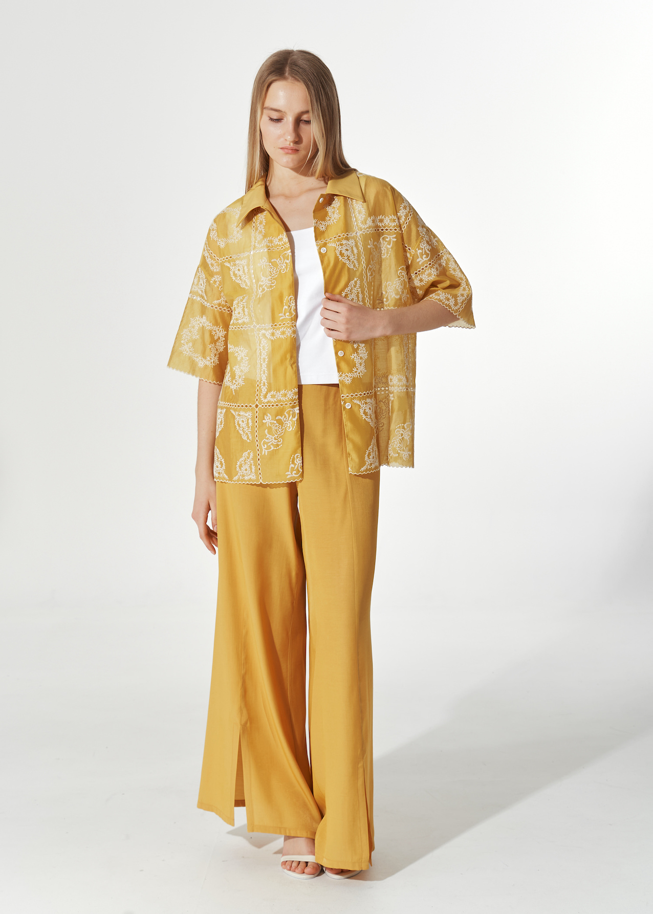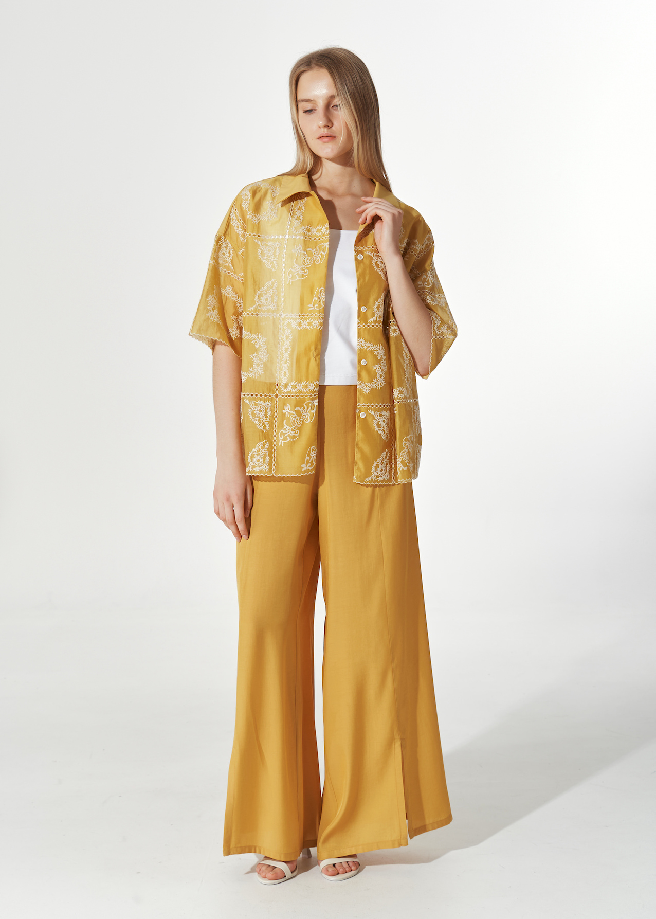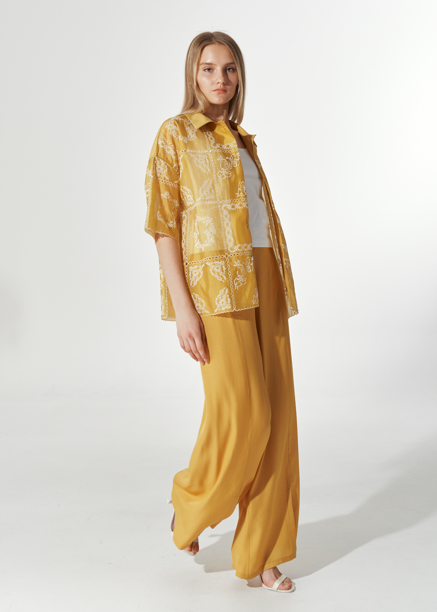 Рубашка горчичная с белым перфорированным узором. Полупрозрачная свободная модель на пуговках и отложным воротником. Спущенная линия плеча с широкими рукавами до локтя.