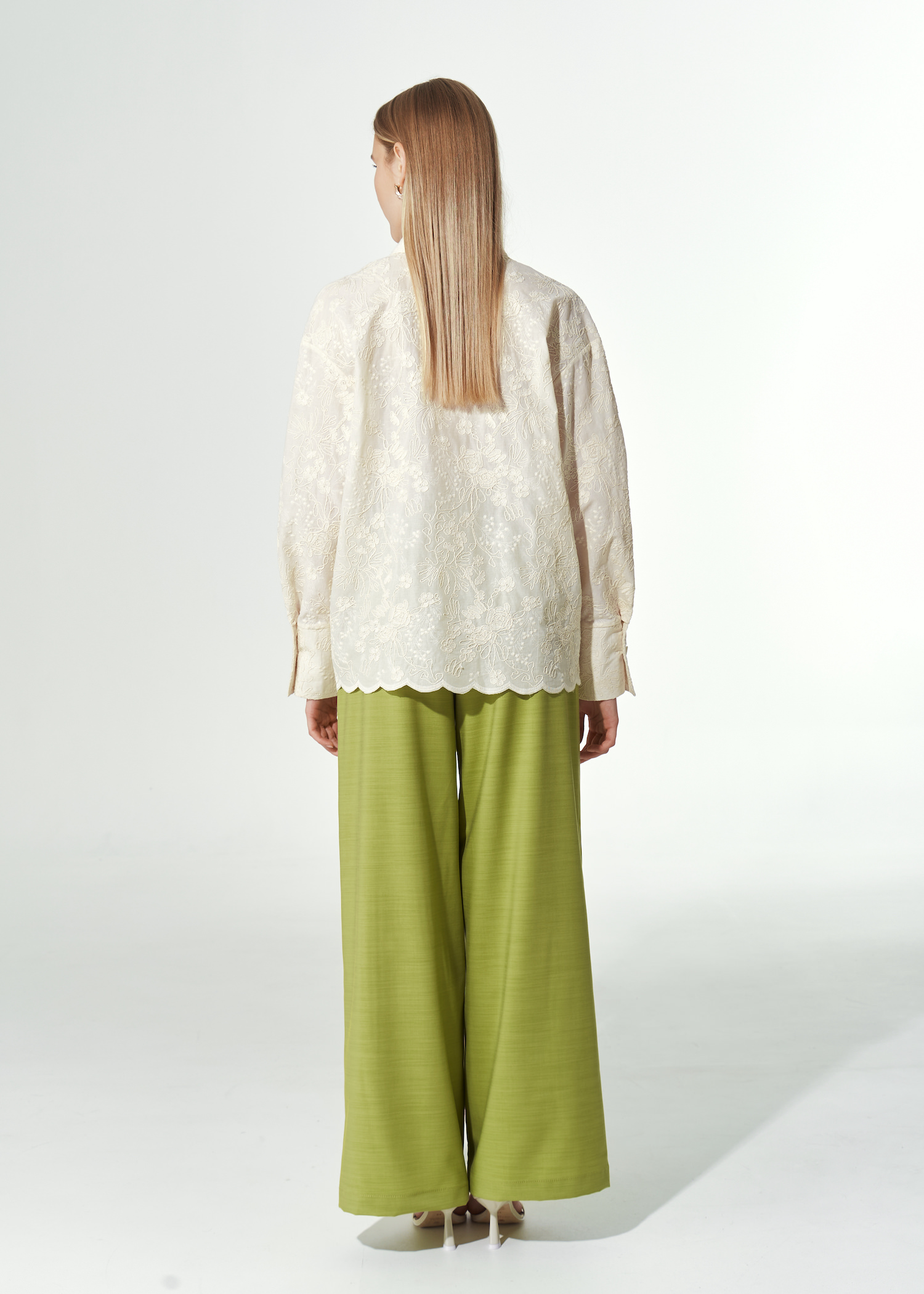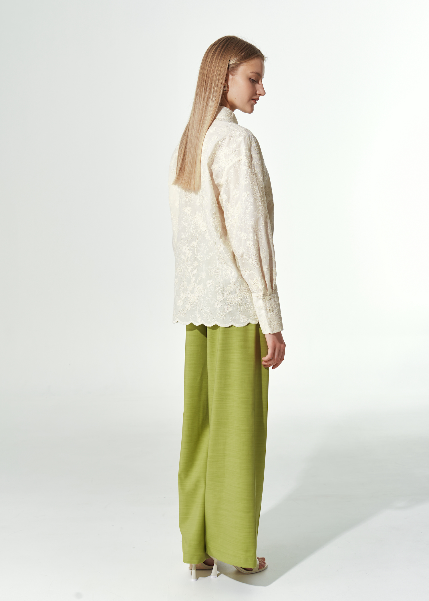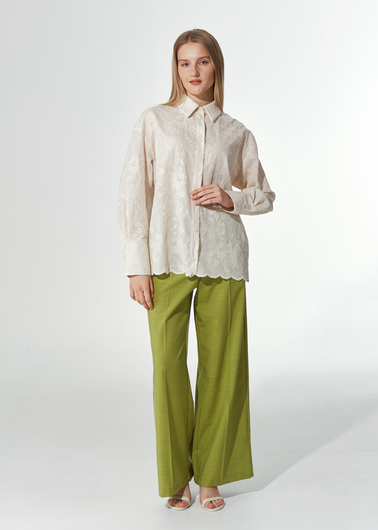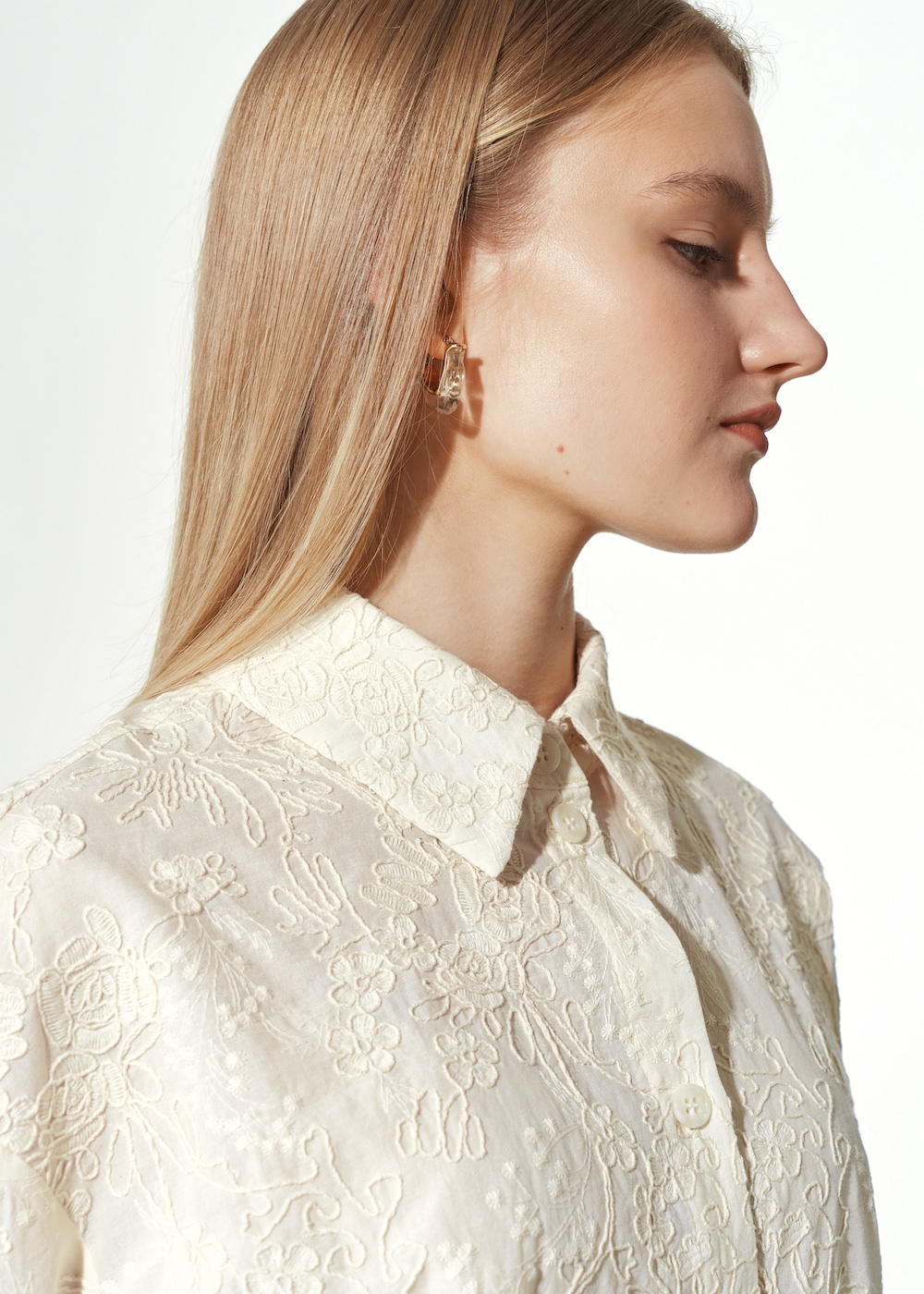 Рубашка бежевая женская с узором в тон изделия. Полуприталенная модель до бедра с волнистым краем. Рубашка на пуговках и отложным воротником. Спущенная линия плеча с рукавами полной длины и широкими манжетами.
