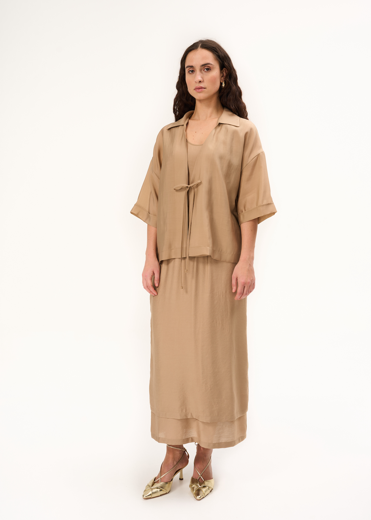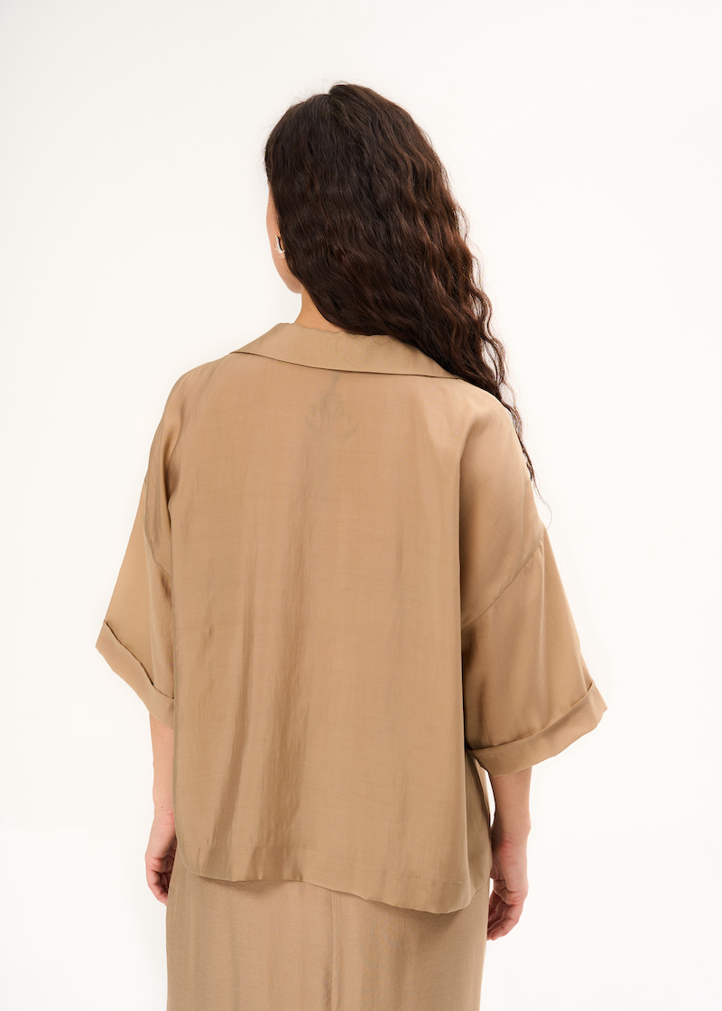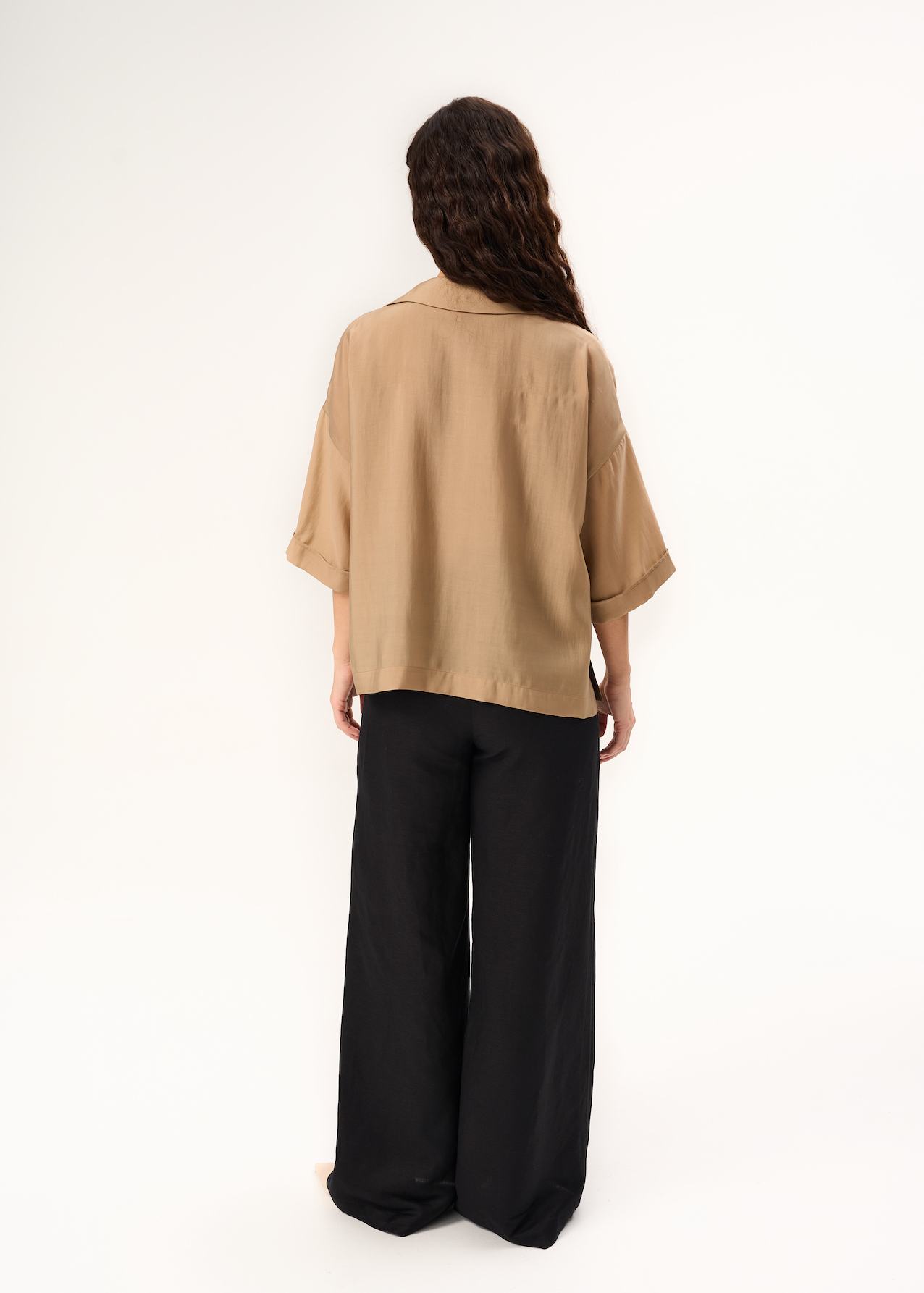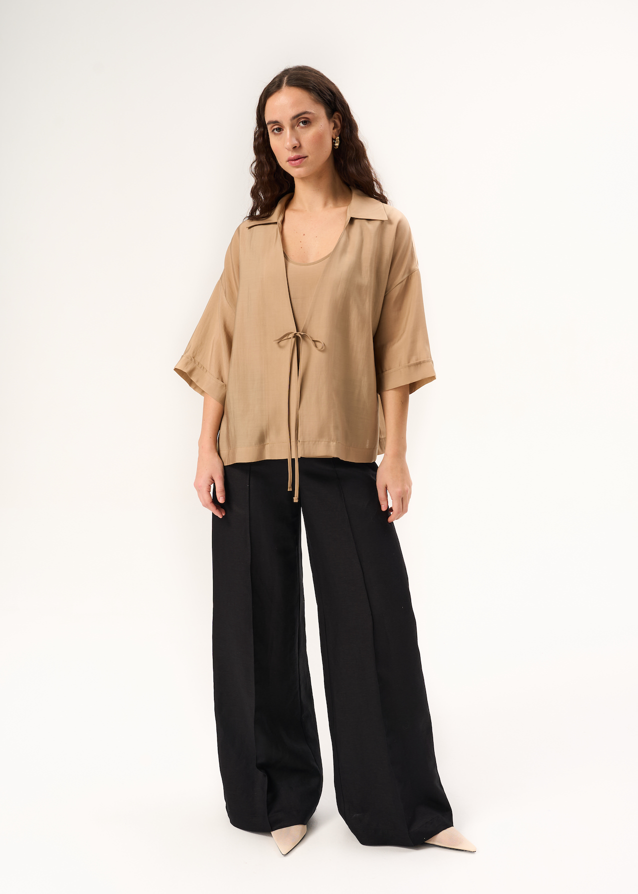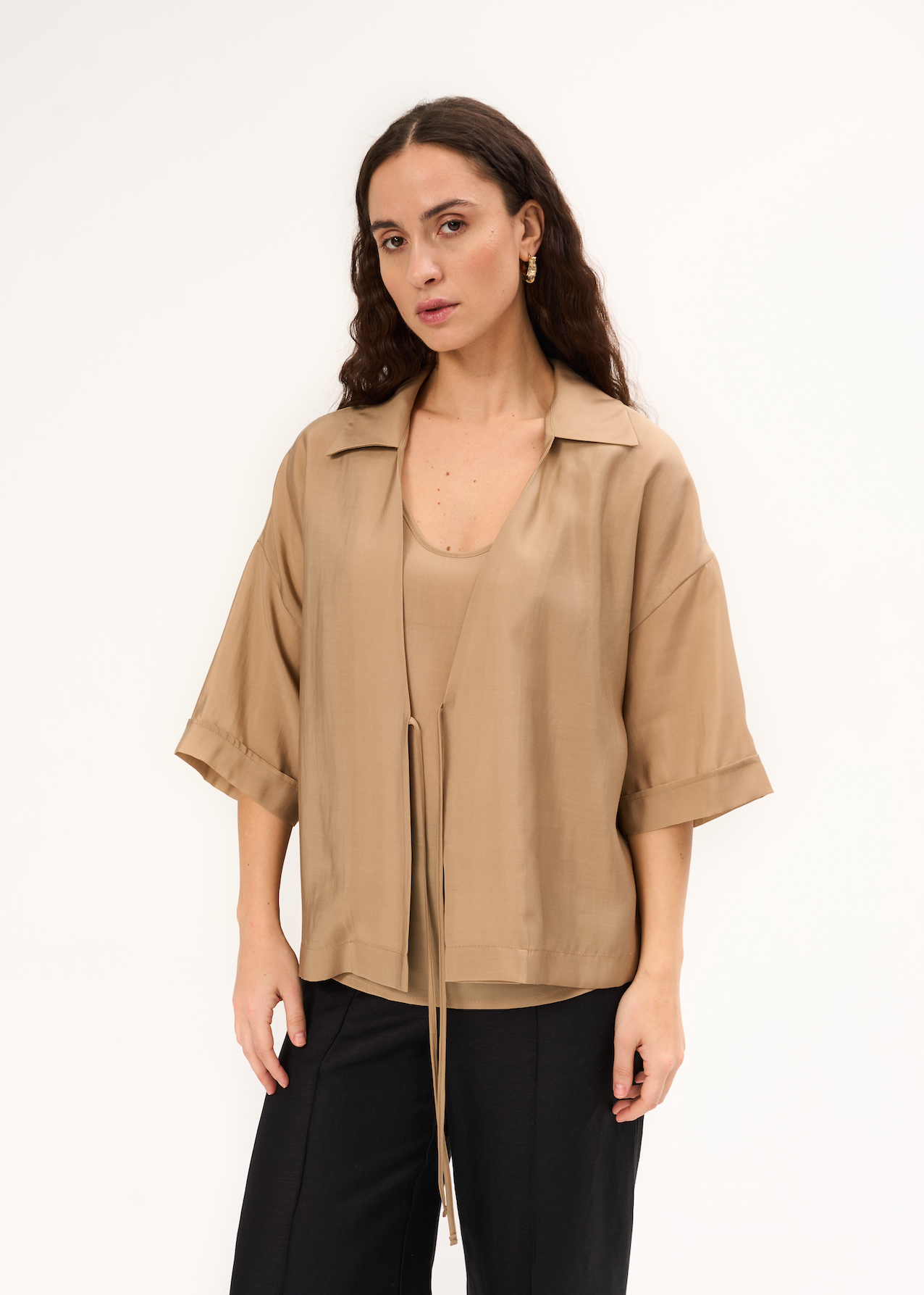 Рубашка легкая на завязках. Свободная полупрозрачная модель с отложным воротником, спущенной линией плеча и широкими рукавами до локтя.