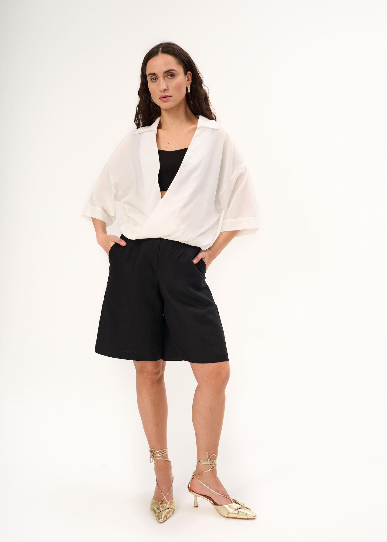 Шорты бермуды на высокой посадке. Застежка на пуговку и молнию, пояс с шлевками под ремень.