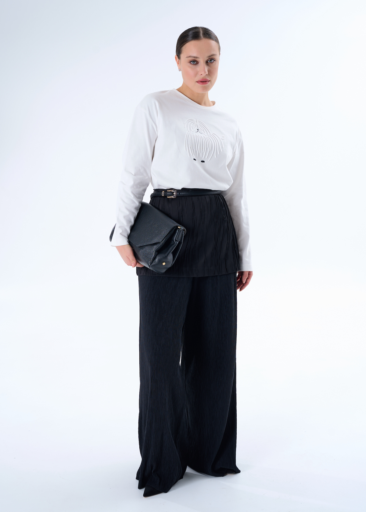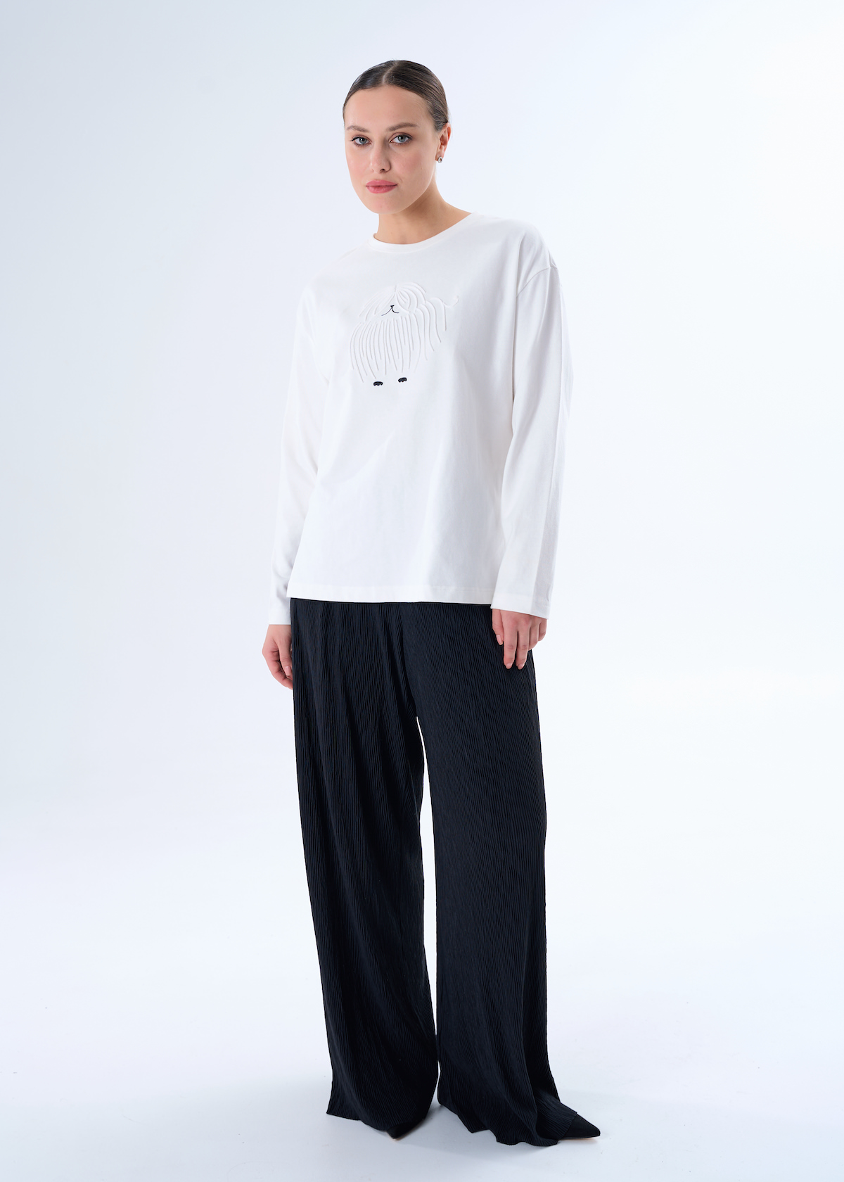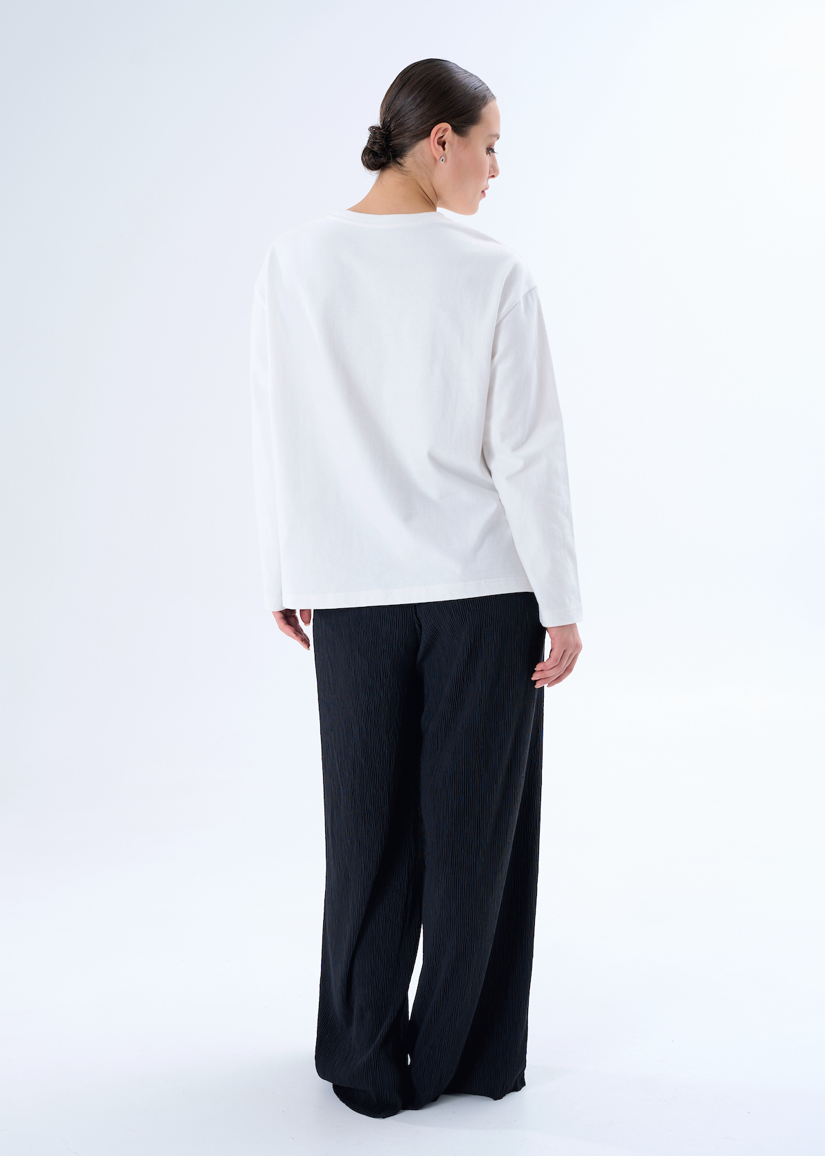 Лонгслив белый хлопковый. Модель прямого кроя с круглым вырезом со спущенной линией плеча и длинным рукавом без манжет. Лонгслив с принтом в тон изделия. Без застежек.