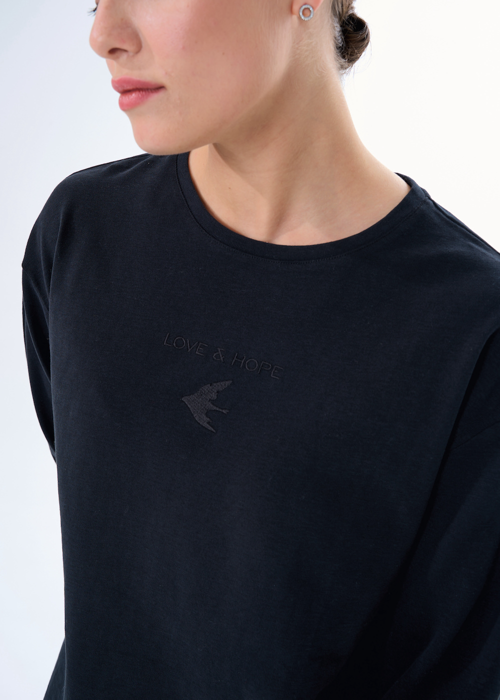 Черный базовый лонгслив. Модель прямого кроя с круглым вырезом со спущенной линией плеча и длинным рукавом без манжет. Лонгслив с принтом в тон изделия. Без застежек.
