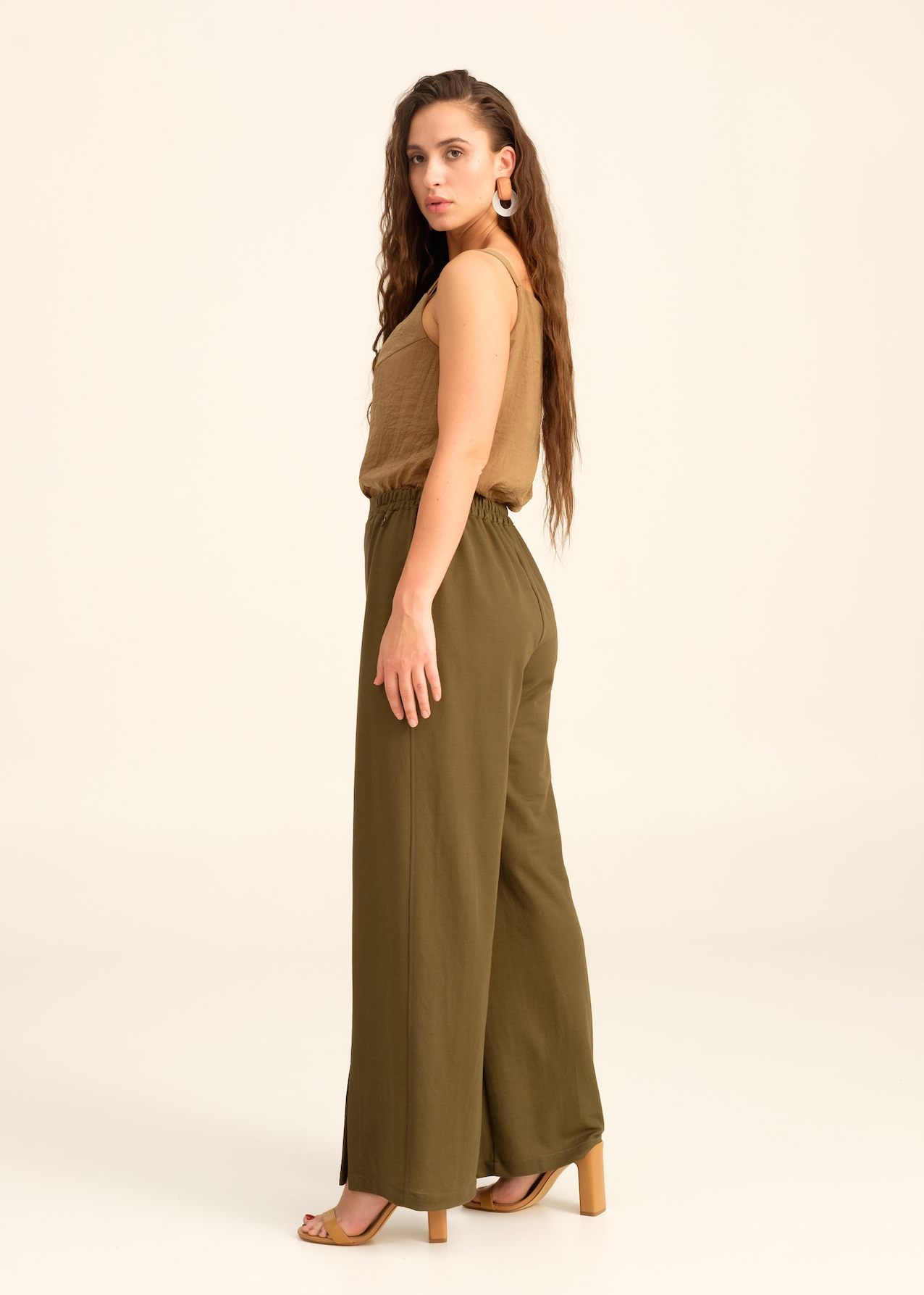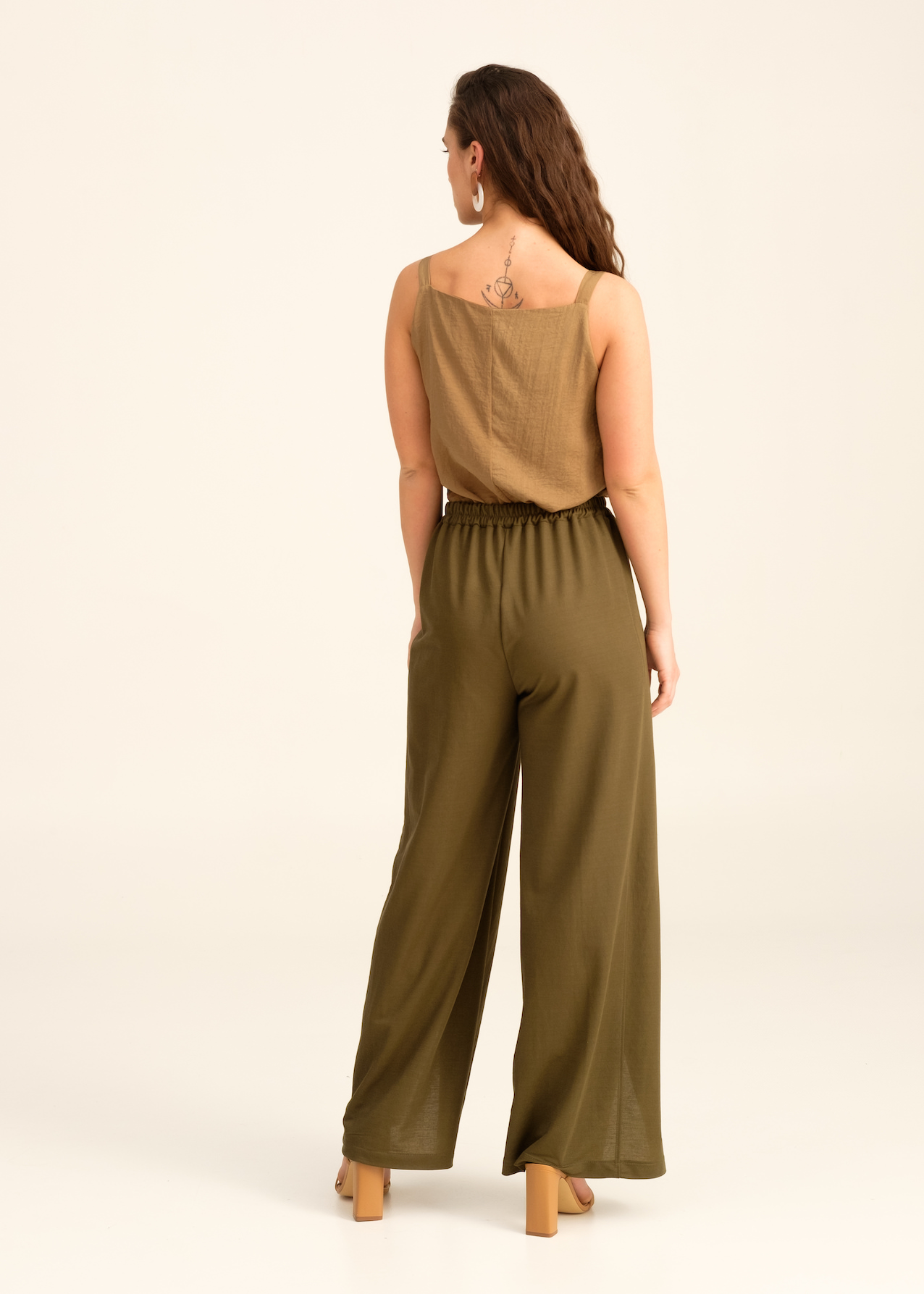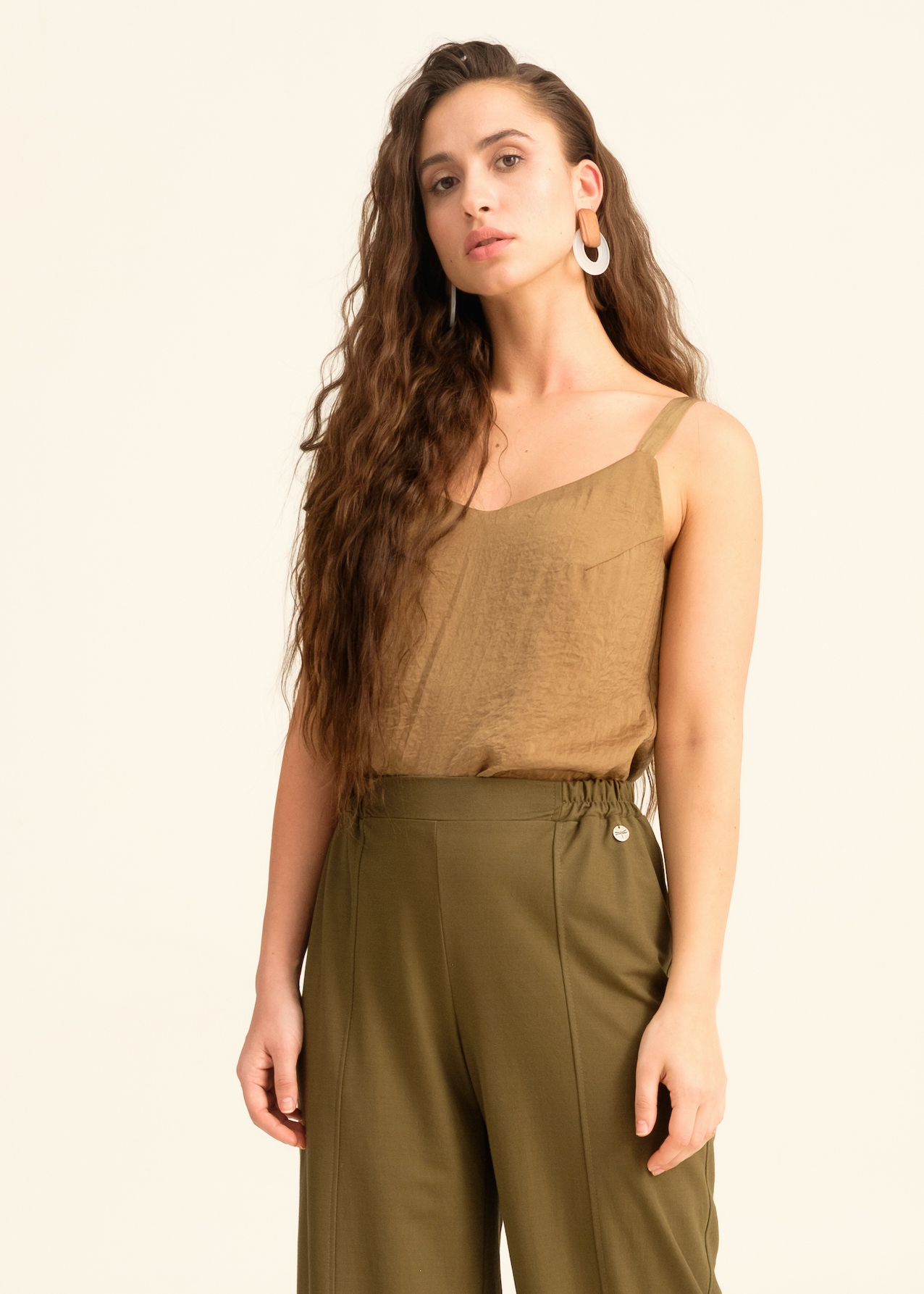 Топ хаки на бретелях с шелком в составе. Мягкая струящаяся ткань с легким жатым эффектом и деликатным сатиновым отблеском.